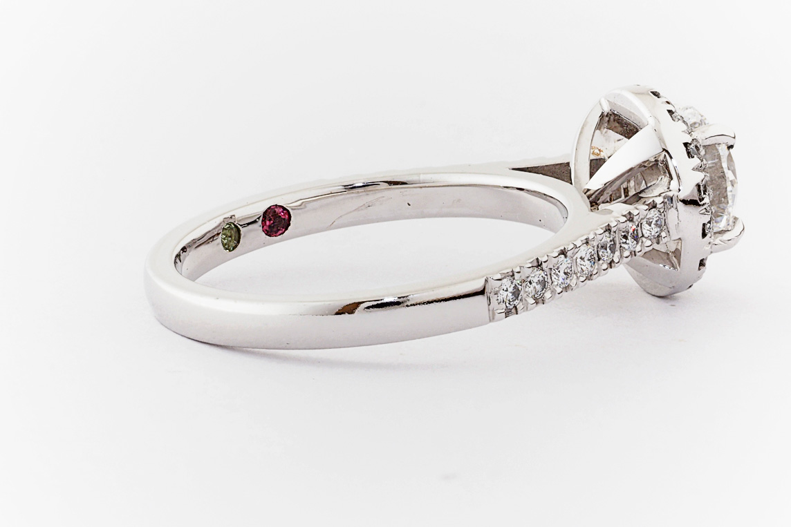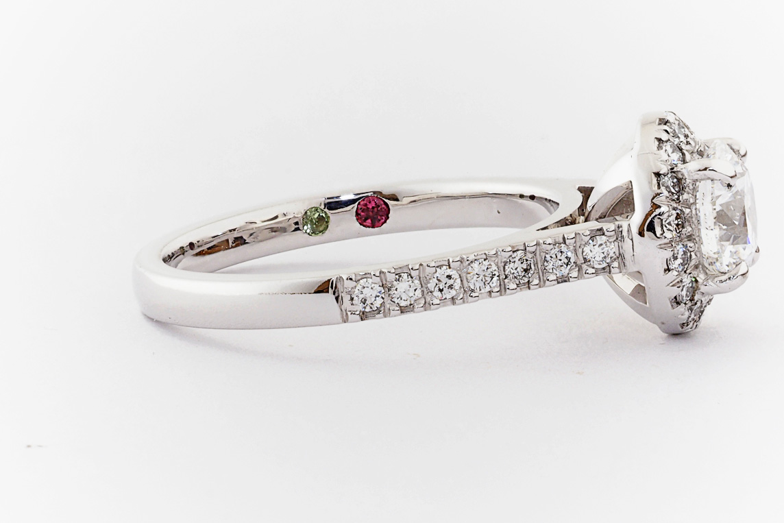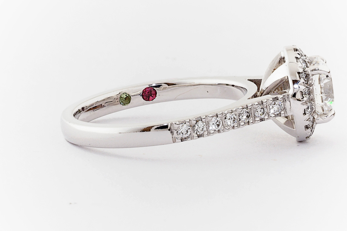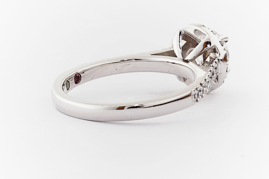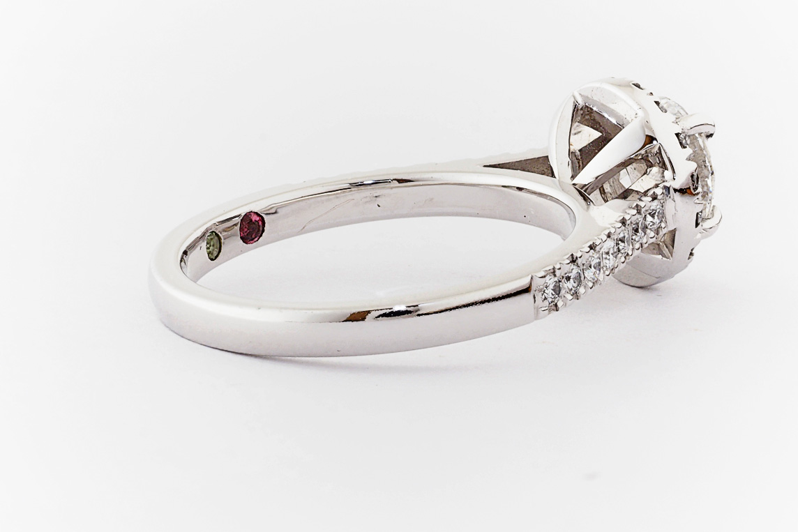 SKU: 21674 Category: Custom Engagement Rings Tags: 0.01ct, 1.0ct, 4 claw setting, halo, periot, pressure set, split shared claw, tourmaline