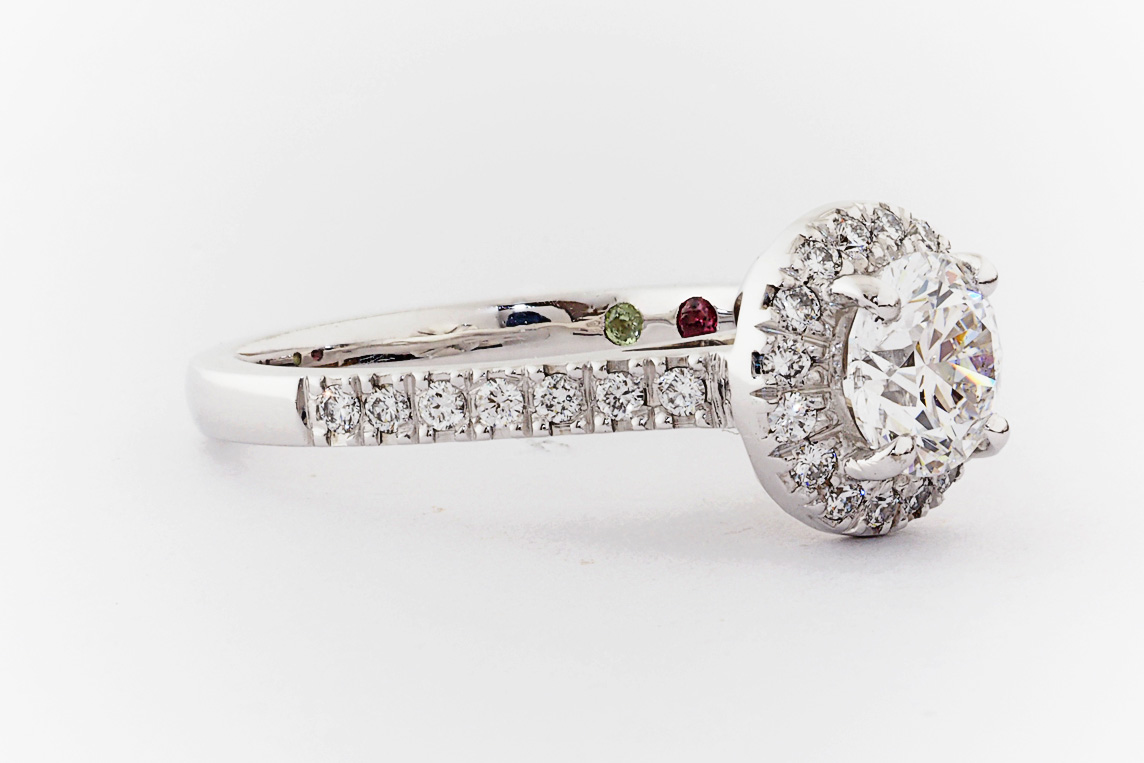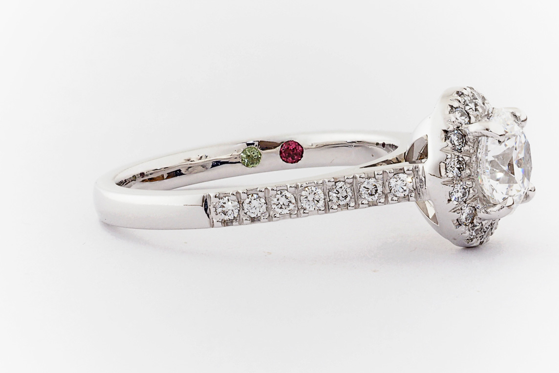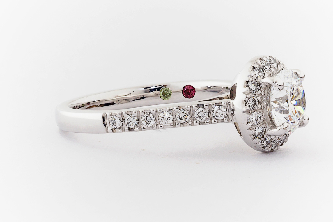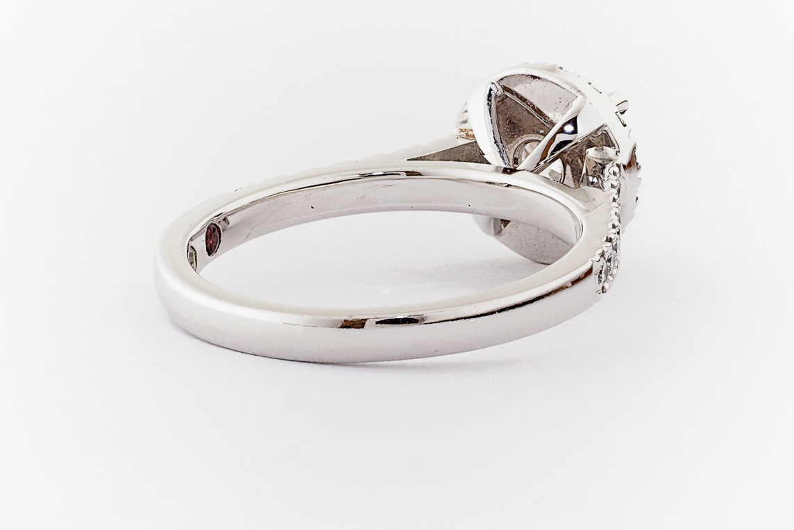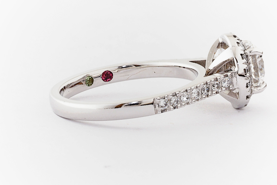 SKU: 21674 Category: Custom Engagement Rings Tags: 0.01ct, 1.0ct, 4 claw setting, halo, periot, pressure set, split shared claw, tourmaline