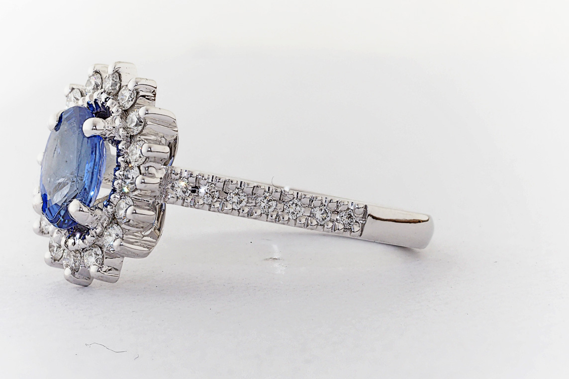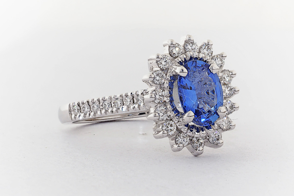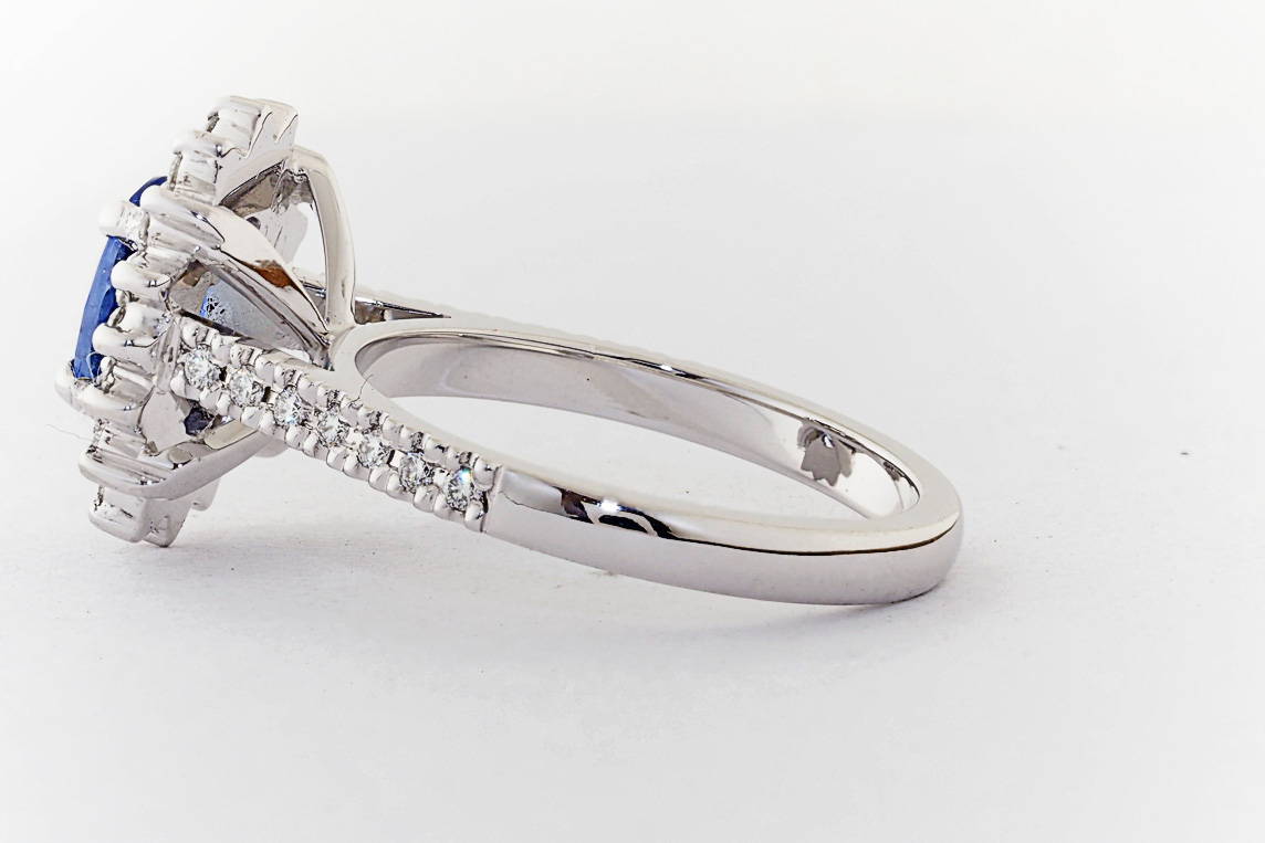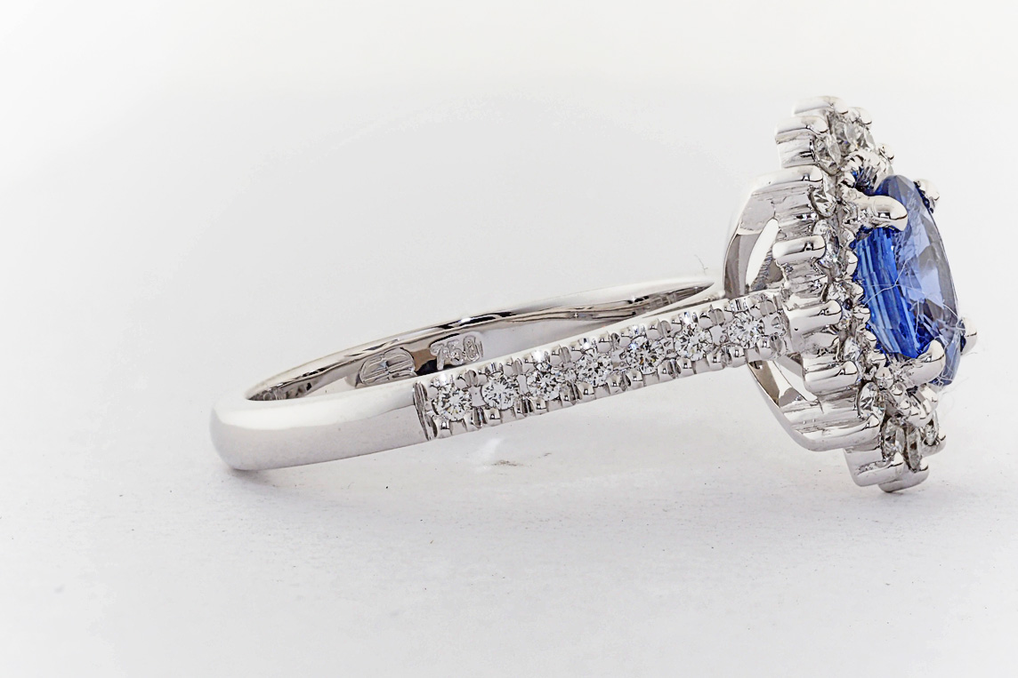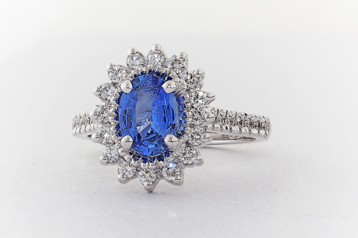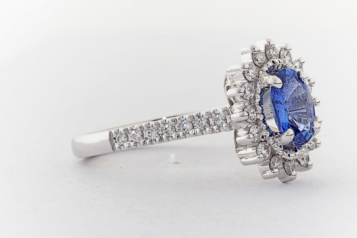 Oval Ceylon Sapphire and diamond halo engagement ring