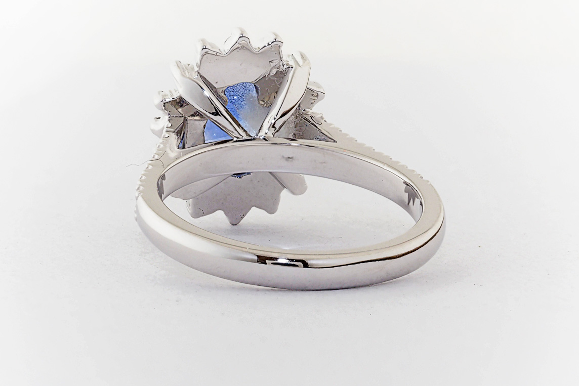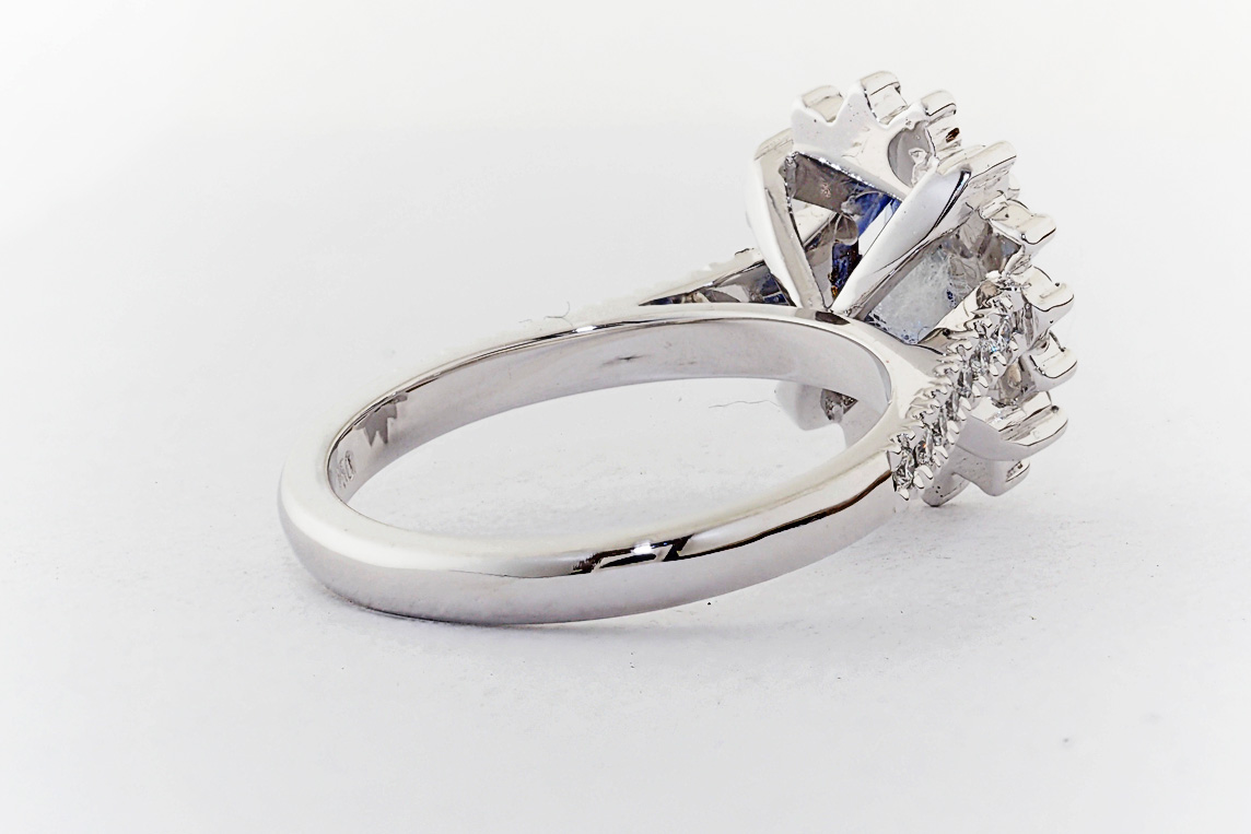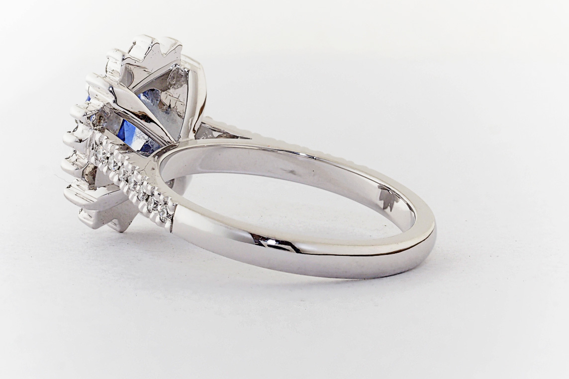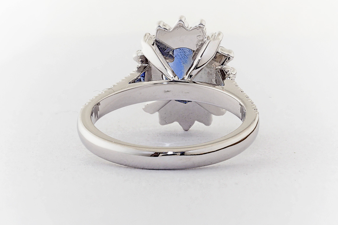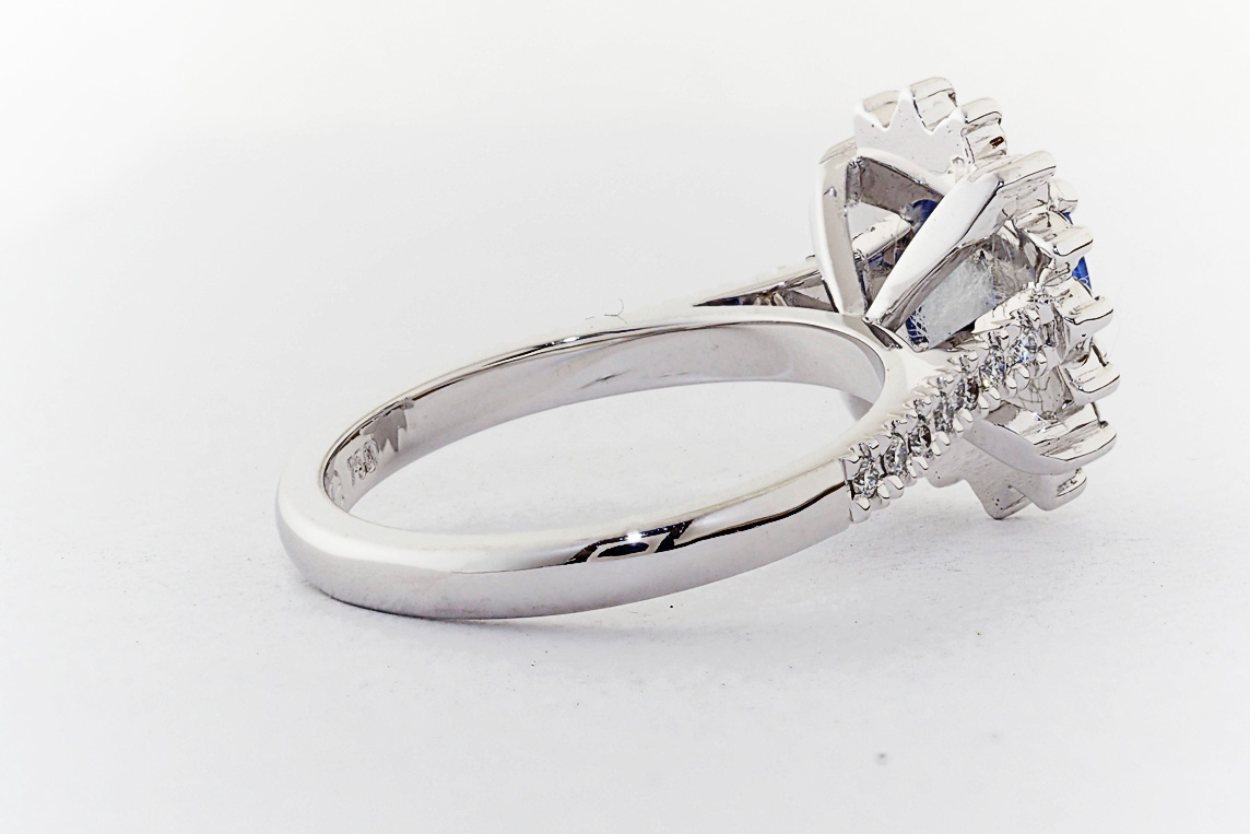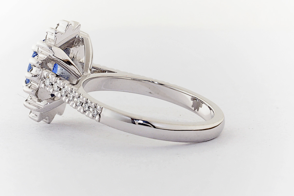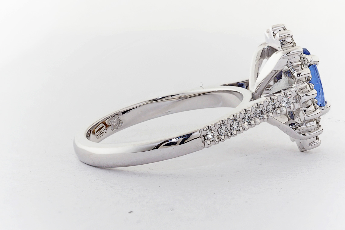 Oval Ceylon Sapphire and diamond halo engagement ring