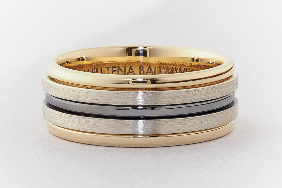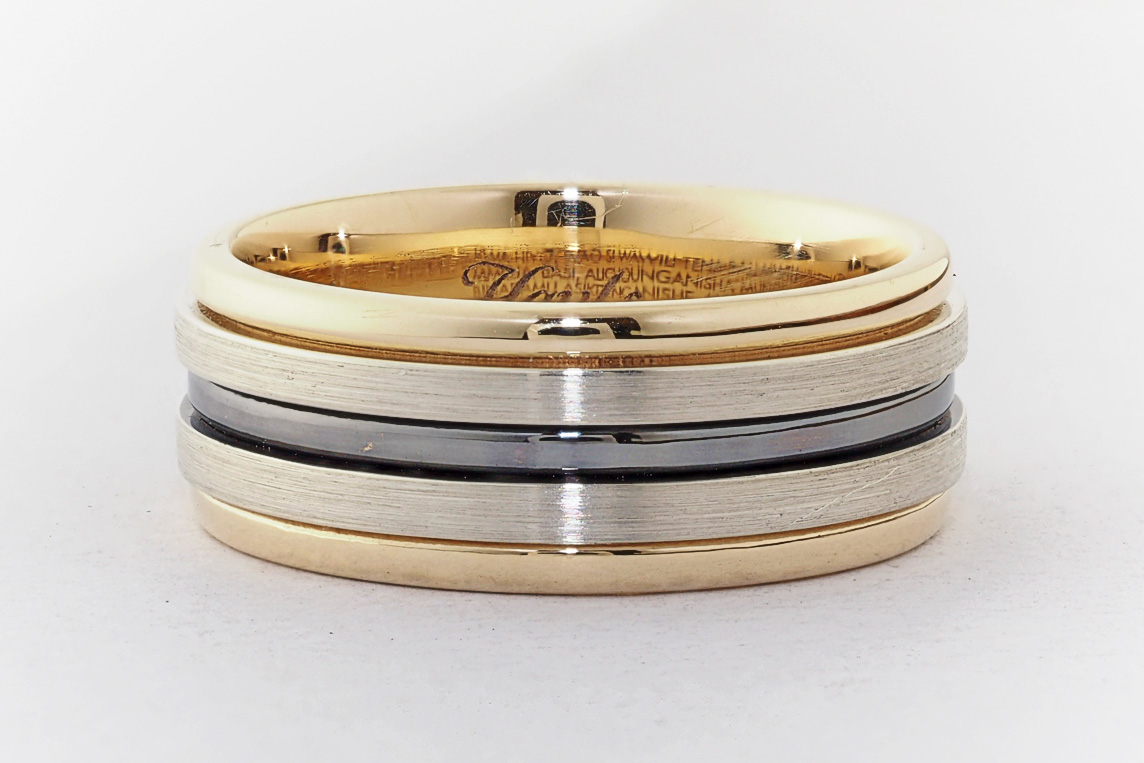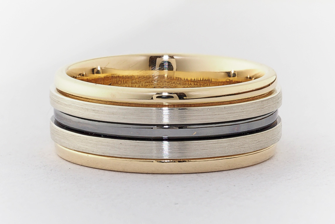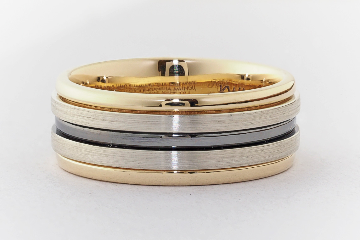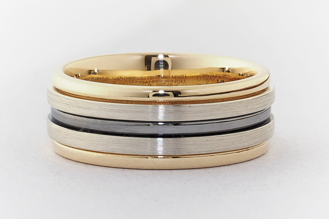 Men’s yellow and white gold wedding ring with ruthenium groove