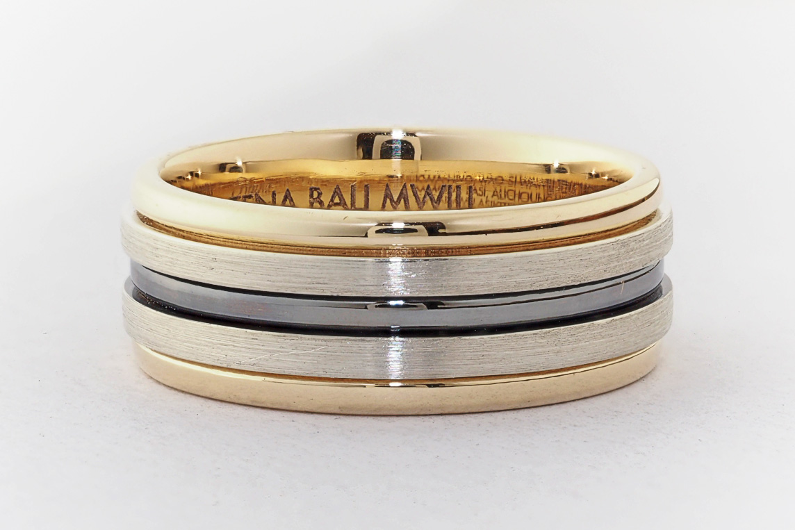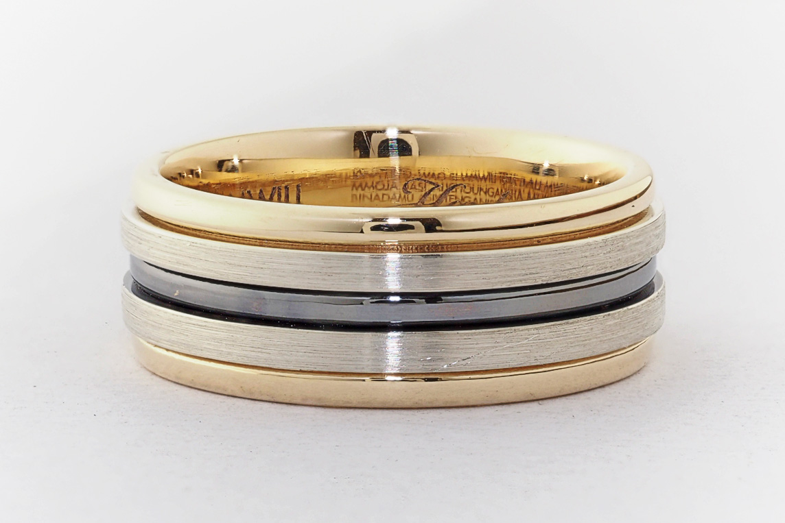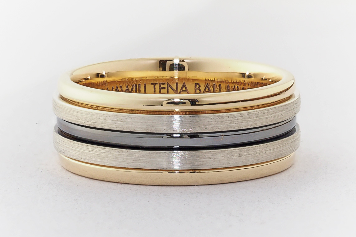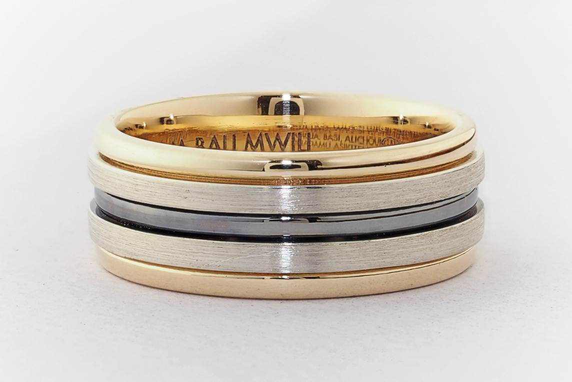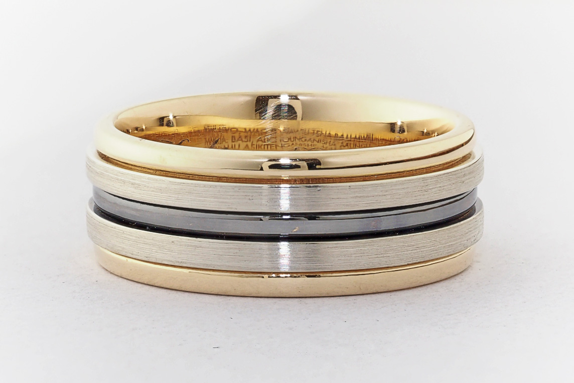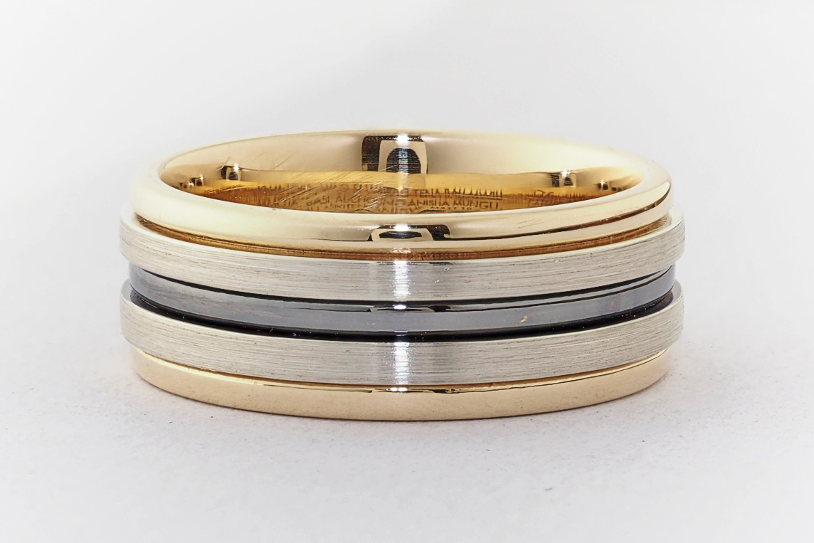 Men’s yellow and white gold wedding ring with ruthenium groove