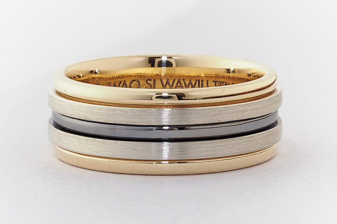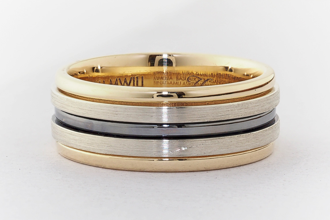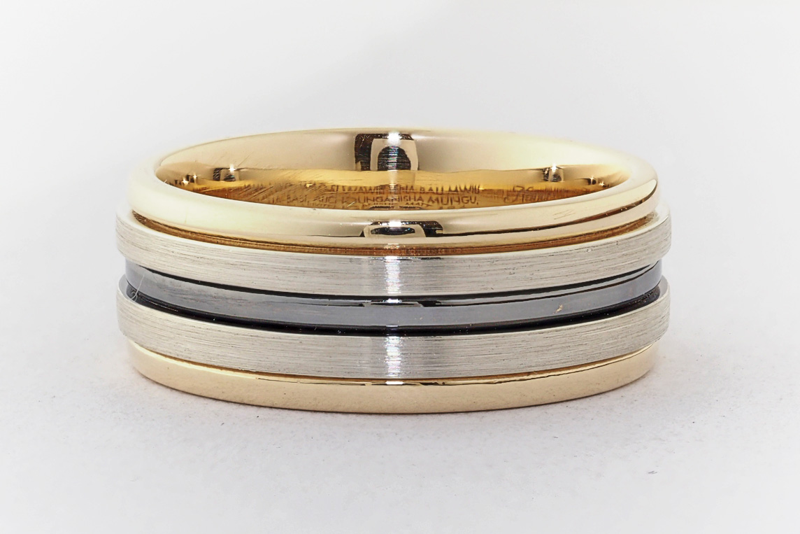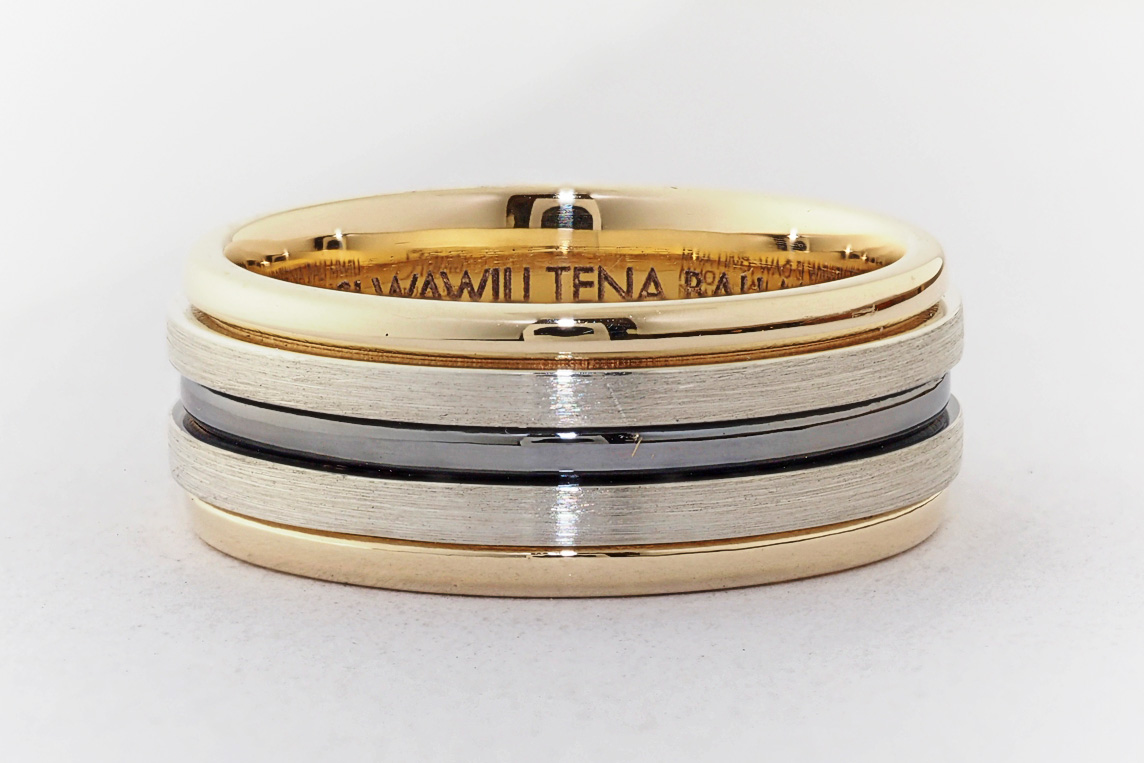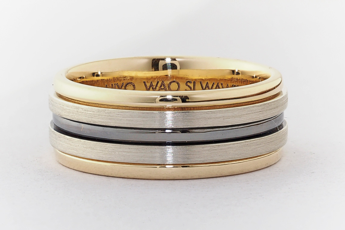 Men’s yellow and white gold wedding ring with ruthenium groove