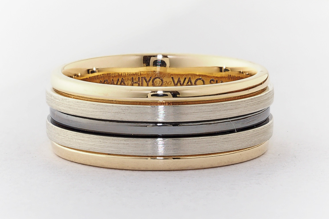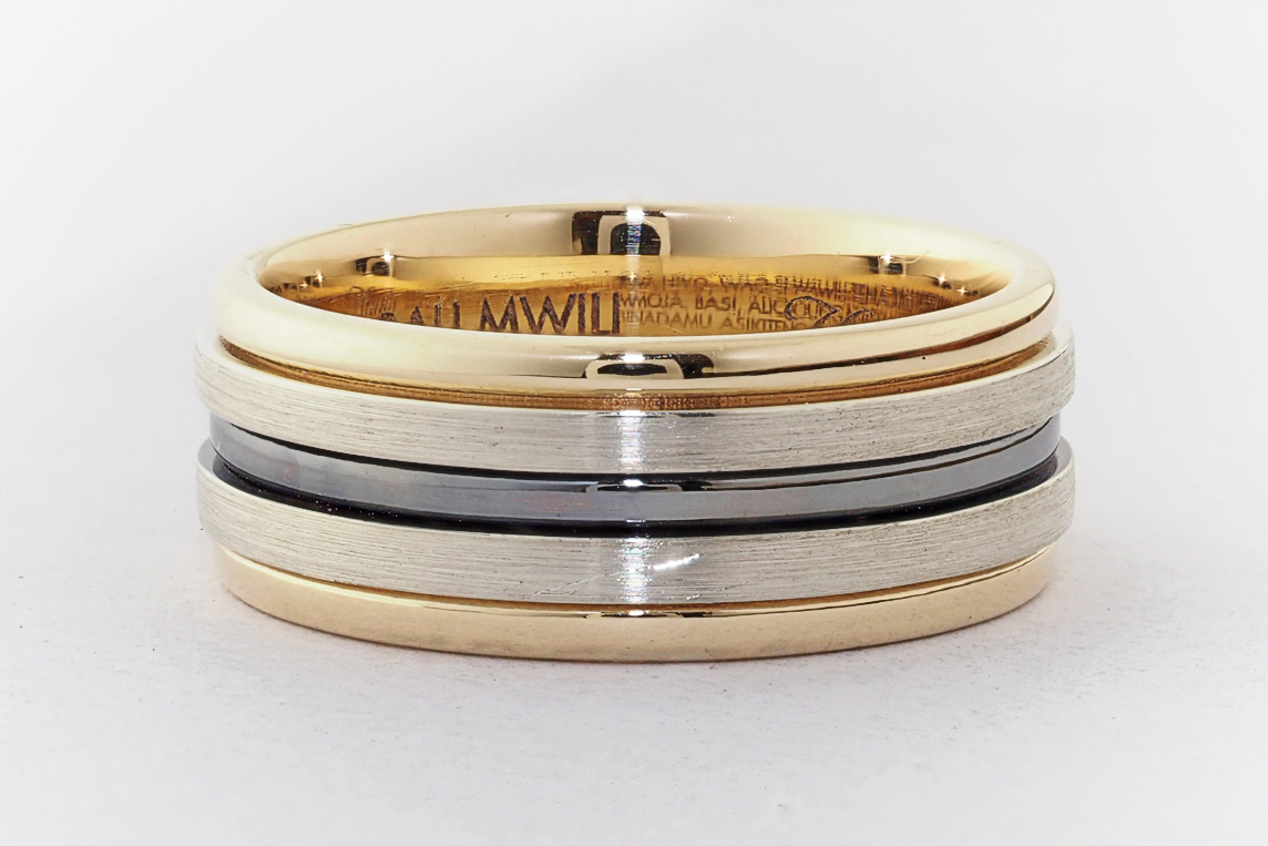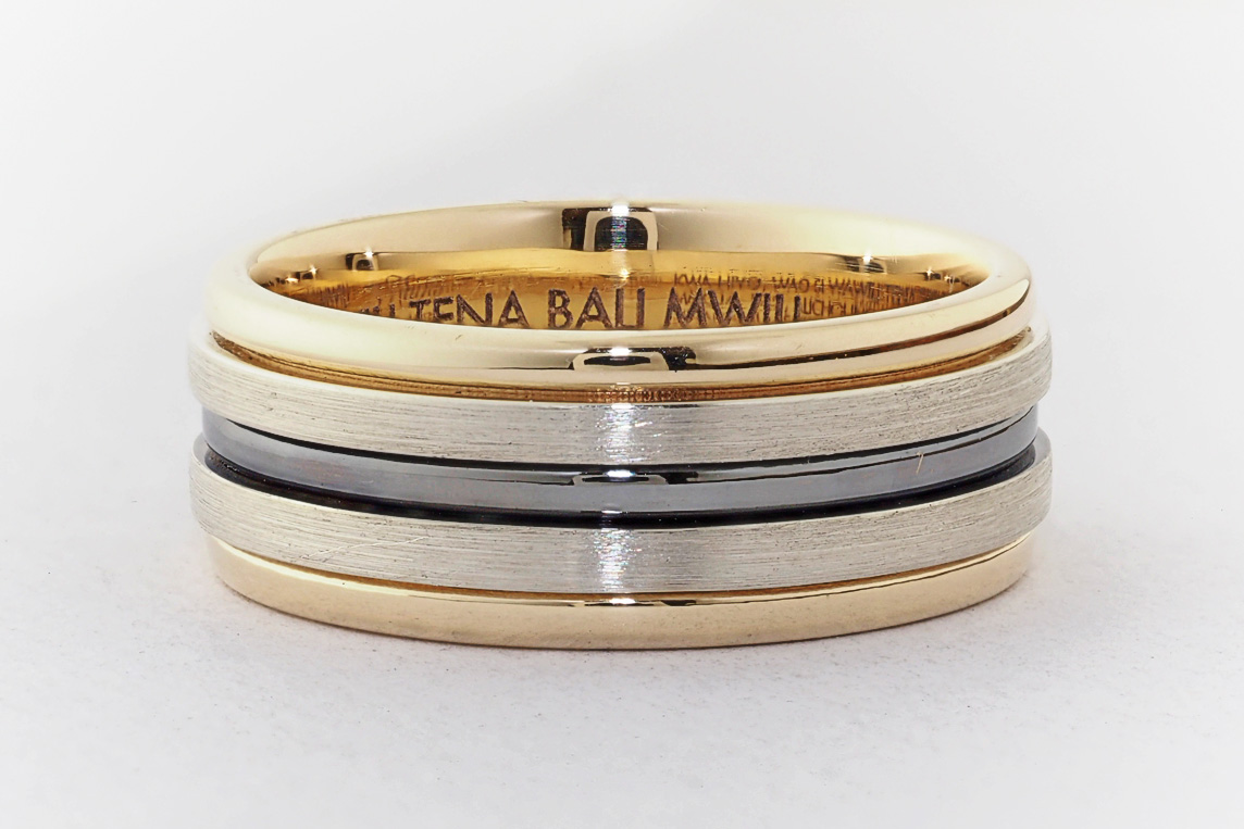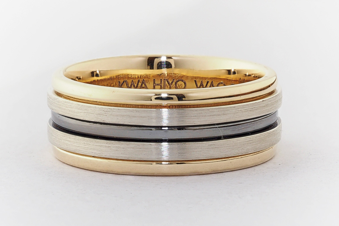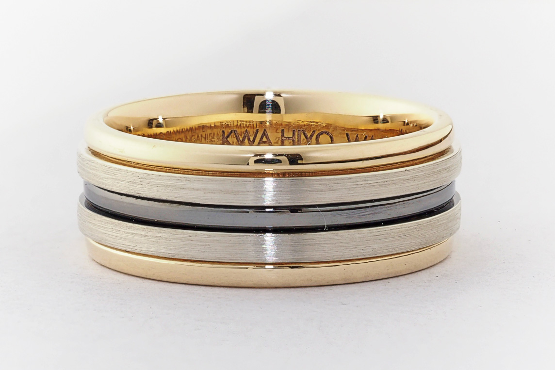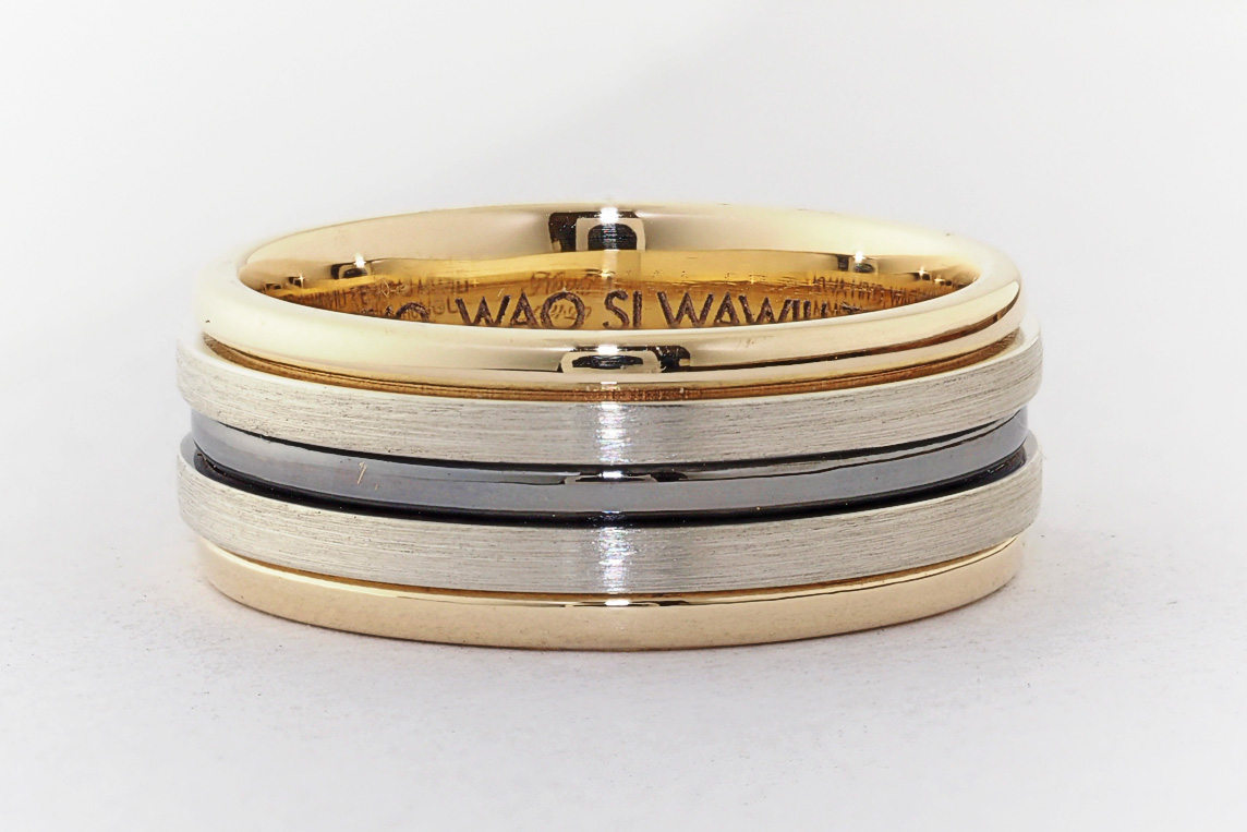 Men’s yellow and white gold wedding ring with ruthenium groove