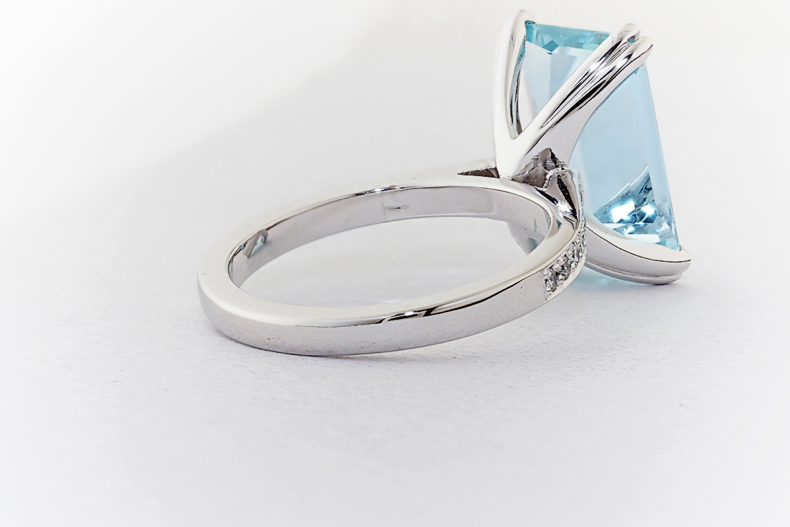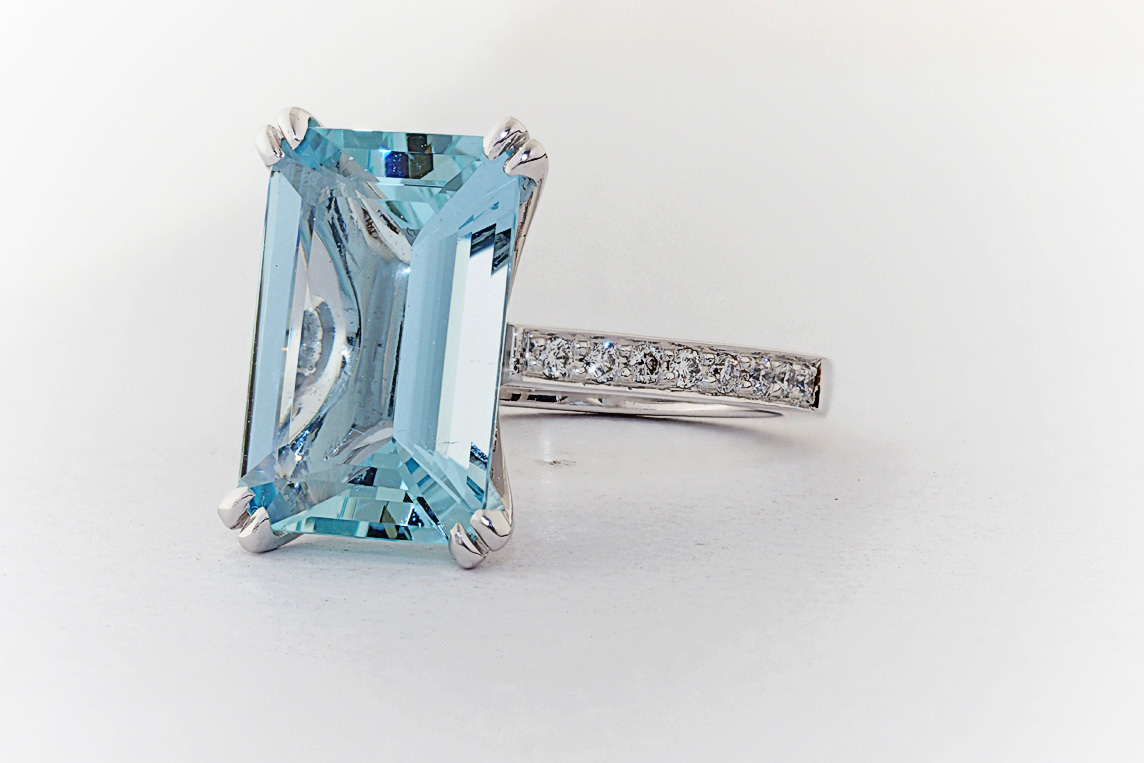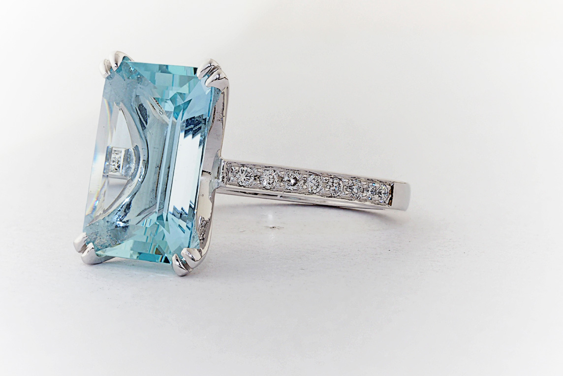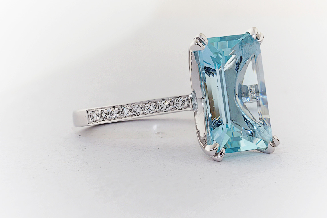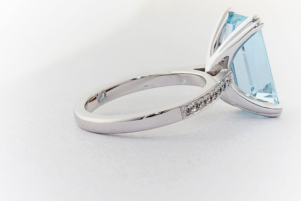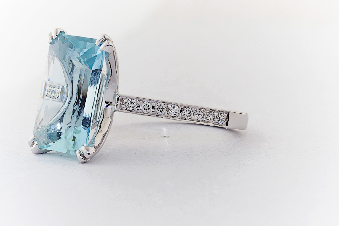 Handmade emerald cut aquamarine and diamond ring