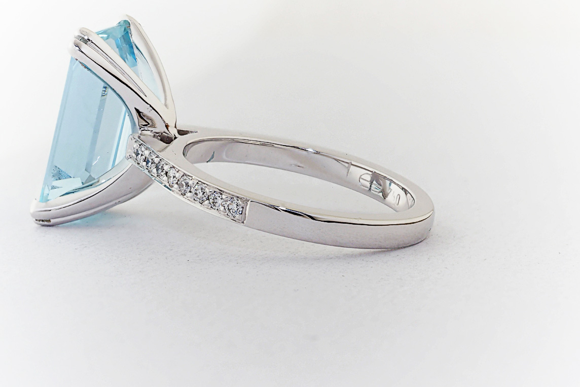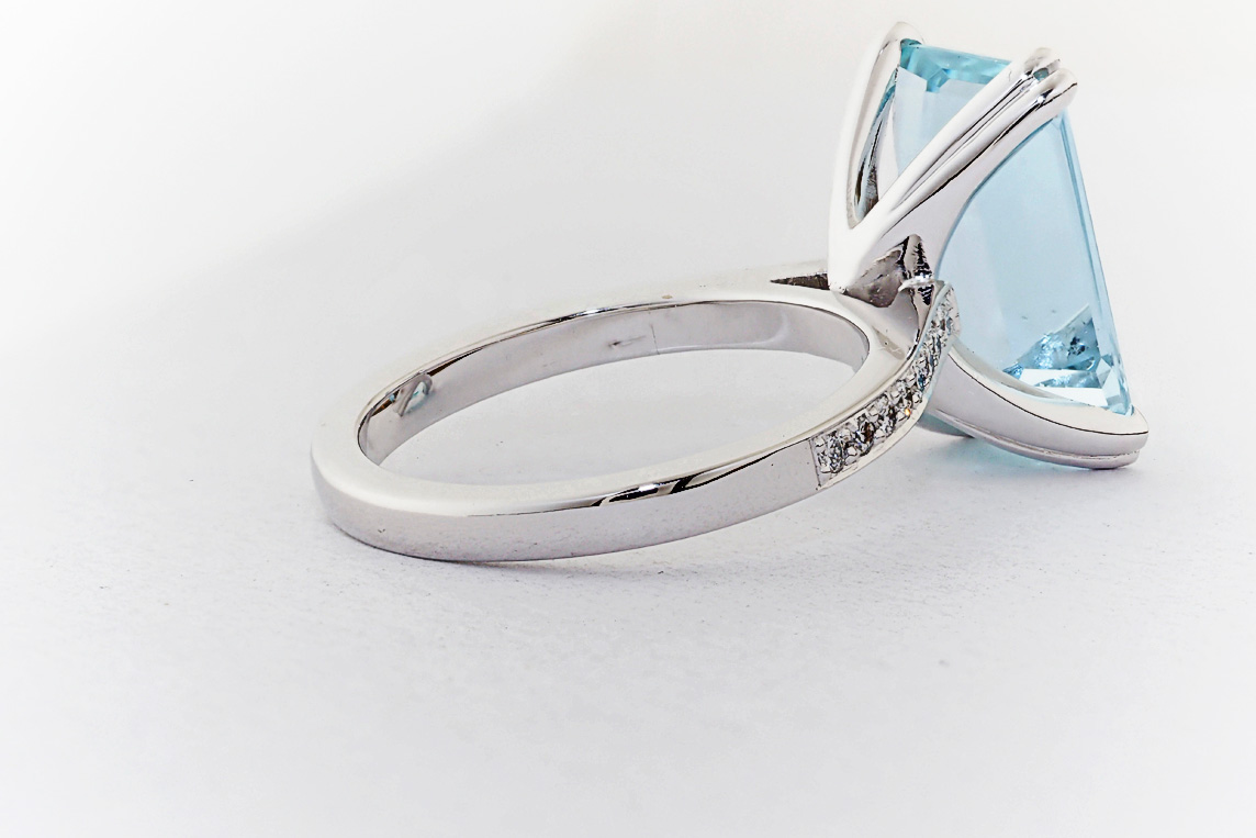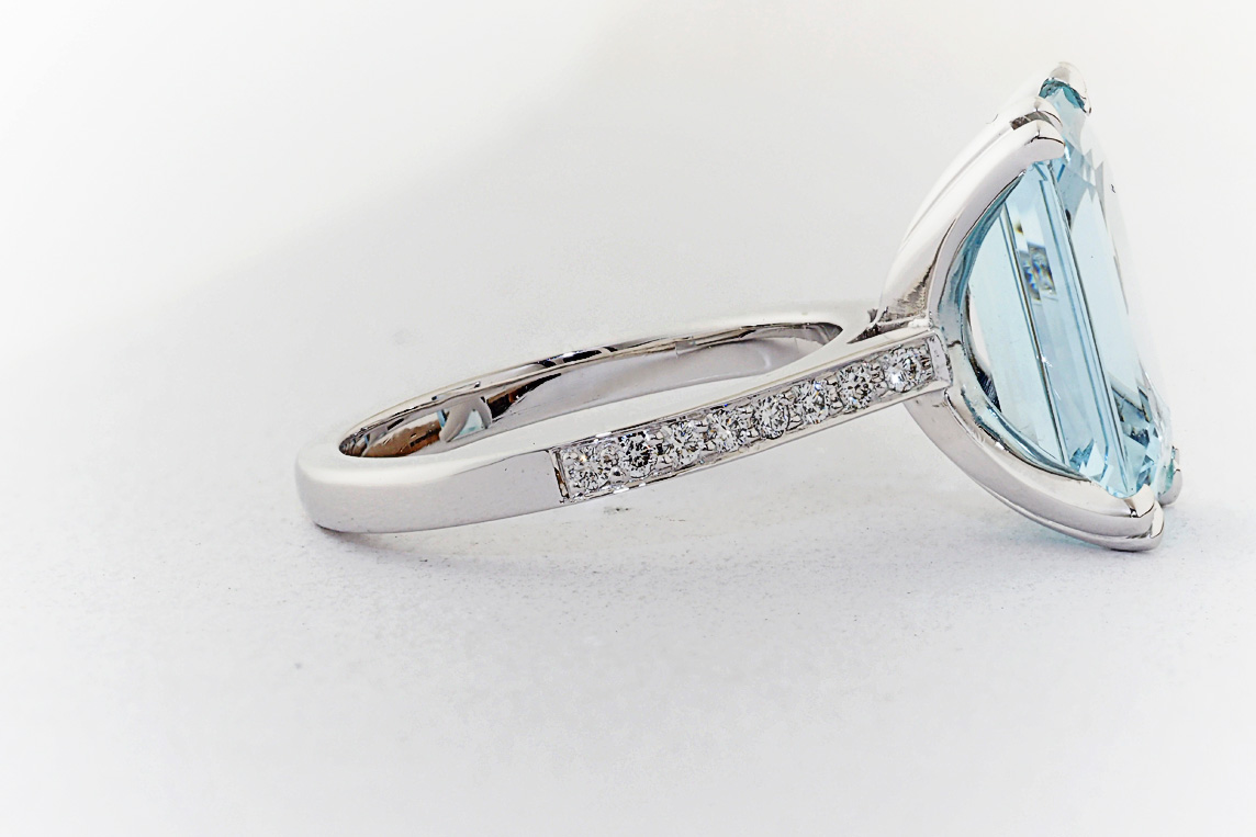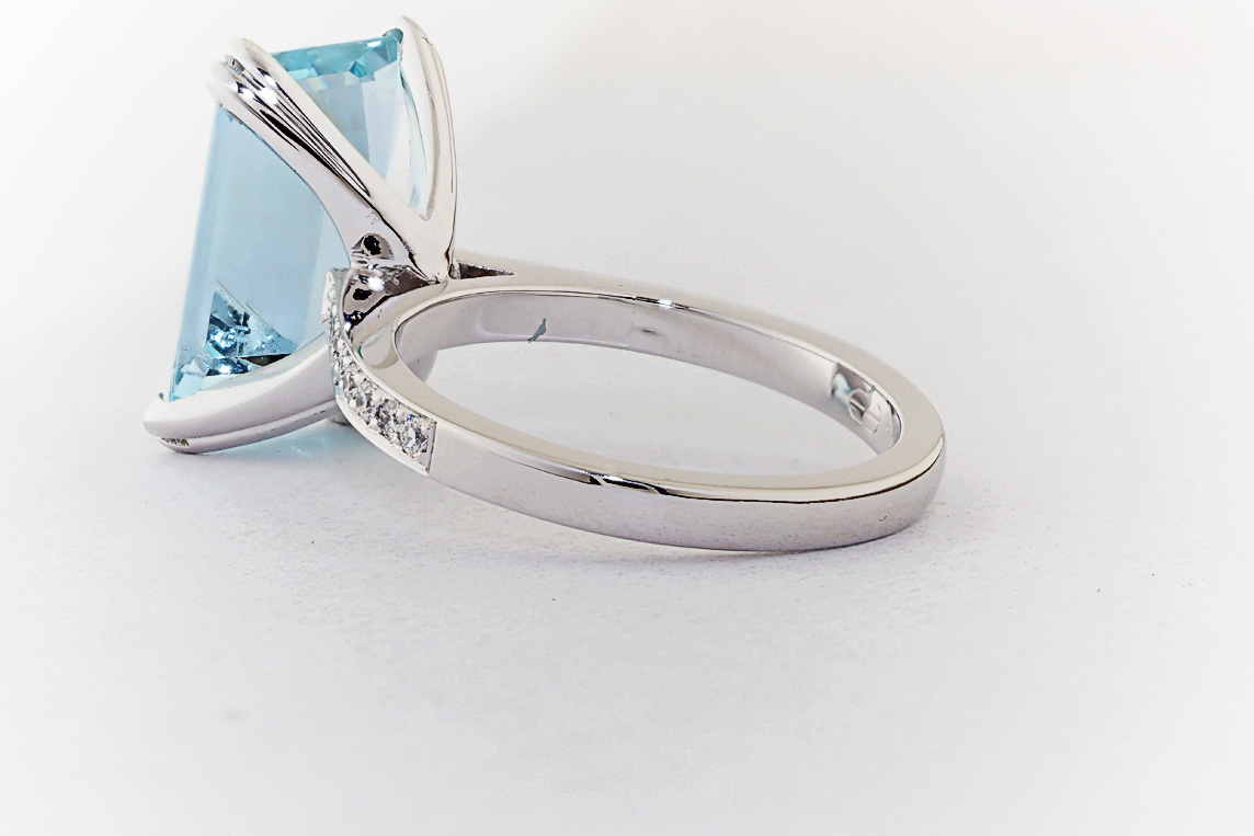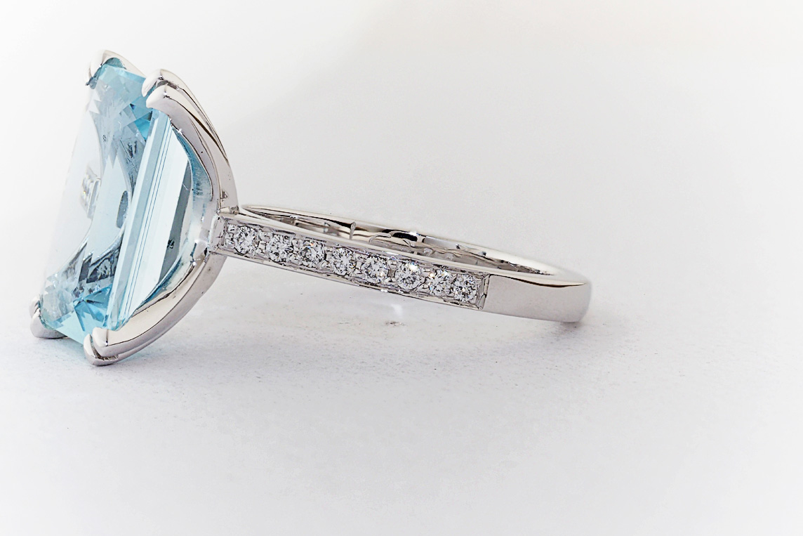 Handmade emerald cut aquamarine and diamond ring