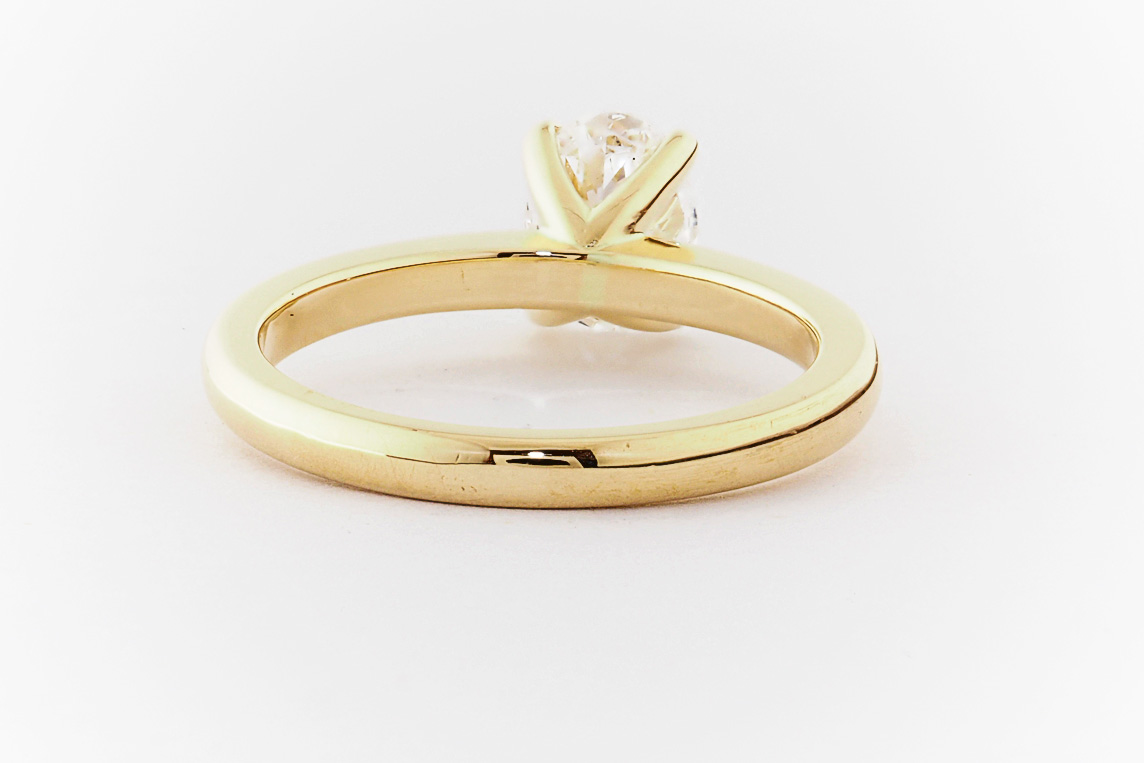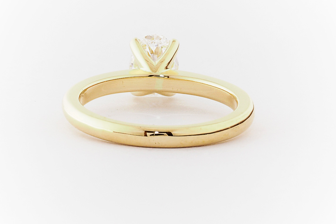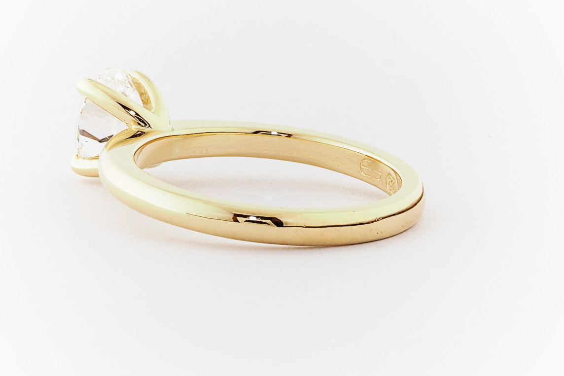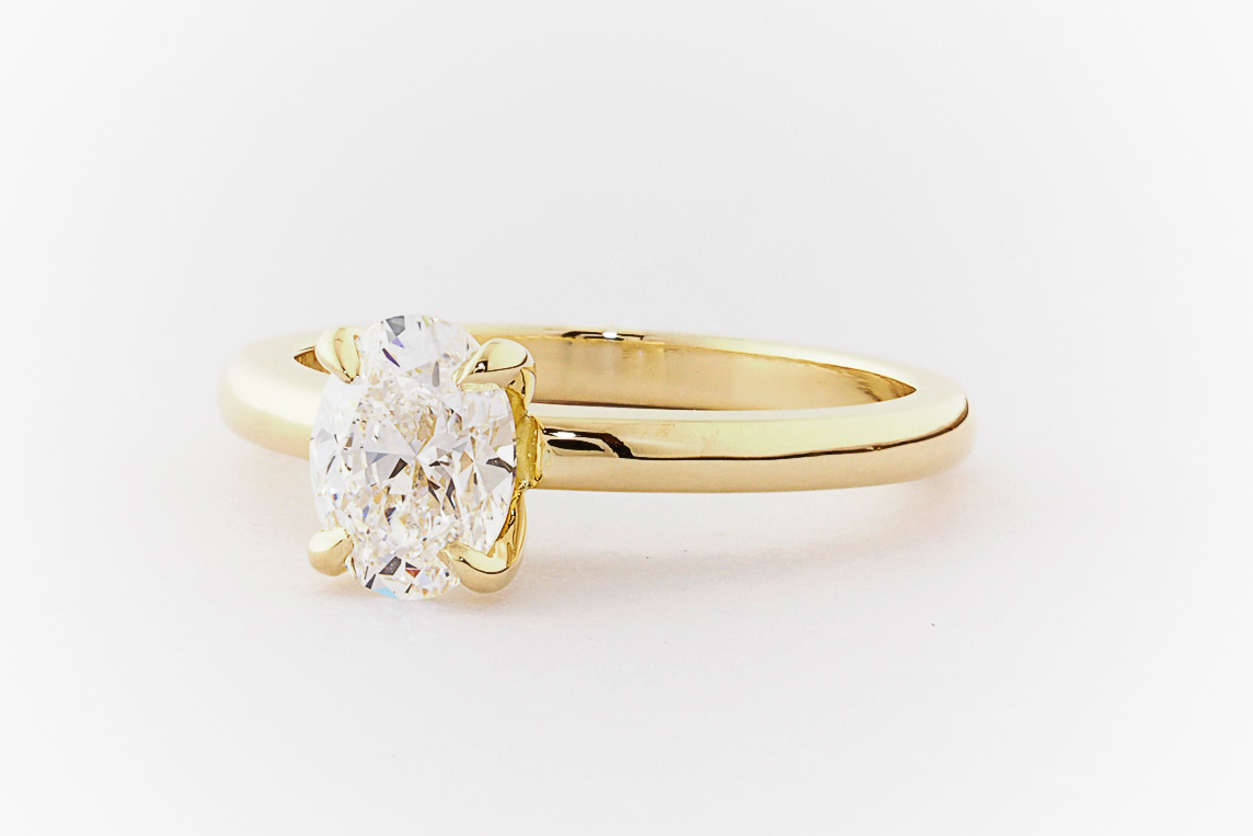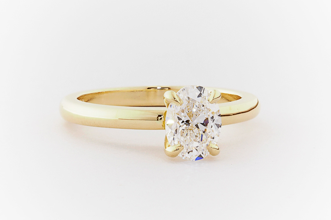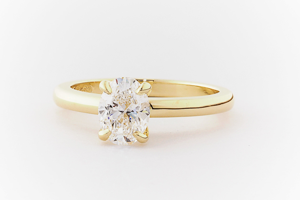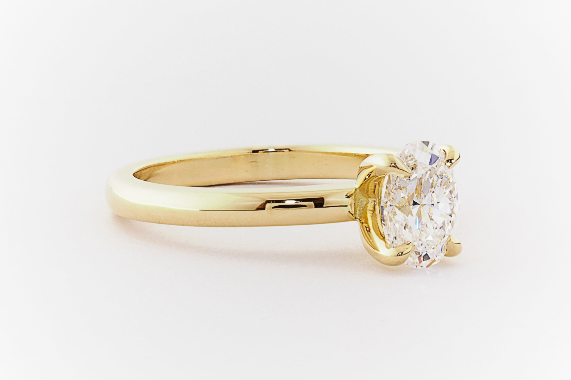 SKU: 20535 Category: Custom Engagement Rings Tags: 1.0ct, 4 claw, flame claw, high dome, oval diamond, solitaire, yellow gold