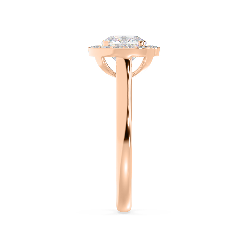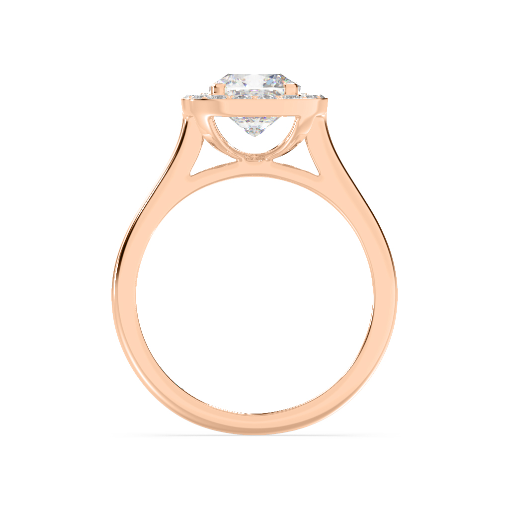 \n Cushion cut diamond (1.00ct shown)\n 16 x 0.015ct round brilliant cut diamonds bead set into halo\n Total diamond weight = 0.24ct\n (based on 1.0ct centre diamond as shown, not including centre diamond)\n Basket style halo supports\n Half round band profile\n 2.20mm wide band\n