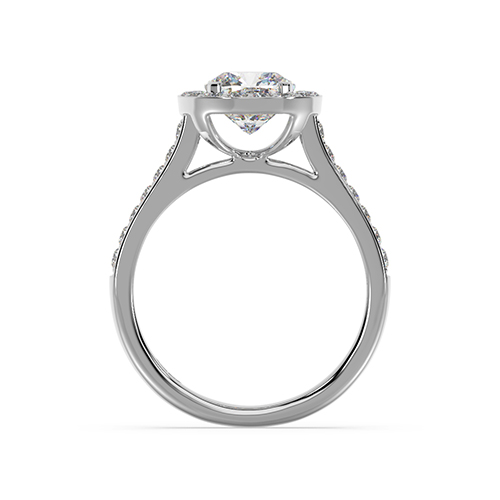 \n Cushion cut diamond (1.00ct shown)\n 16 x 0.015ct round brilliant cut diamonds bead set into halo\n Total diamond weight = 0.24ct\n (based on 1.0ct centre diamond as shown, not including centre diamond)\n 14 x 0.015ct round brilliant cut diamonds bead set into shoulders\n Basket style halo supports\n Half round band profile\n 2.20mm wide band\n