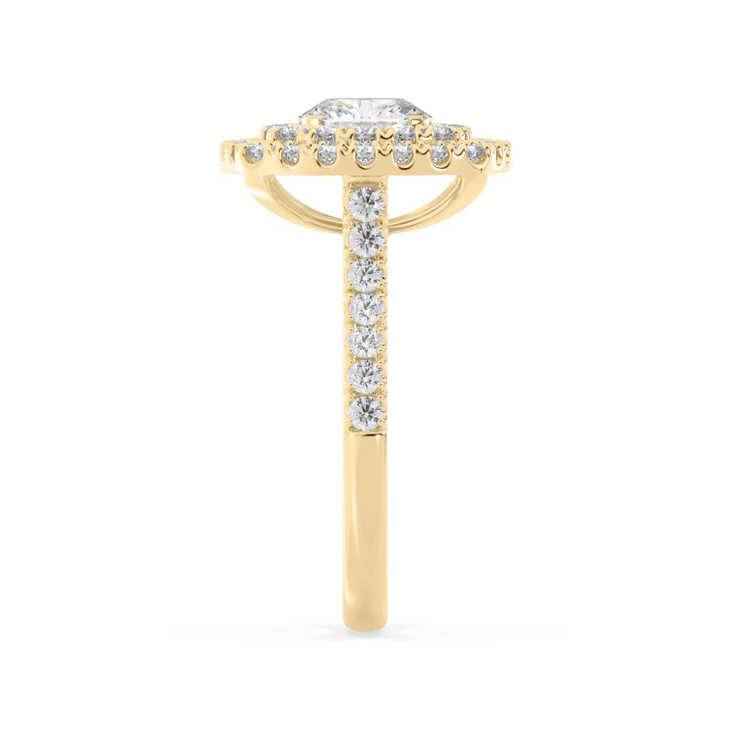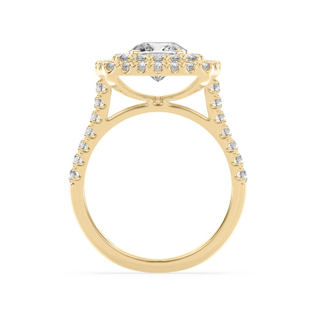 \n Cushion cut centre diamond (1.00ct shown)\n 40 x 0.015ct round brilliant cut diamonds shared claw set into double halo\n Total diamond weight = 0.60ct\n (based on 1.0ct centre diamond as shown, not including centre diamond)\n 14 x 0.015ct round brilliant cut diamonds shared claw set into shoulders\n Total diamond weight = 0.21ct\n Basket style halo supports\n Half round band profile\n 2.20mm wide band\n