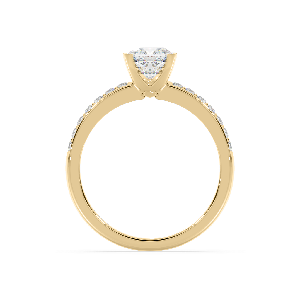 \n Cushion cut centre diamond (1.00ct shown)\n 4 claw setting\n 14 x 0.015ct round brilliant cut diamonds\n Split shared claw setting\n Total Diamond Weight = 0.21ct\n High dome band profile\n 2.20mm wide band\n