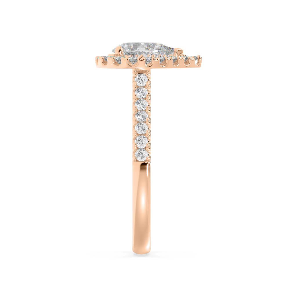 Cushion cut diamond shared claw basket style halo engagement ring