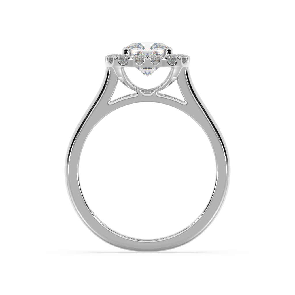 \n Cushion shape diamond (1.00ct shown)\n 16 x 0.015ct round brilliant cut diamonds shared claw set into halo\n Total diamond weight = 0.24ct\n (based on 1.0ct centre diamond as shown, not including centre diamond)\n Basket style halo supports\n Half round band profile\n 2.20mm wide band\n