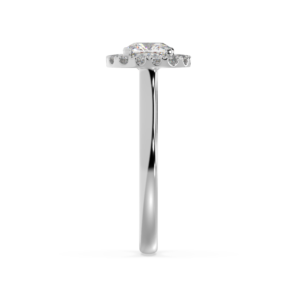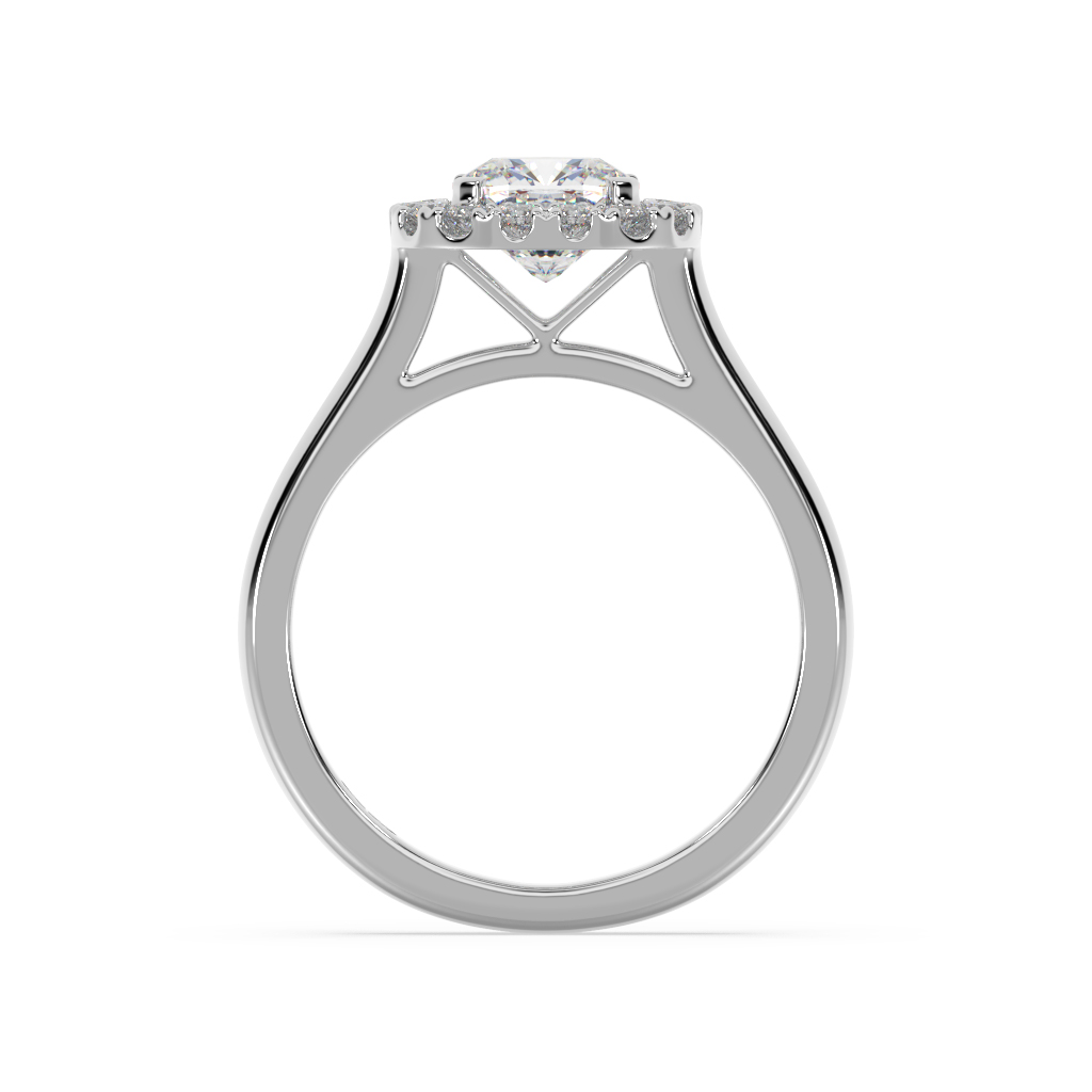 \n Cushion shape diamond (1.00ct shown)\n 16 x 0.015ct round brilliant cut diamonds shared claw set into halo\n Total diamond weight = 0.24ct\n (based on 1.0ct centre diamond as shown, not including centre diamond)\n Vee style halo supports\n Half round band profile\n 2.20mm wide band\n