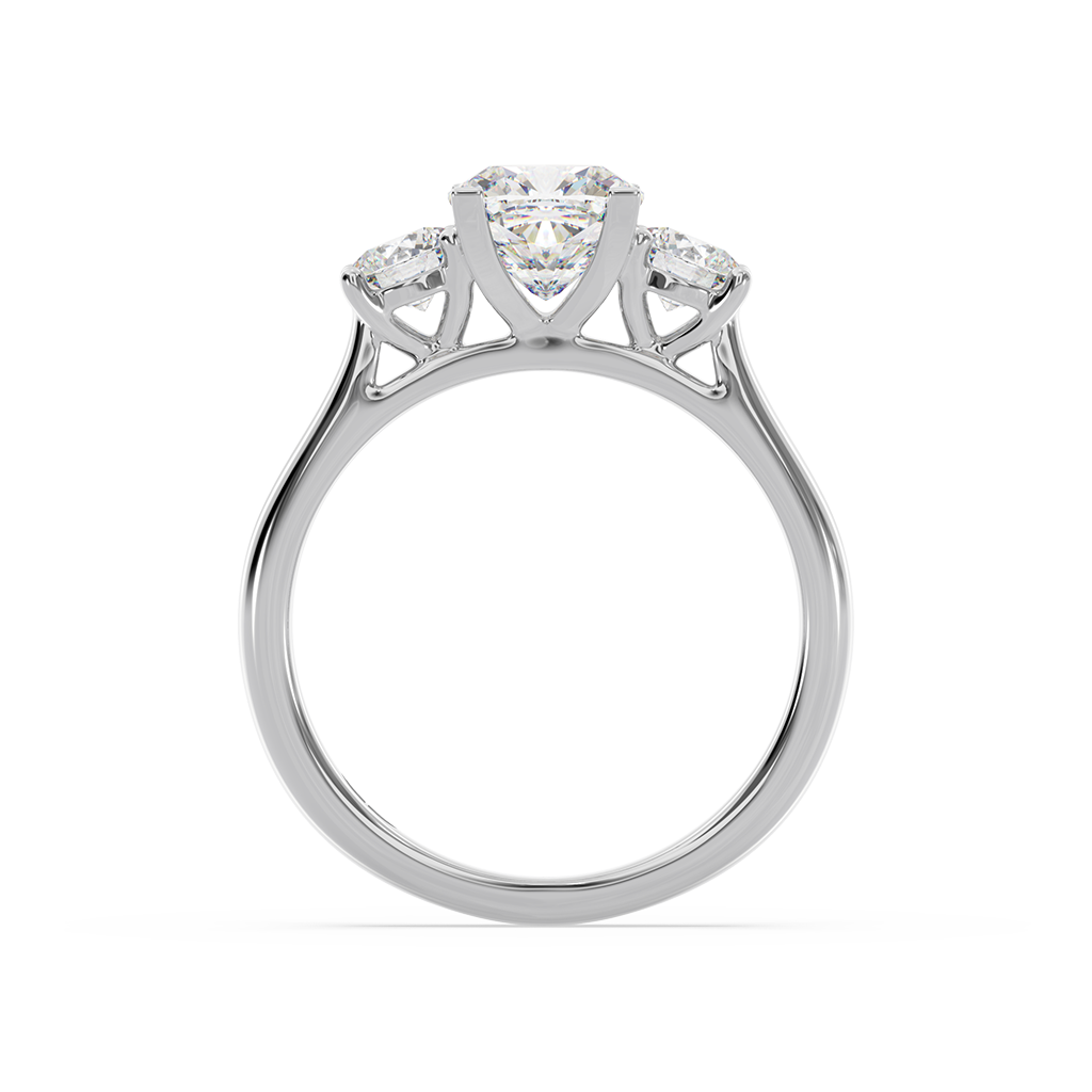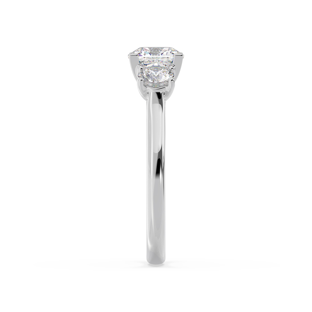 \n Cushion cut diamond (1.00ct shown)\n Centre diamond in 4 claw setting\n 2 round brilliant cut diamonds (2 x 0.30ct shown)\n Side diamonds in 4 claw settings with under bearing\n Half-round band profile\n 2.20mm wide band\n
