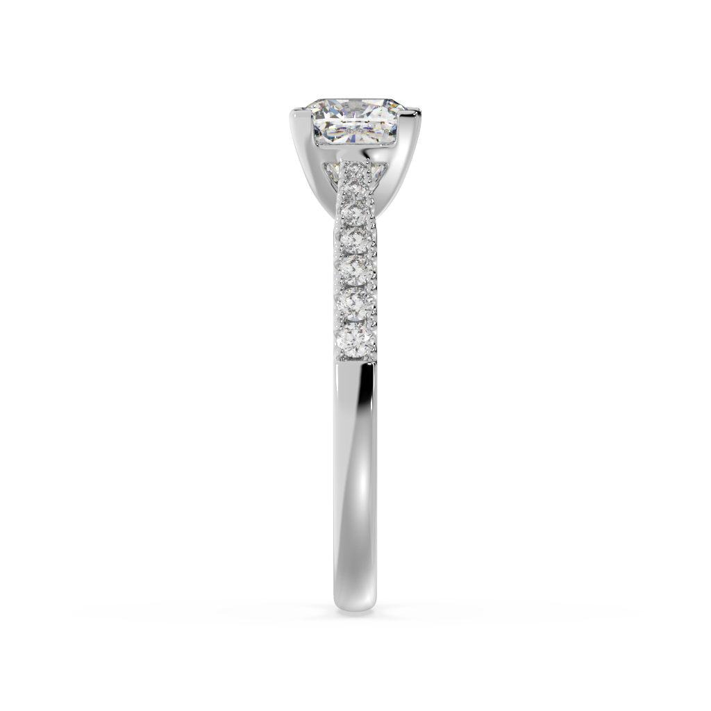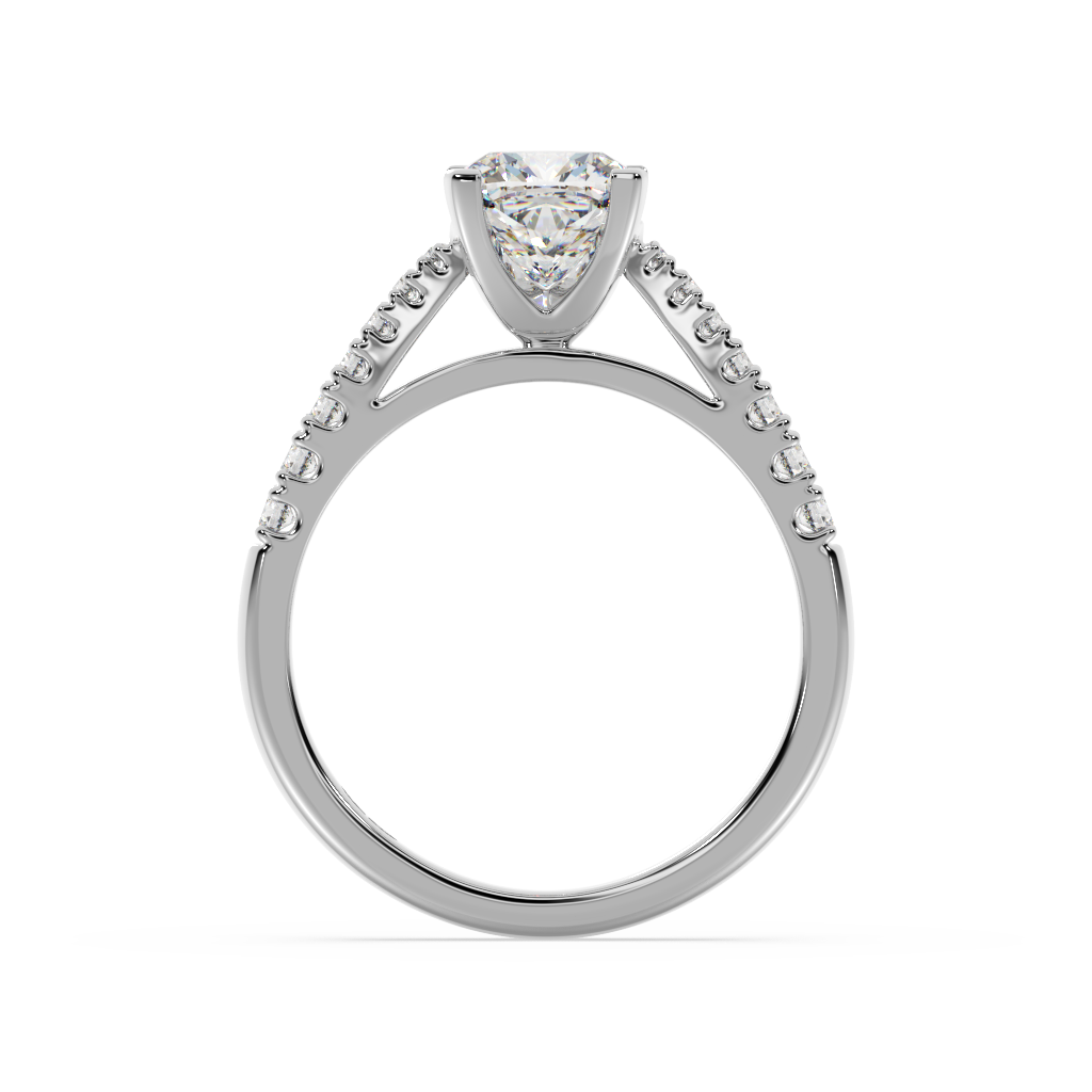 Cushion diamond engagement ring with tapered split shared claw shoulders
