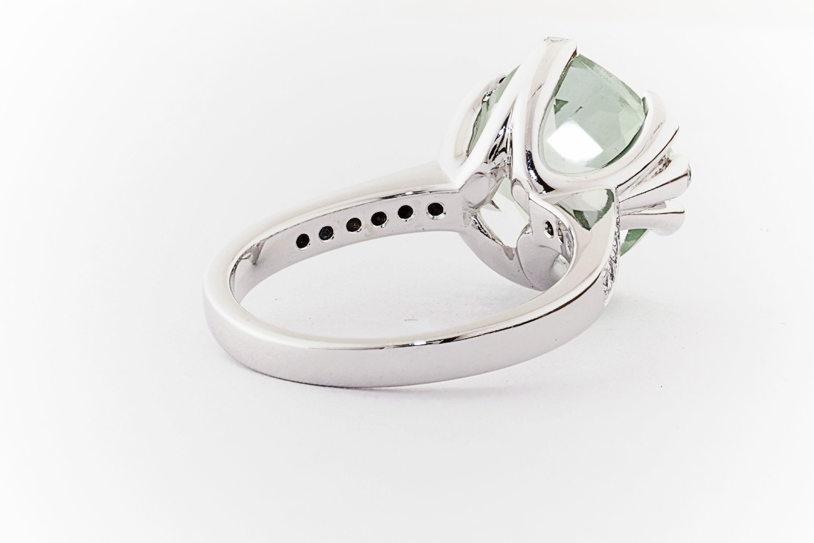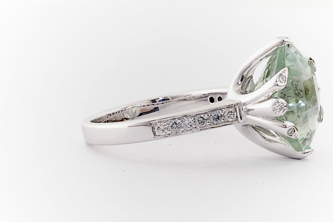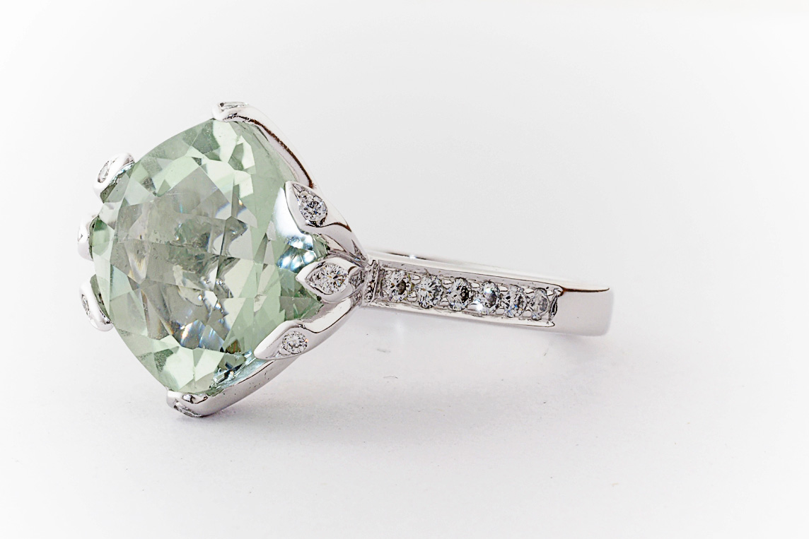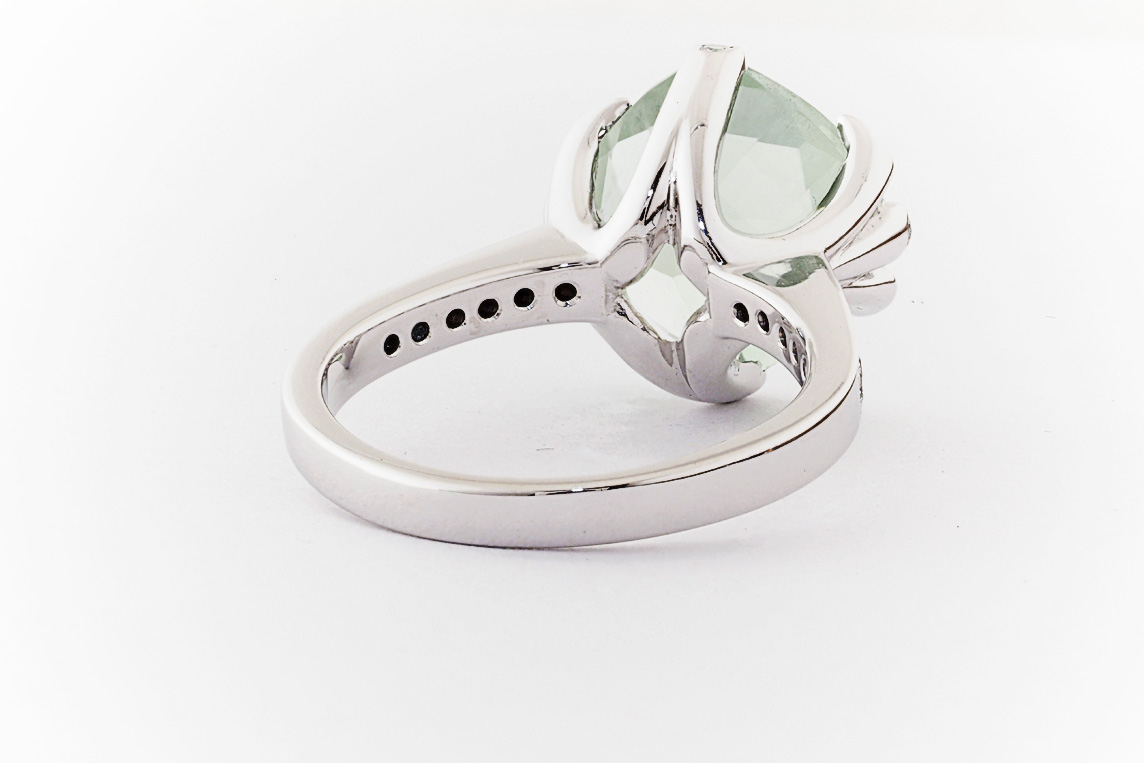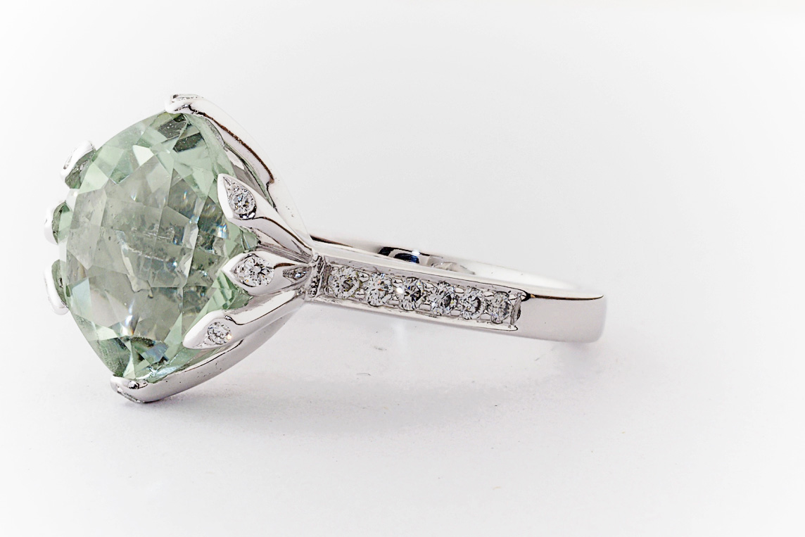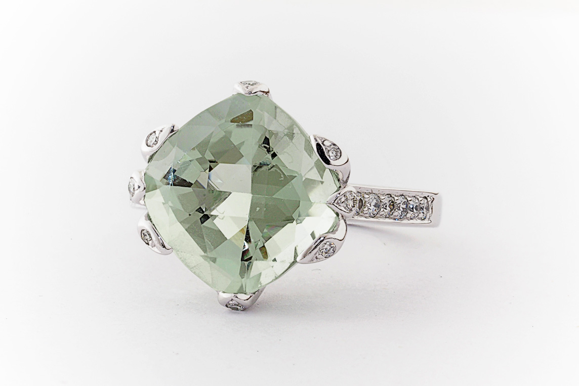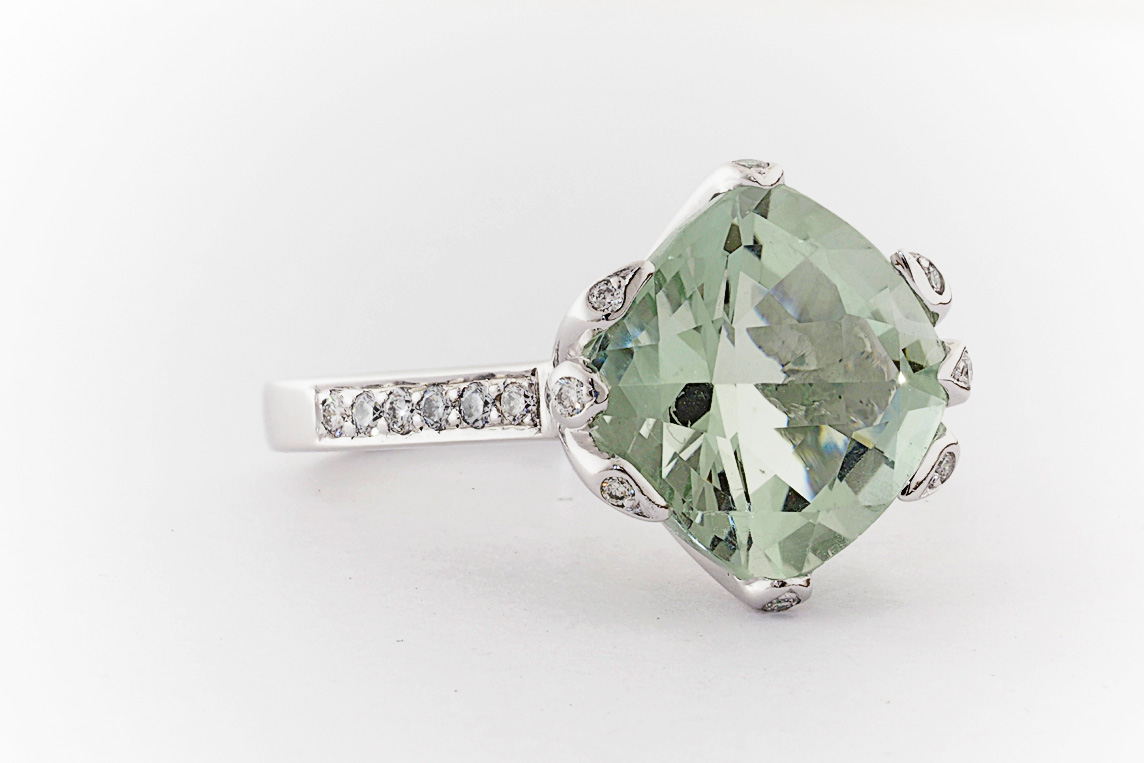 18ct white gold, green amethyst, and diamond handmade ring