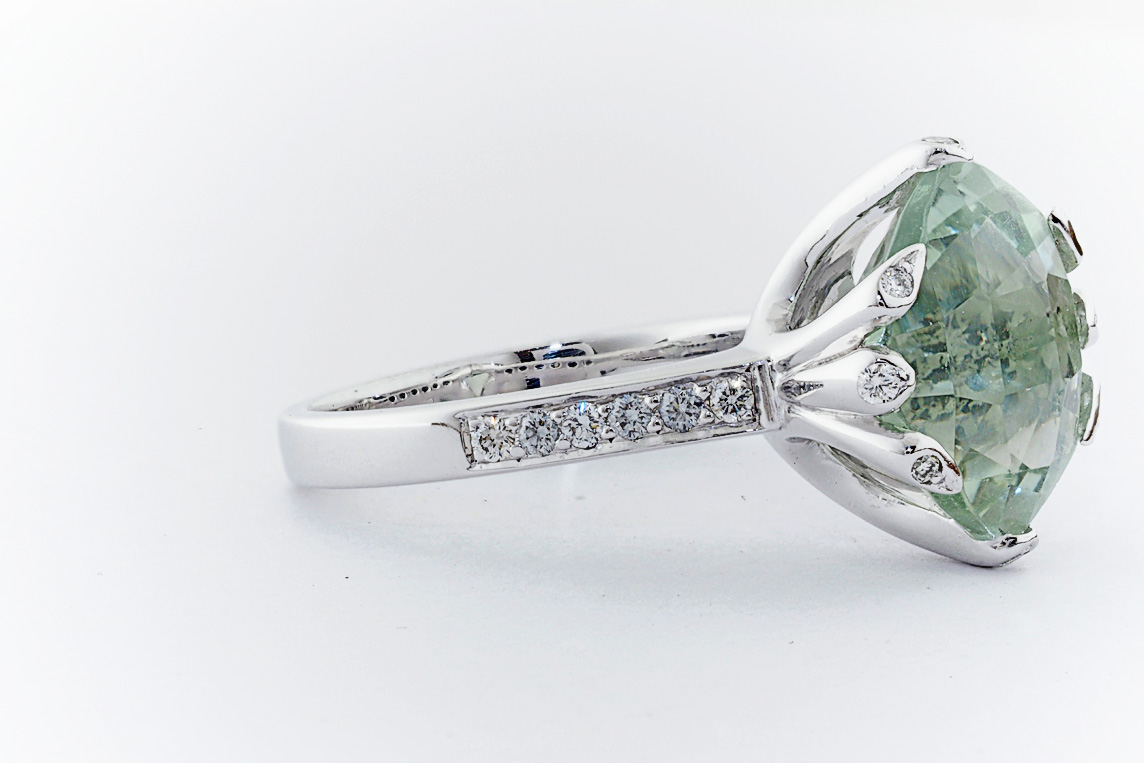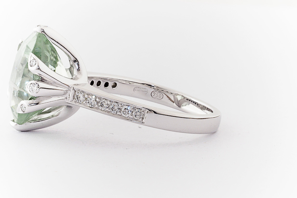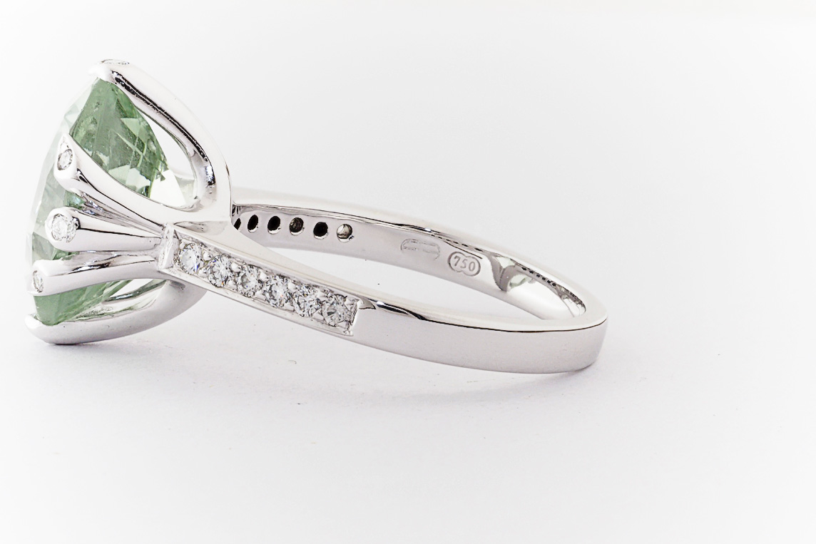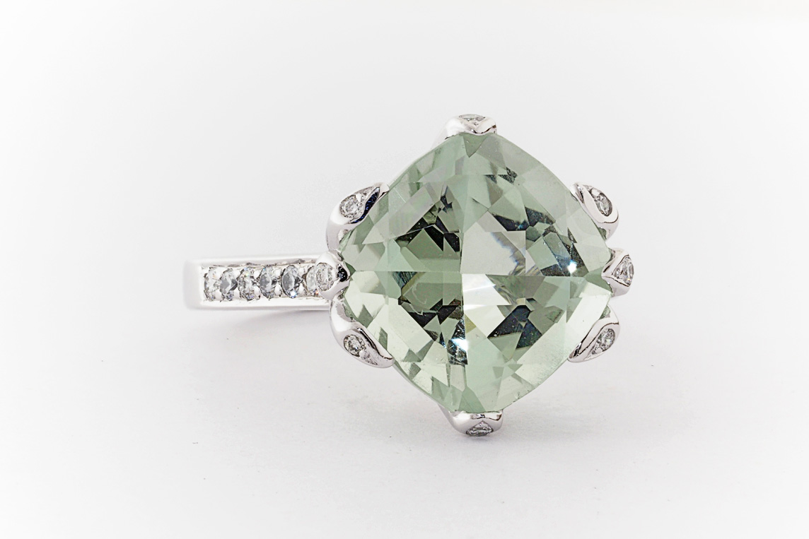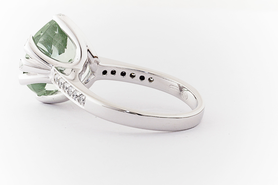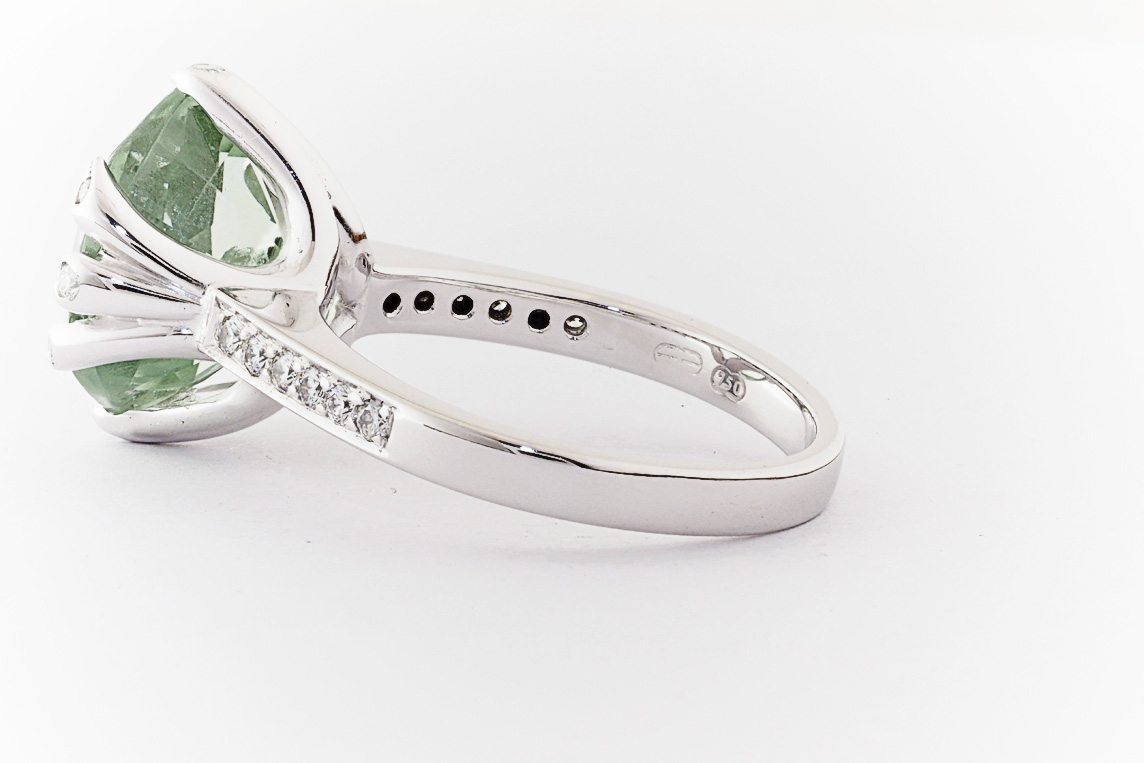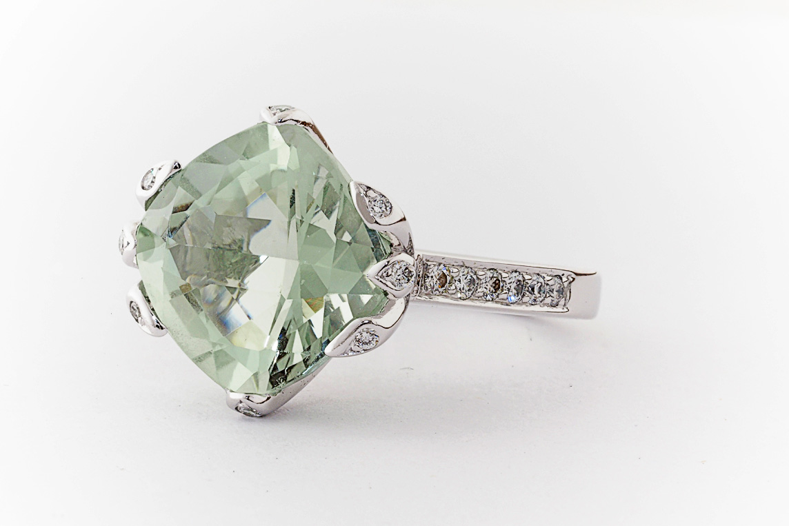 18ct white gold, green amethyst, and diamond handmade ring