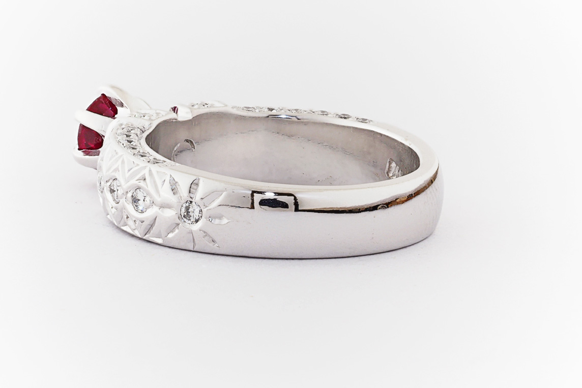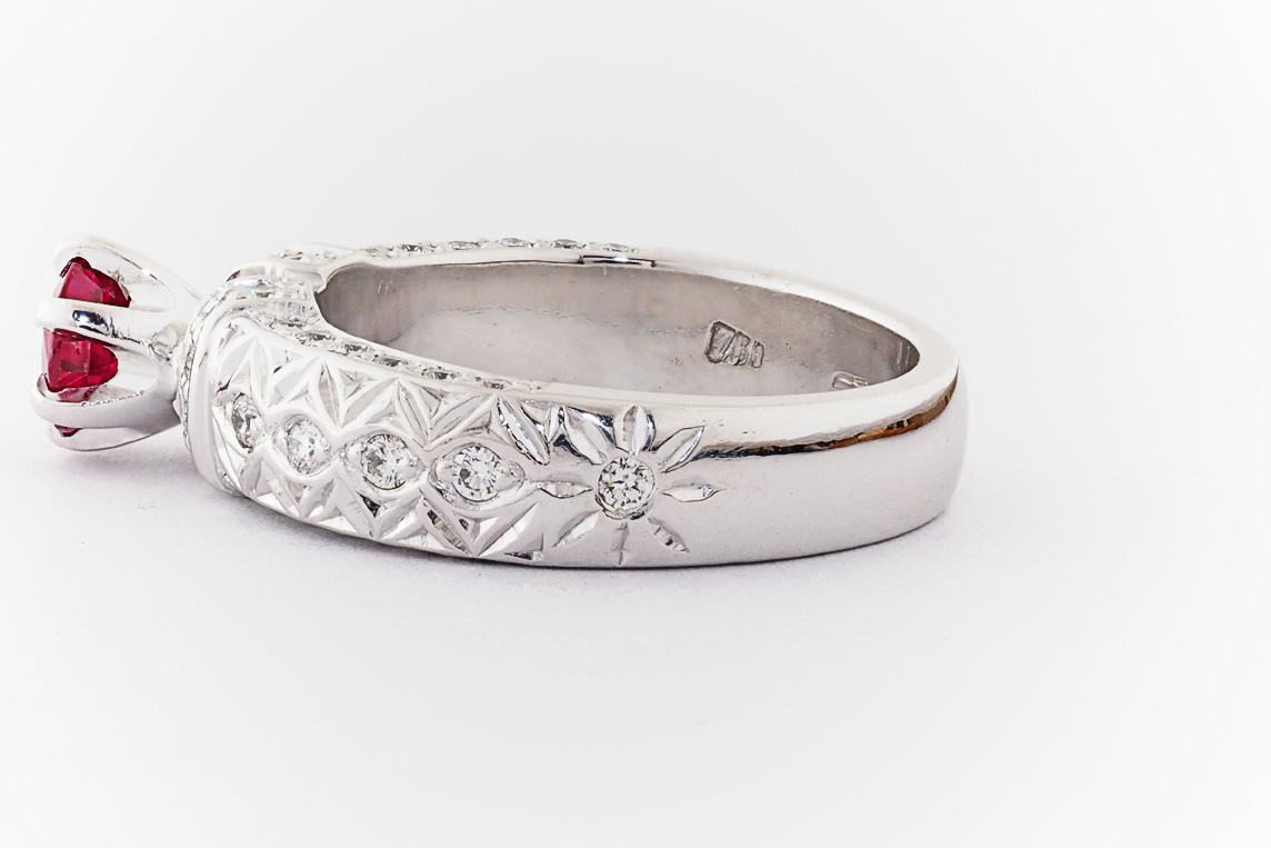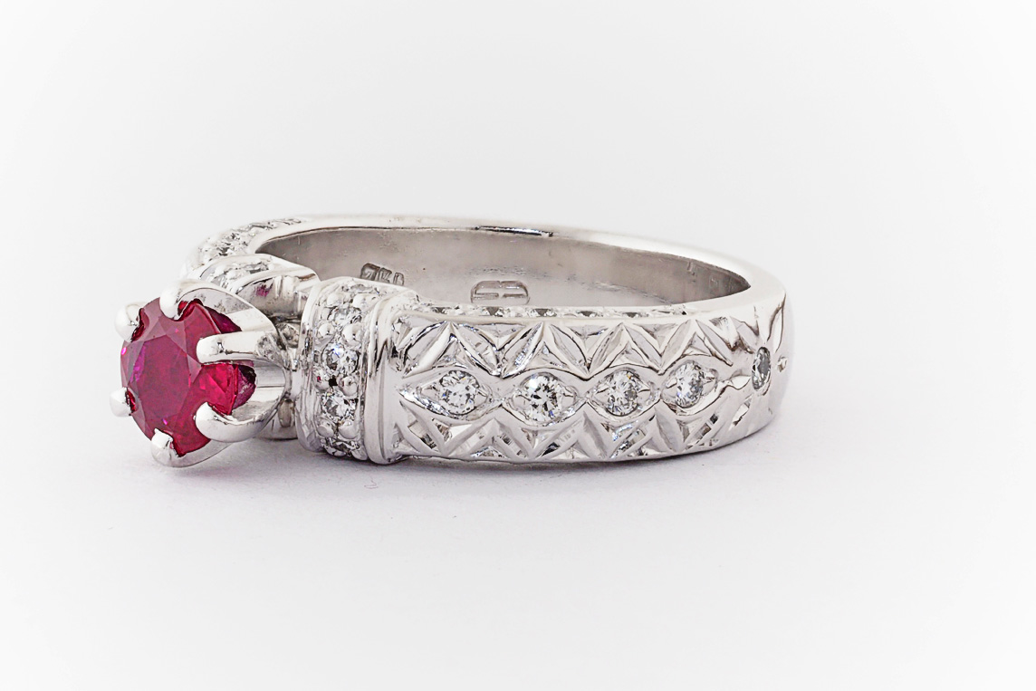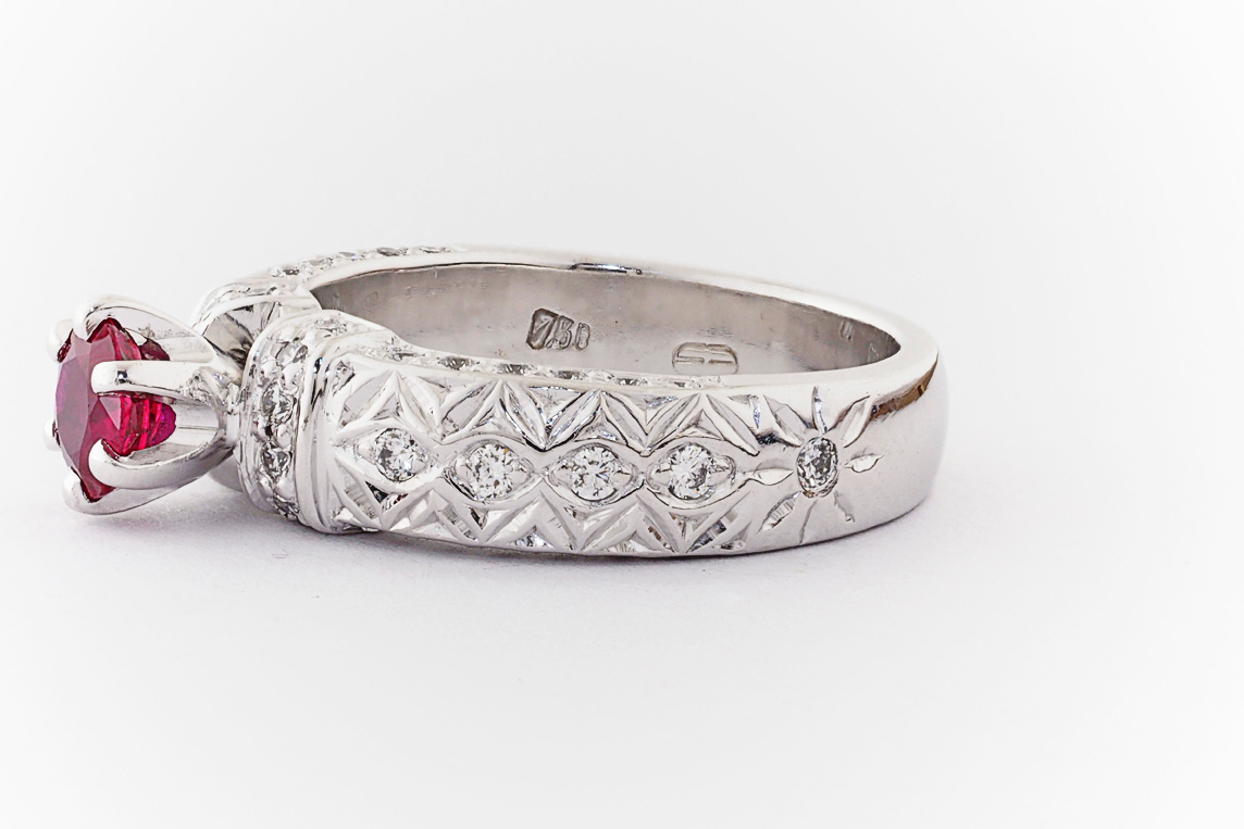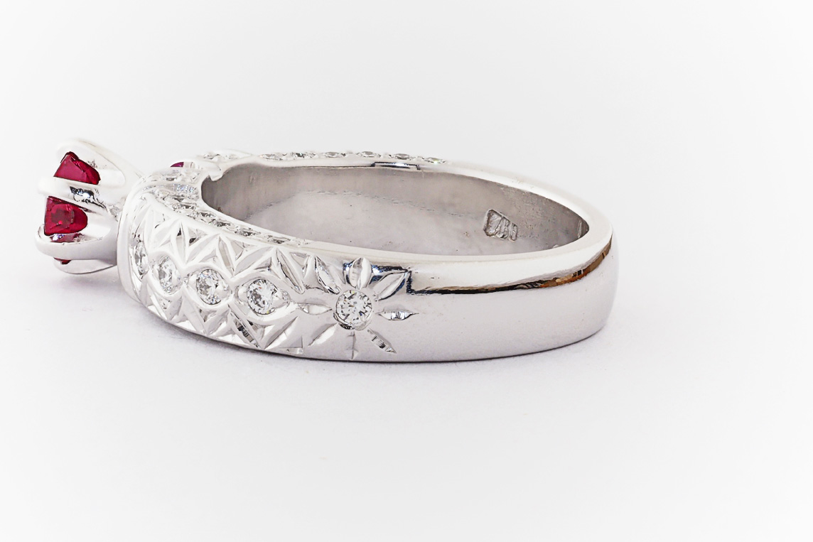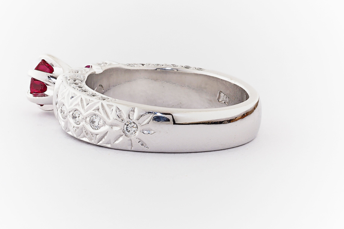 Hand made 18ct white gold, ruby and diamond engagement ring