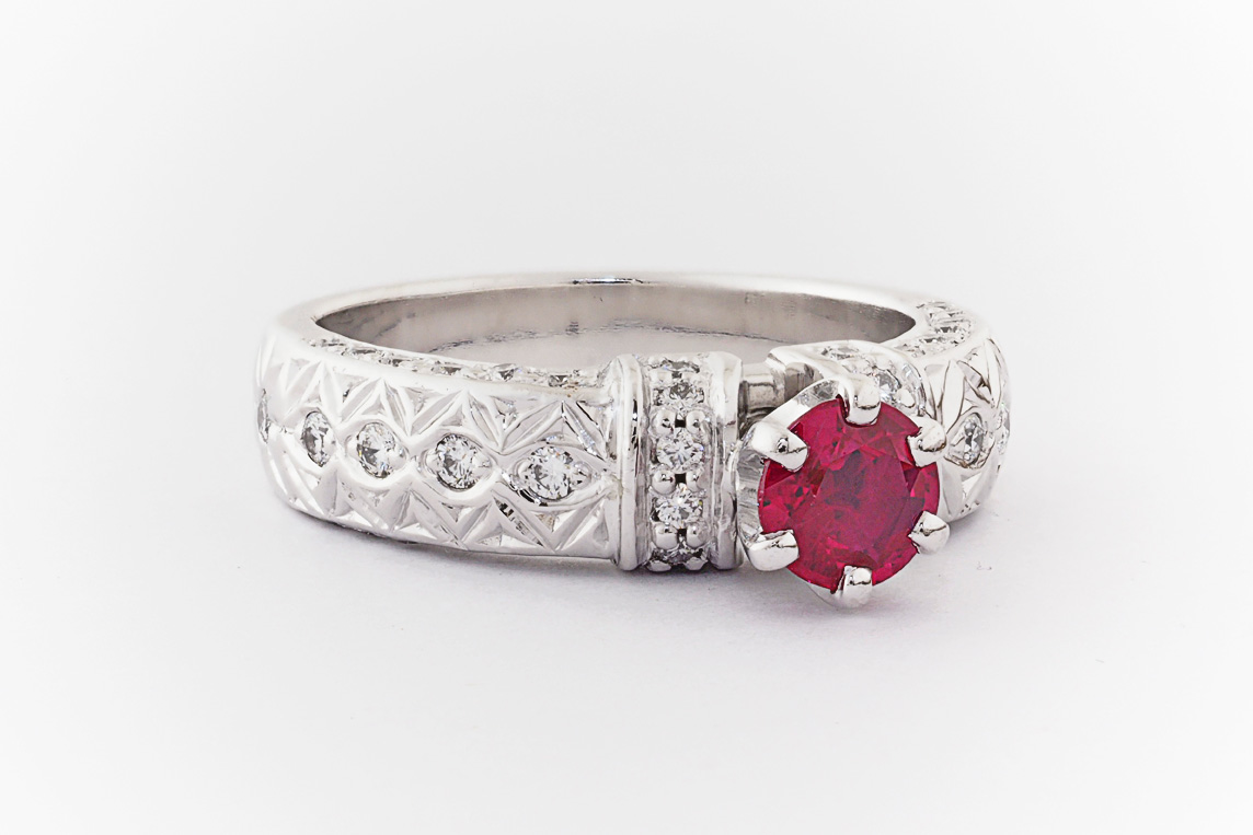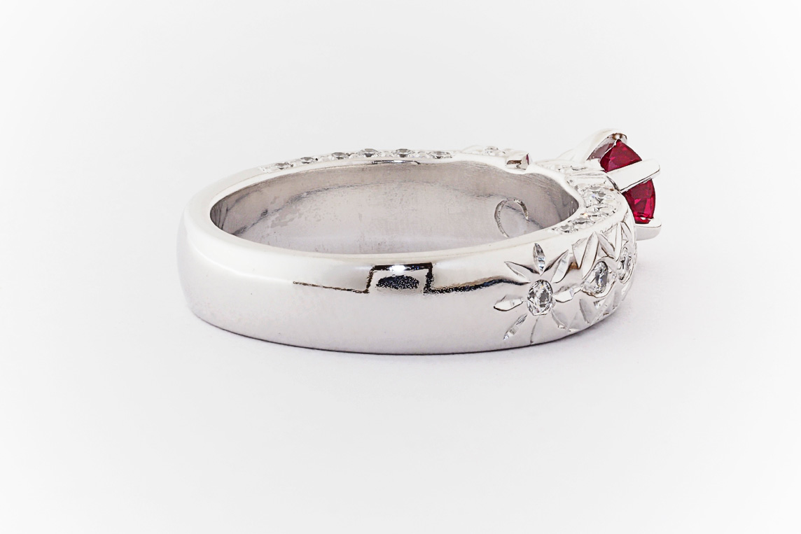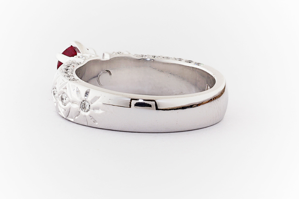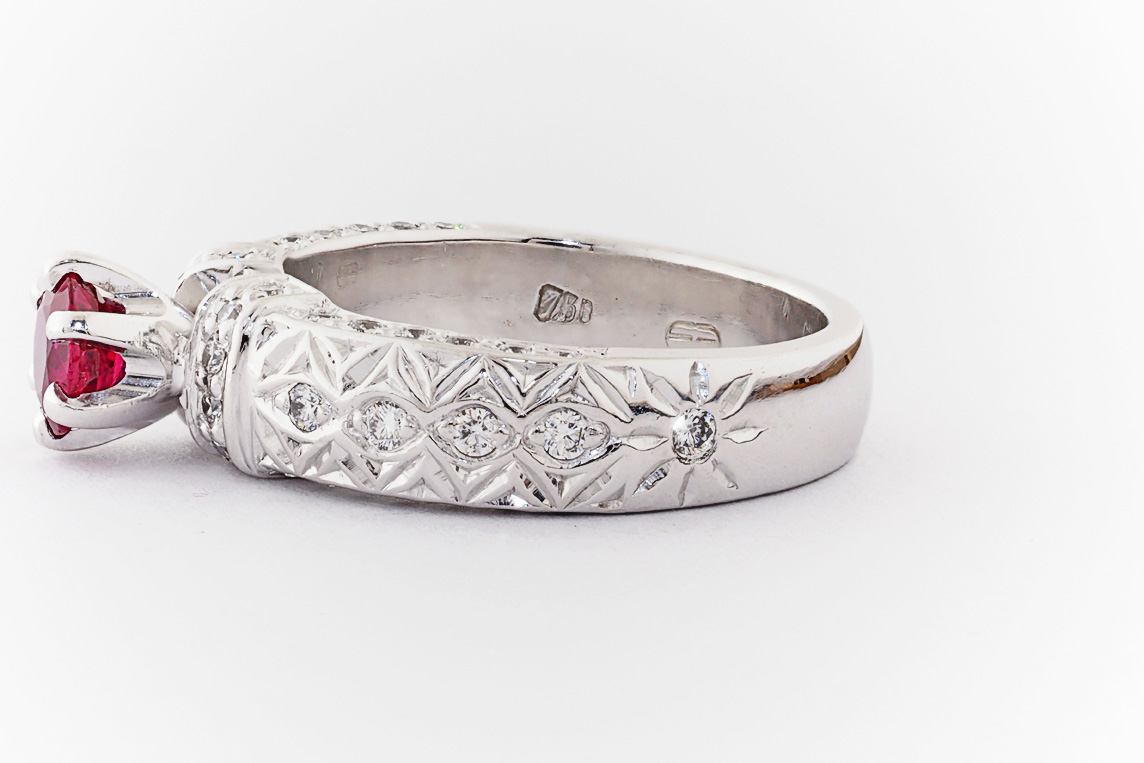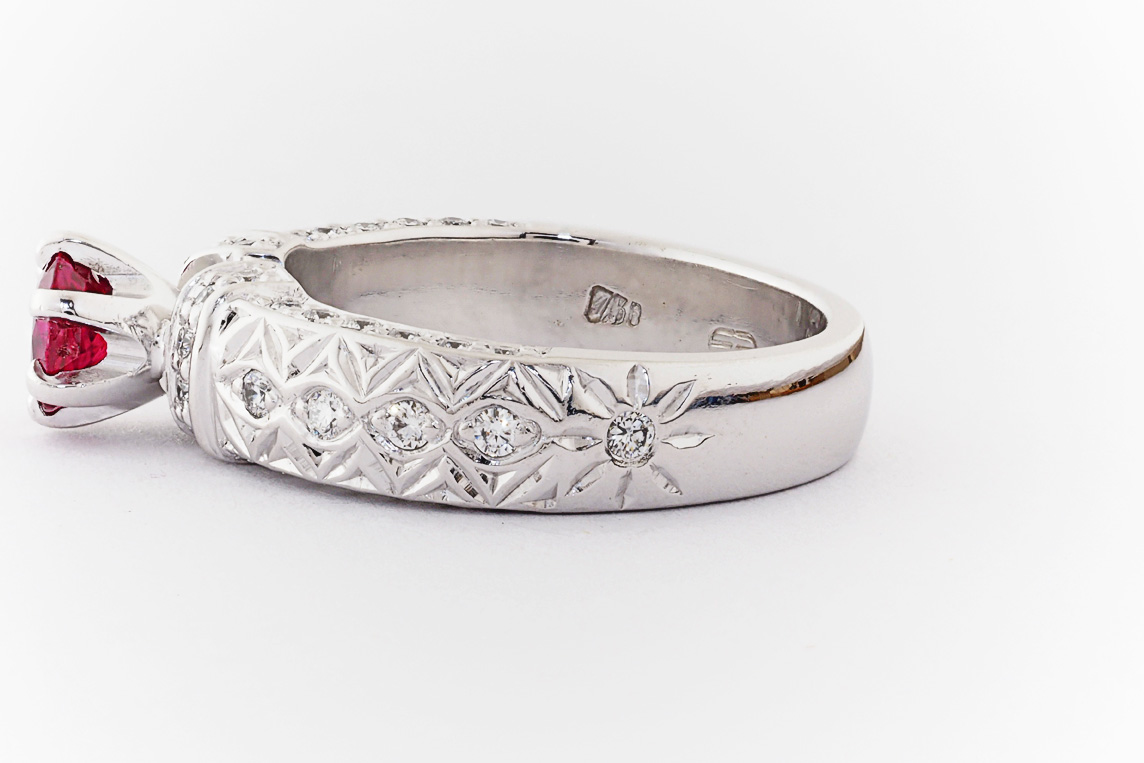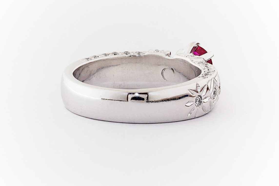 Hand made 18ct white gold, ruby and diamond engagement ring