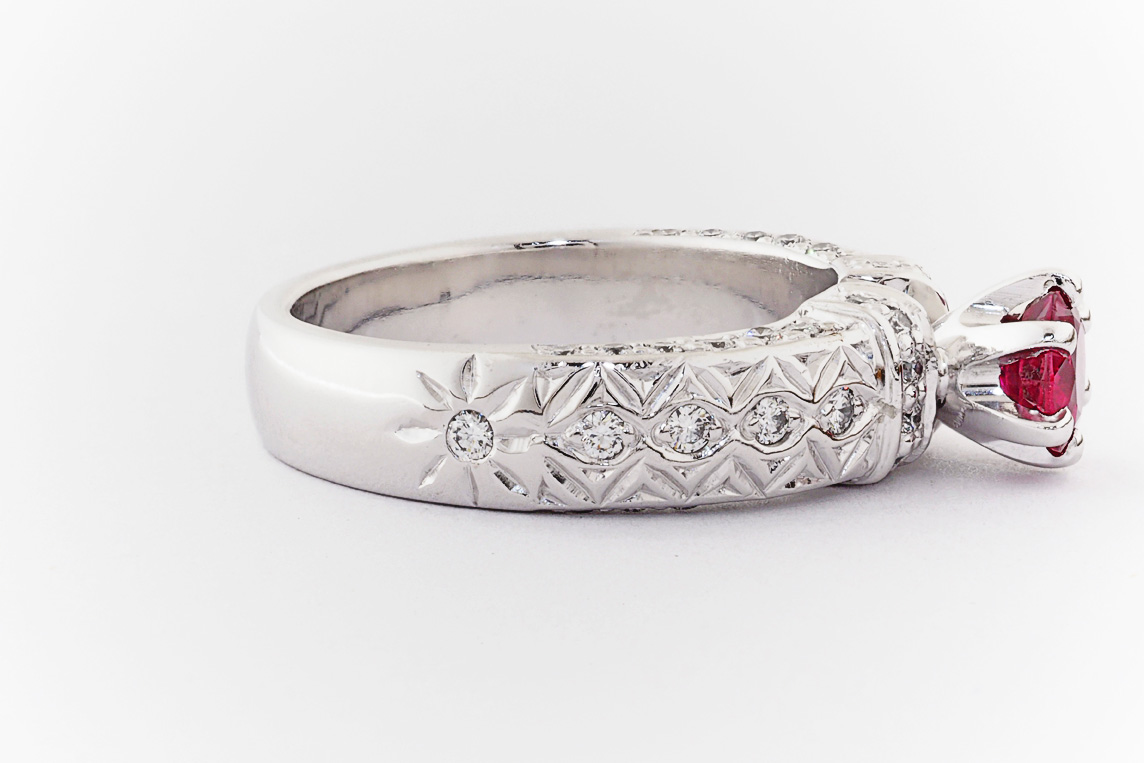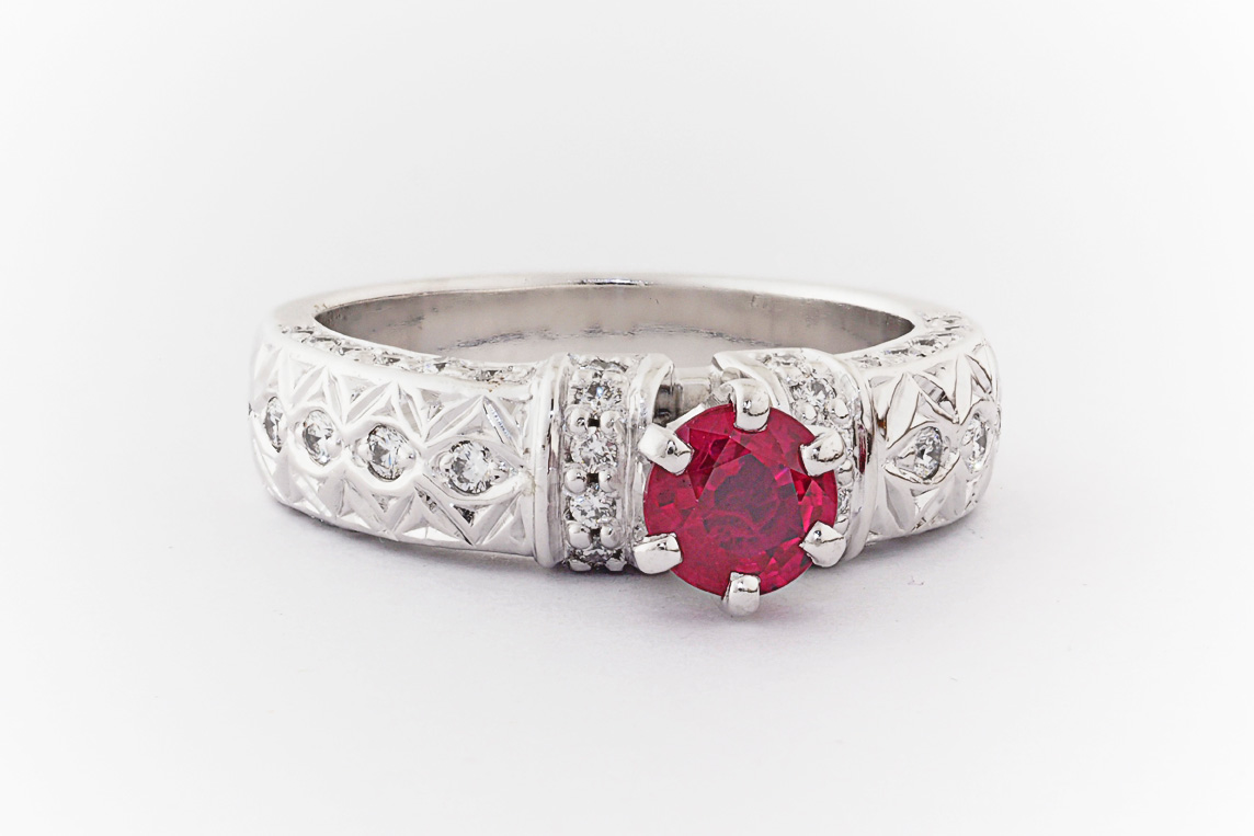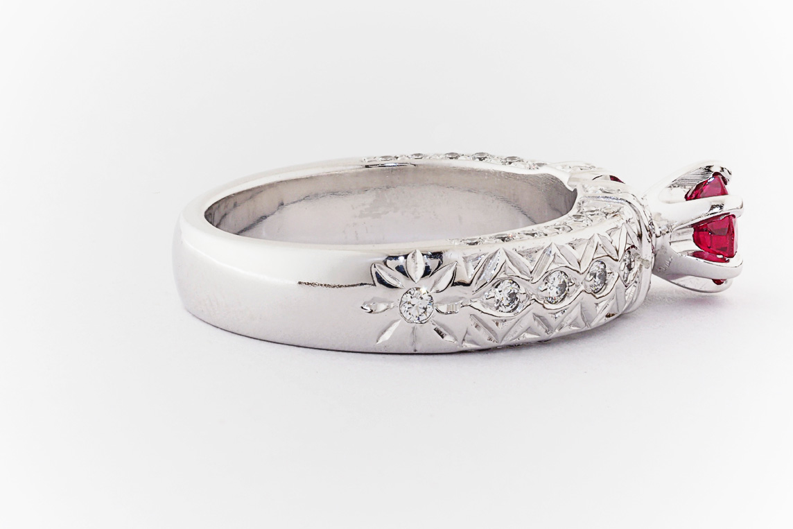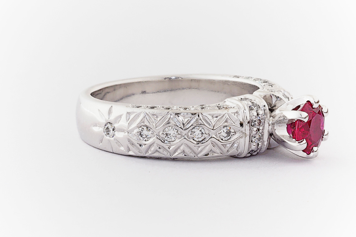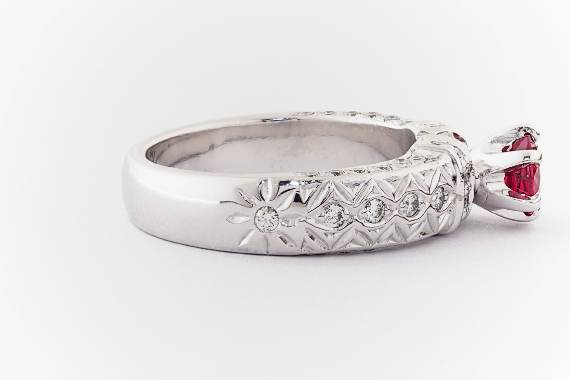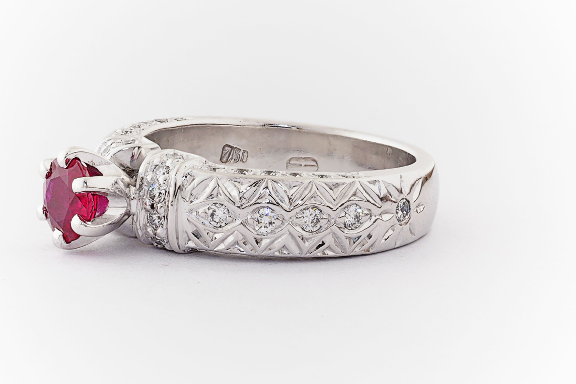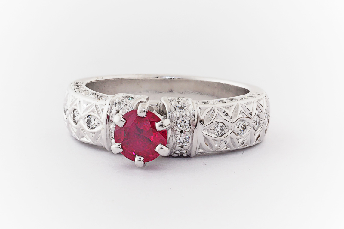 Hand made 18ct white gold, ruby and diamond engagement ring