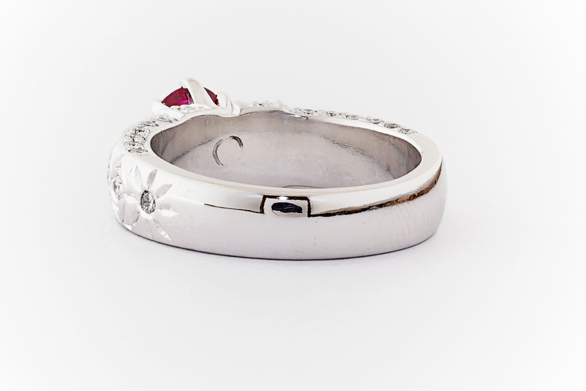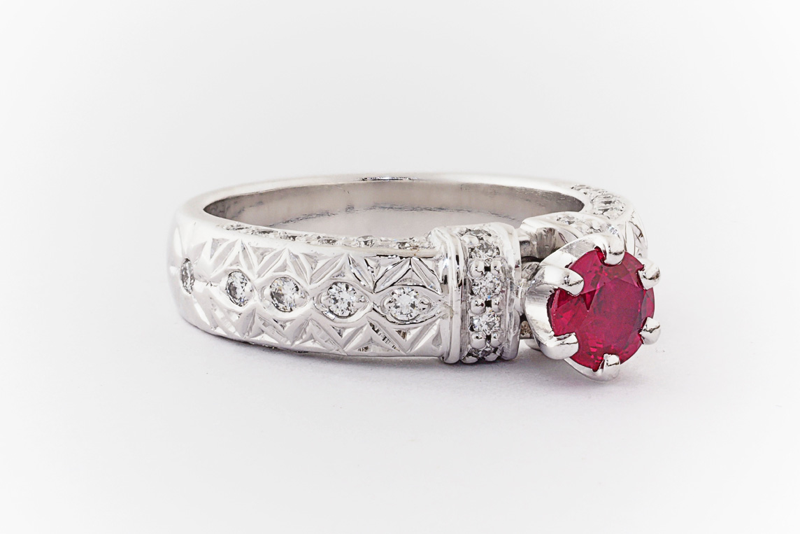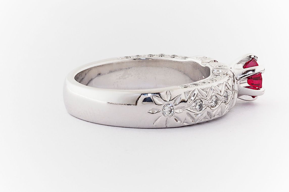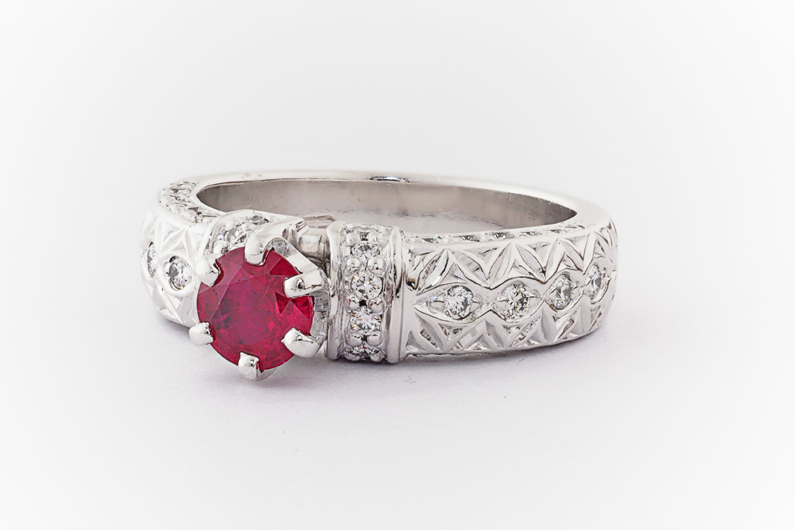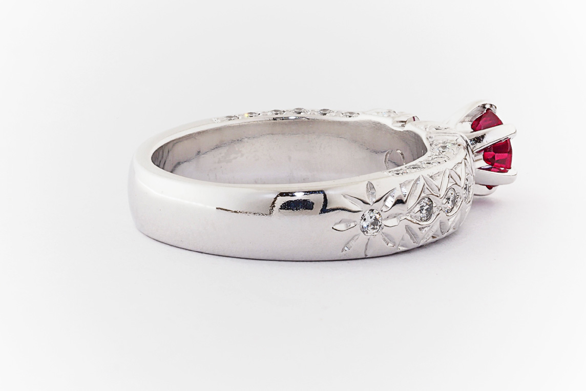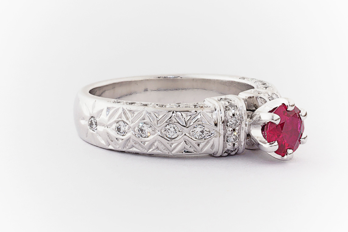 Hand made 18ct white gold, ruby and diamond engagement ring