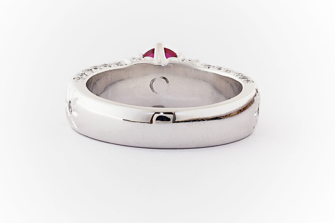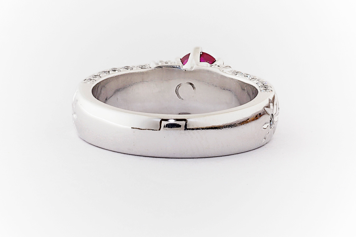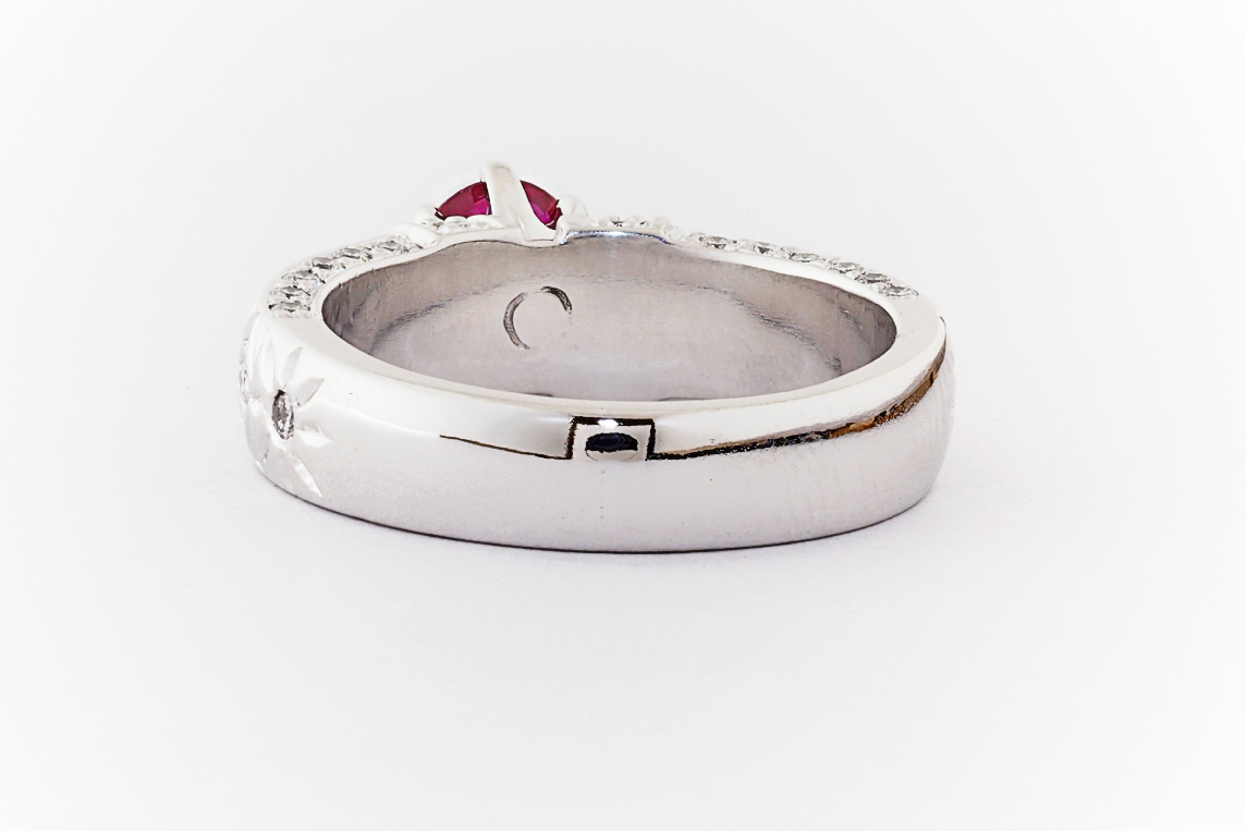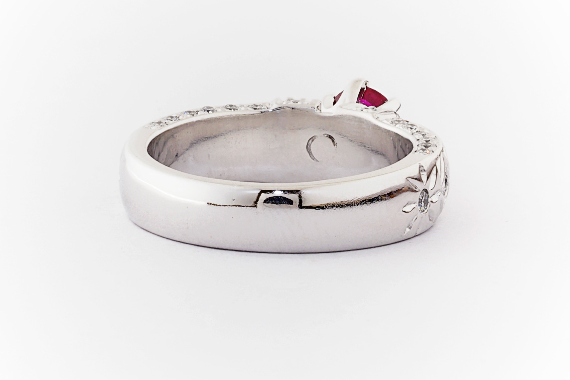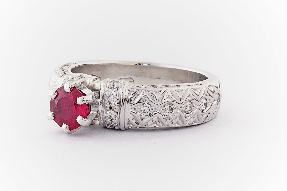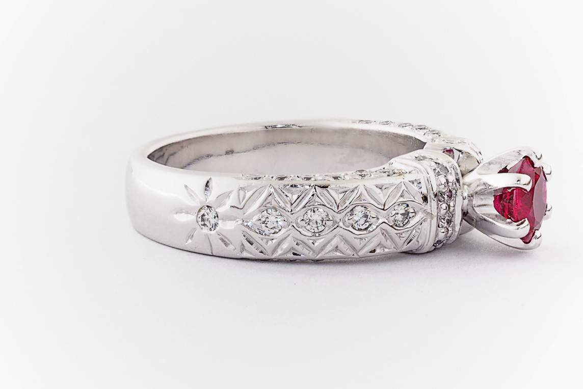 Hand made 18ct white gold, ruby and diamond engagement ring