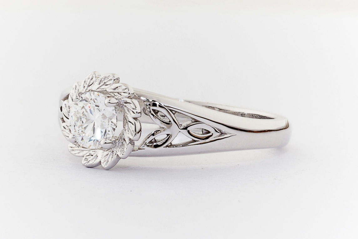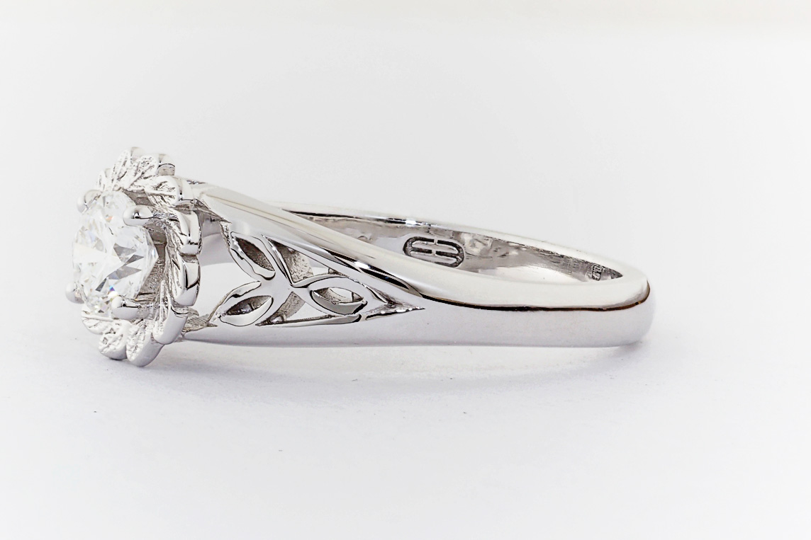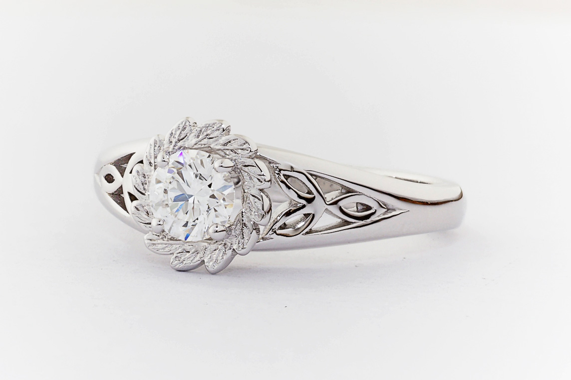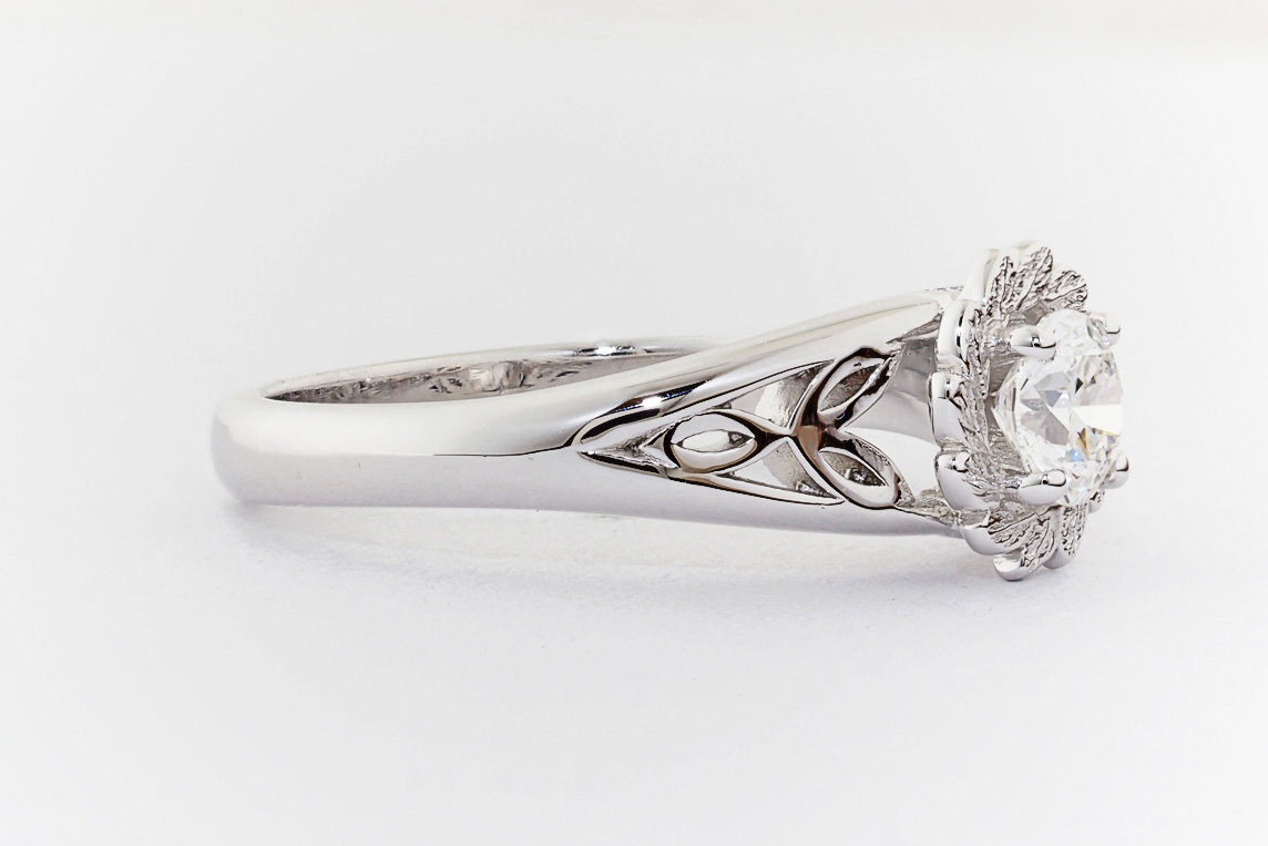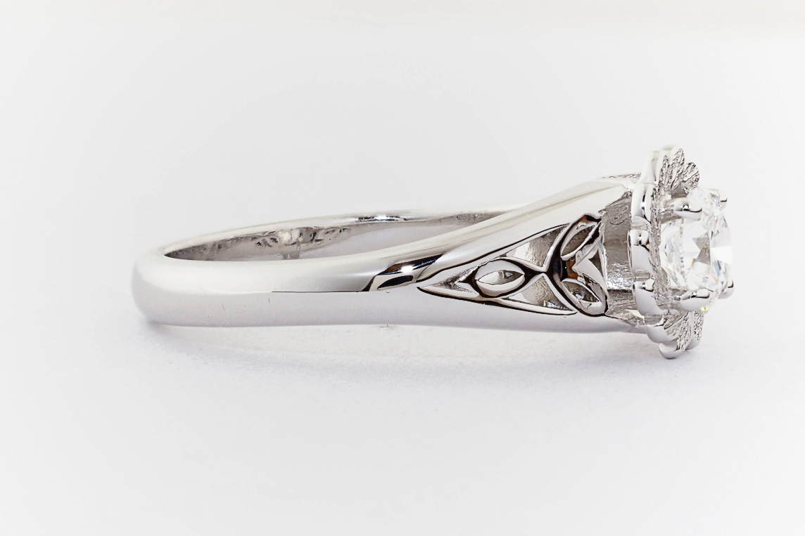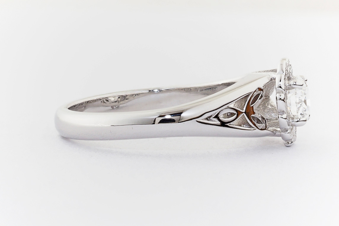 SKU: 22529 Category: Custom Engagement Rings Tags: 0.50ct, 0.53ct, 0.55ct, Celtic, halo, leaf, pattern, white gold