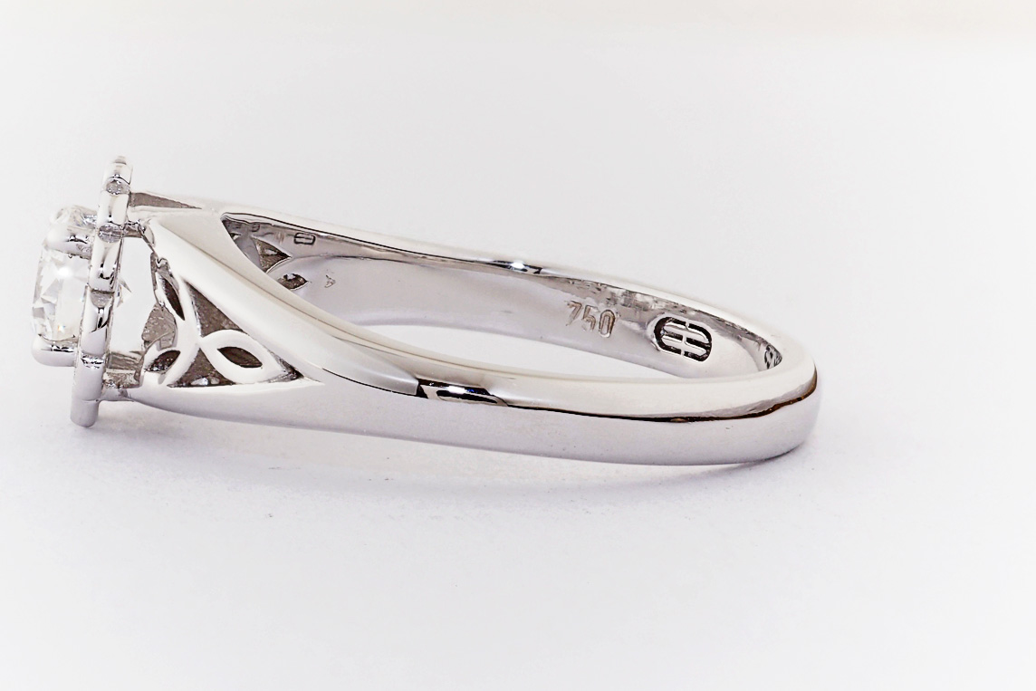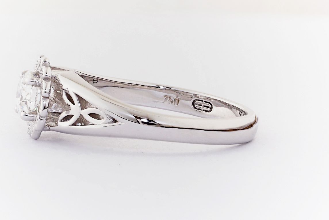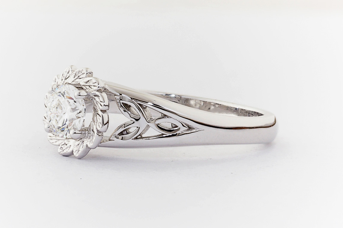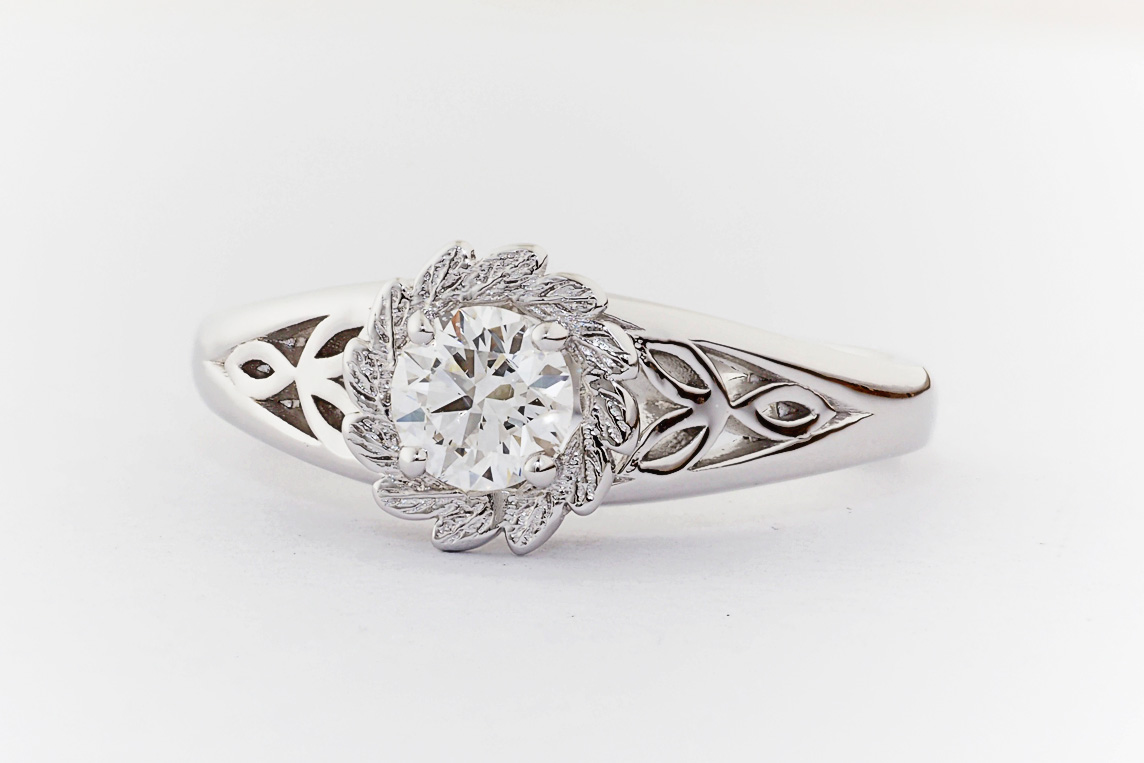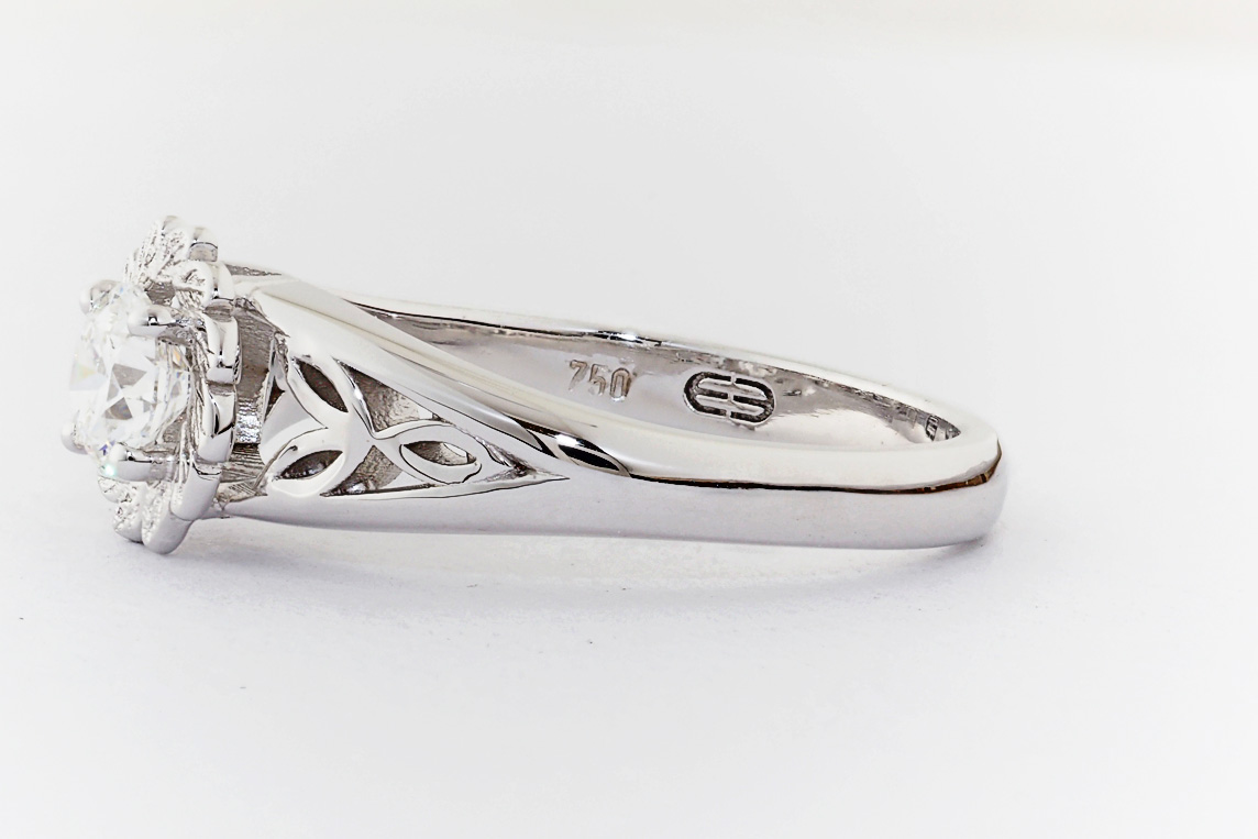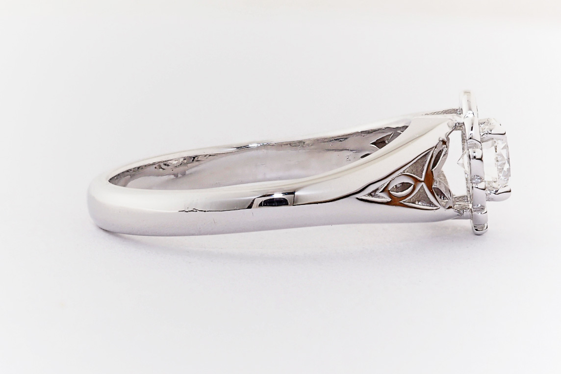 SKU: 22529 Category: Custom Engagement Rings Tags: 0.50ct, 0.53ct, 0.55ct, Celtic, halo, leaf, pattern, white gold