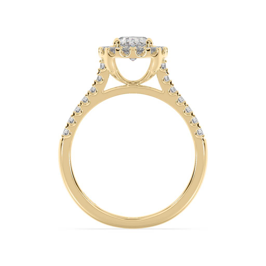 Oval cut diamond shared claw basket style halo engagement ring