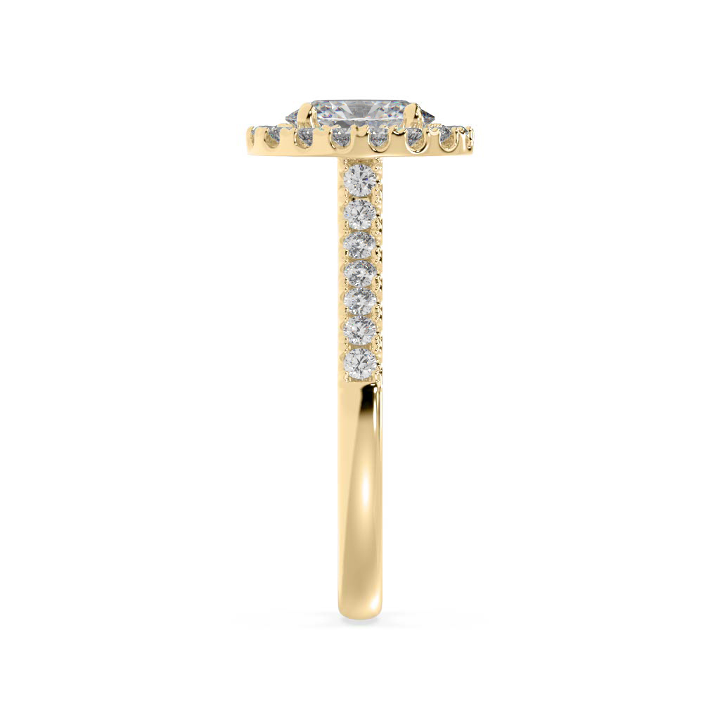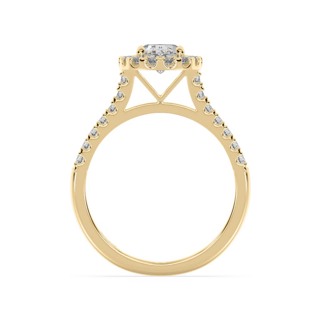 \n Oval diamond (1.00ct shown)\n 16 x 0.015ct round brilliant cut diamonds shared claw set into halo\n Total halo diamond weight = 0.24ct\n (based on 1.0ct centre diamond as shown, not including centre diamond)\n 14 x 0.015ct round brilliant cut diamonds, shared claw set into shoulders\n Total shoulders diamond weight = 0.21ct\n Vee style halo supports\n Half round band profile\n 2.20mm wide band\n