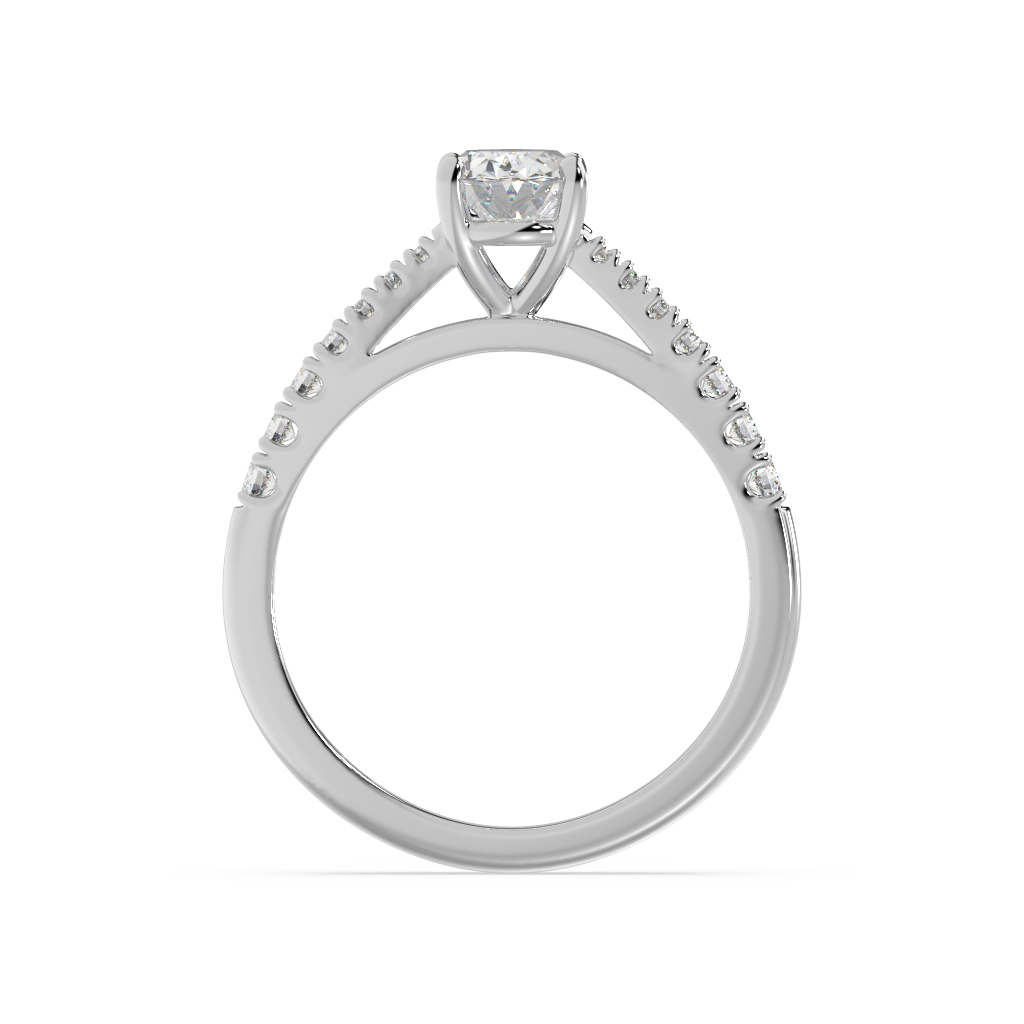 \n Oval cut centre diamond (1.00ct shown)\n 4 claw setting\n 14 x 0.015ct round brilliant cut diamonds\n Split shared claw set into shoulders\n Total diamond weight = 0.21ct\n Under rail style band\n High dome band profile\n 2.20mm wide band\n