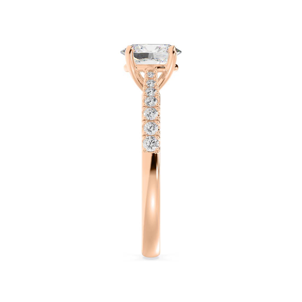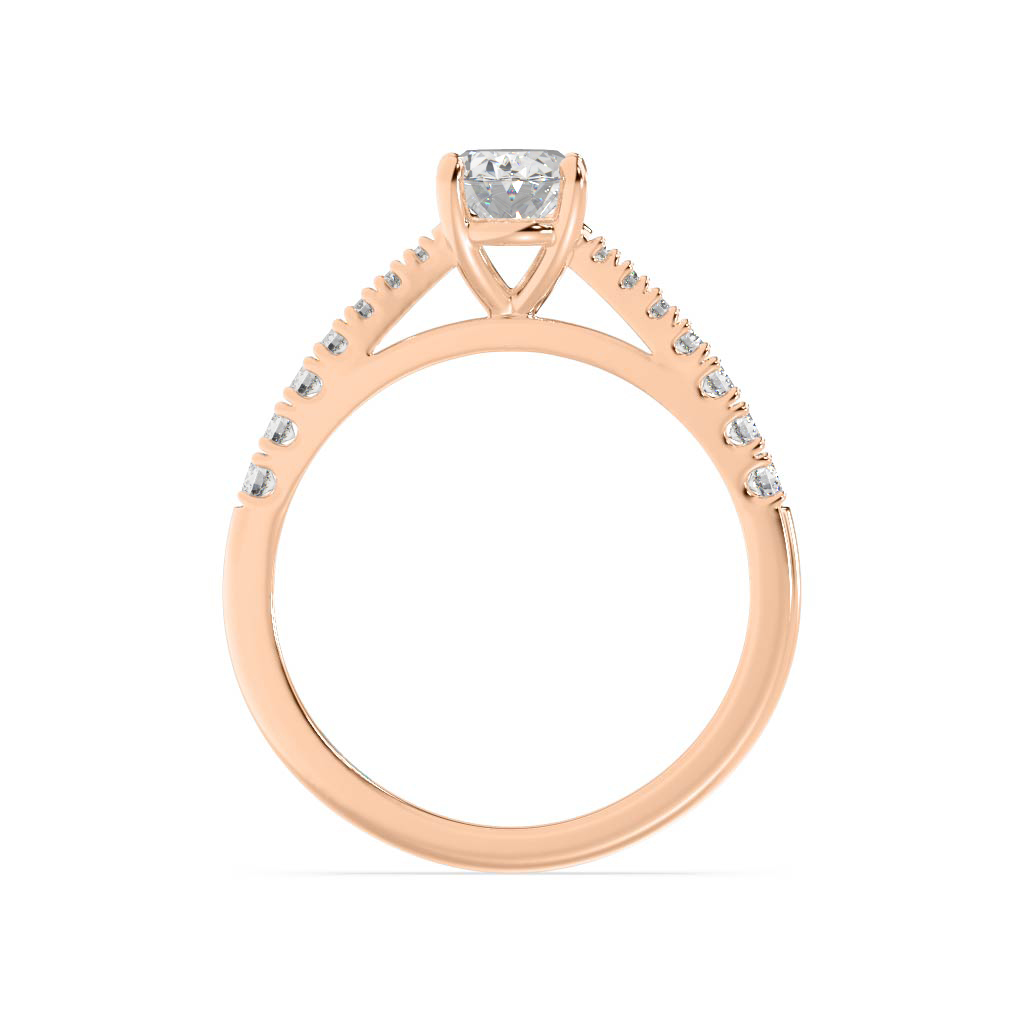\n Oval cut centre diamond (1.00ct shown)\n 4 claw setting\n 14 x 0.015ct round brilliant cut diamonds\n Split shared claw set into shoulders\n Total diamond weight = 0.21ct\n Under rail style band\n High dome band profile\n 2.20mm wide band\n