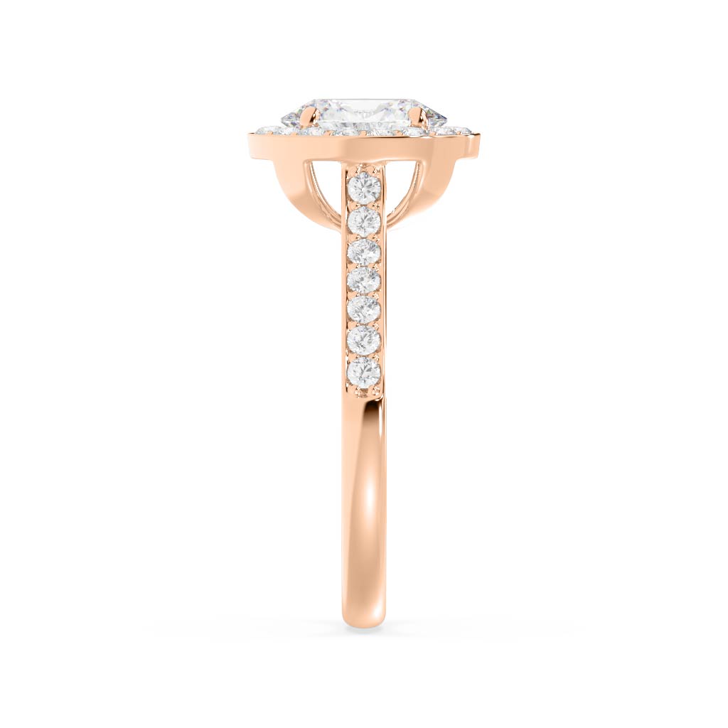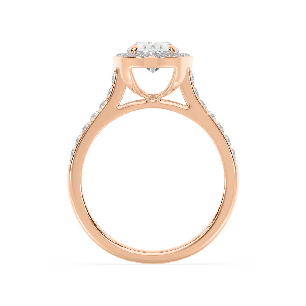 \n Oval cut diamond (1.00ct shown)\n 16 x 0.015ct round brilliant cut diamonds bead set into halo\nTotal diamond weight = 0.24ct\n(based on 1.0ct centre diamond as shown, not including centre diamond)\n 14 x 0.015ct round brilliant cut diamonds bead set into shoulders\nTotal diamond weight = 0.21ct\n Basket style halo supports\n Half round band profile\n 2.20mm wide band\n