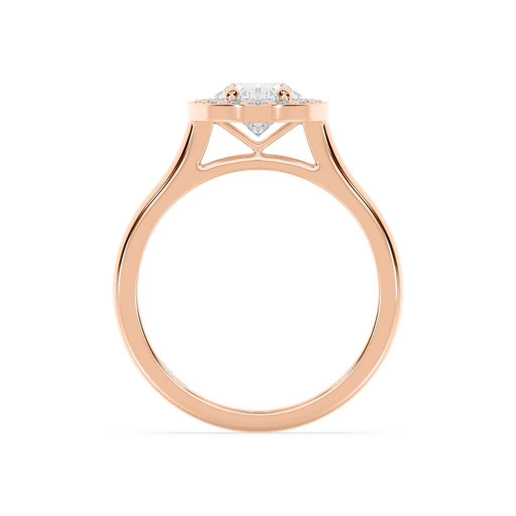 \n Oval diamond (1.00ct shown)\n 16 x 0.015ct round brilliant cut diamonds bead set into halo\n Total diamond weight = 0.24ct\n (based on 1.0ct centre diamond as shown, not including centre diamond)\n Vee style halo supports\n Half round band profile\n 2.20mm wide band\n