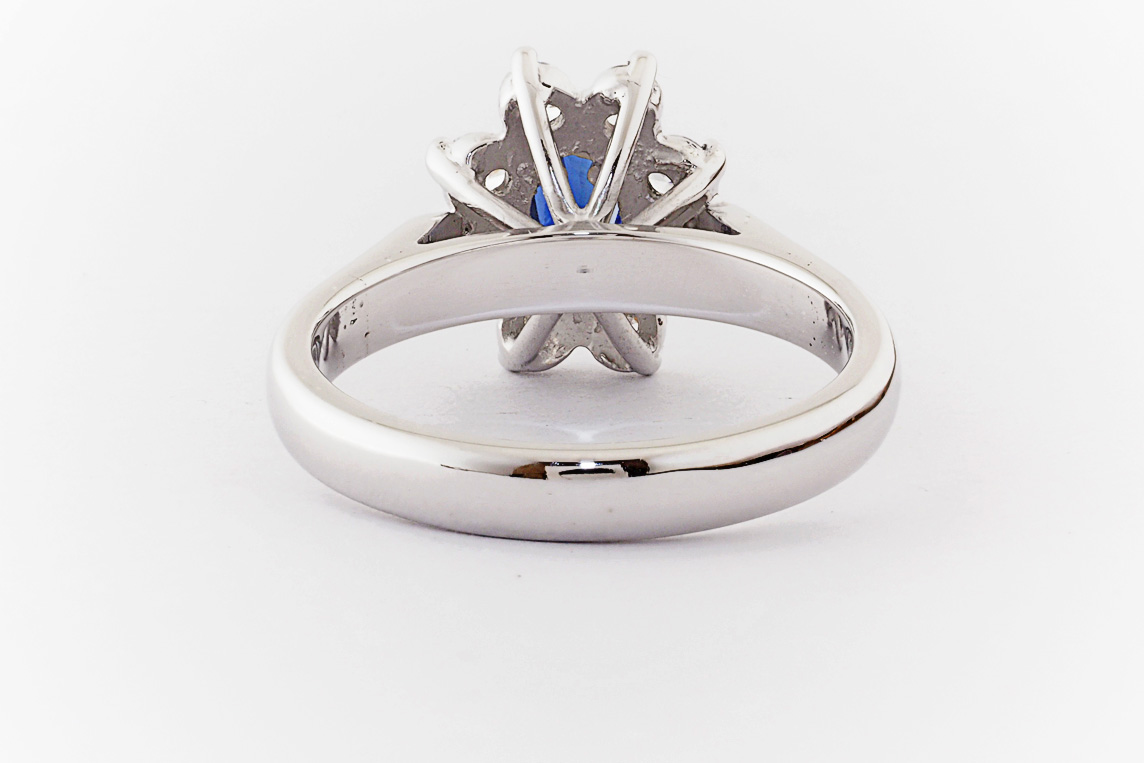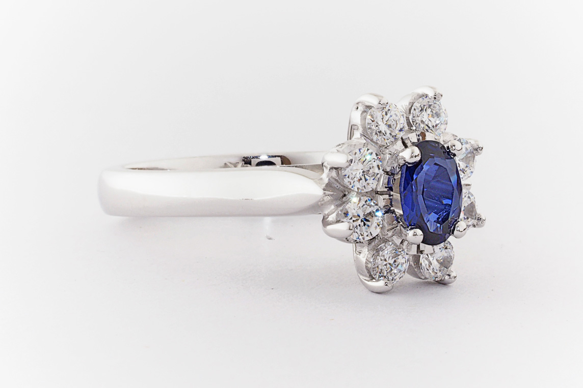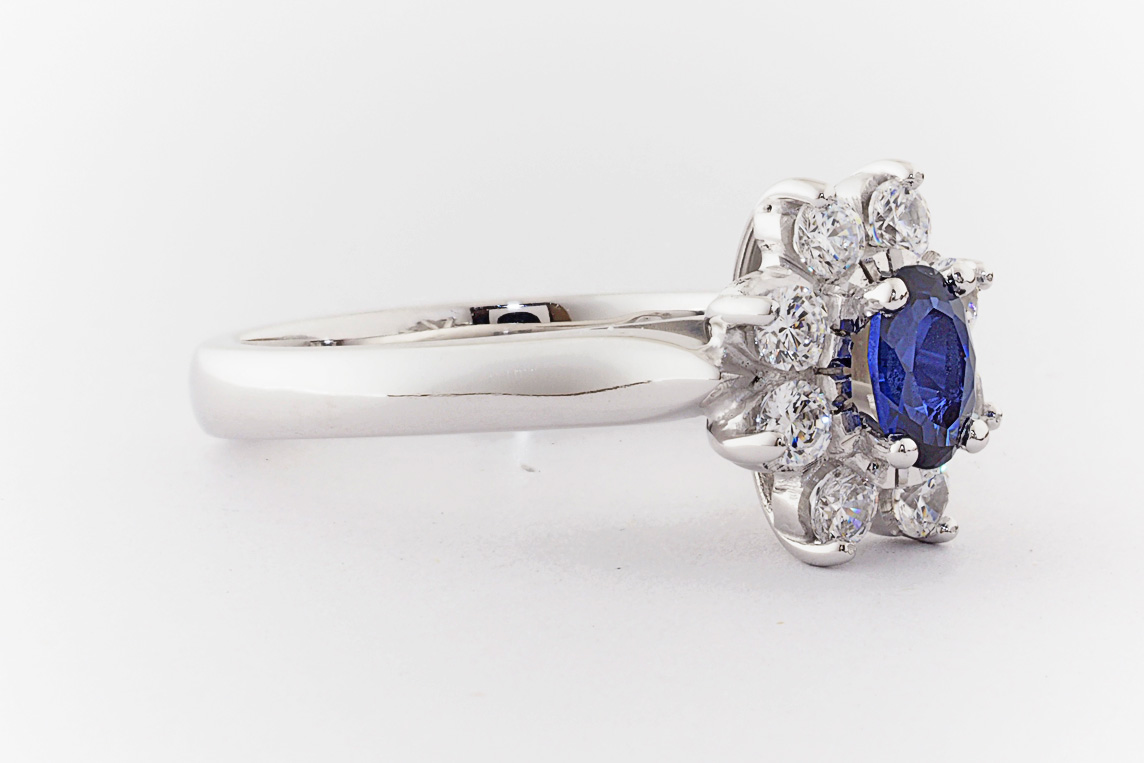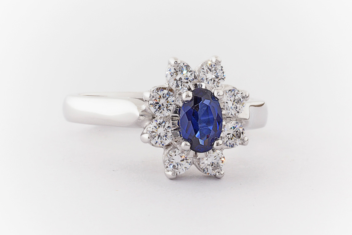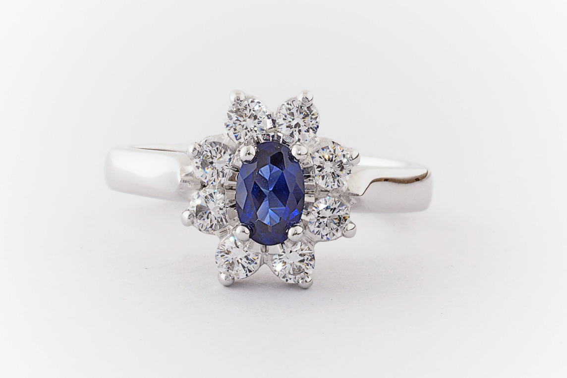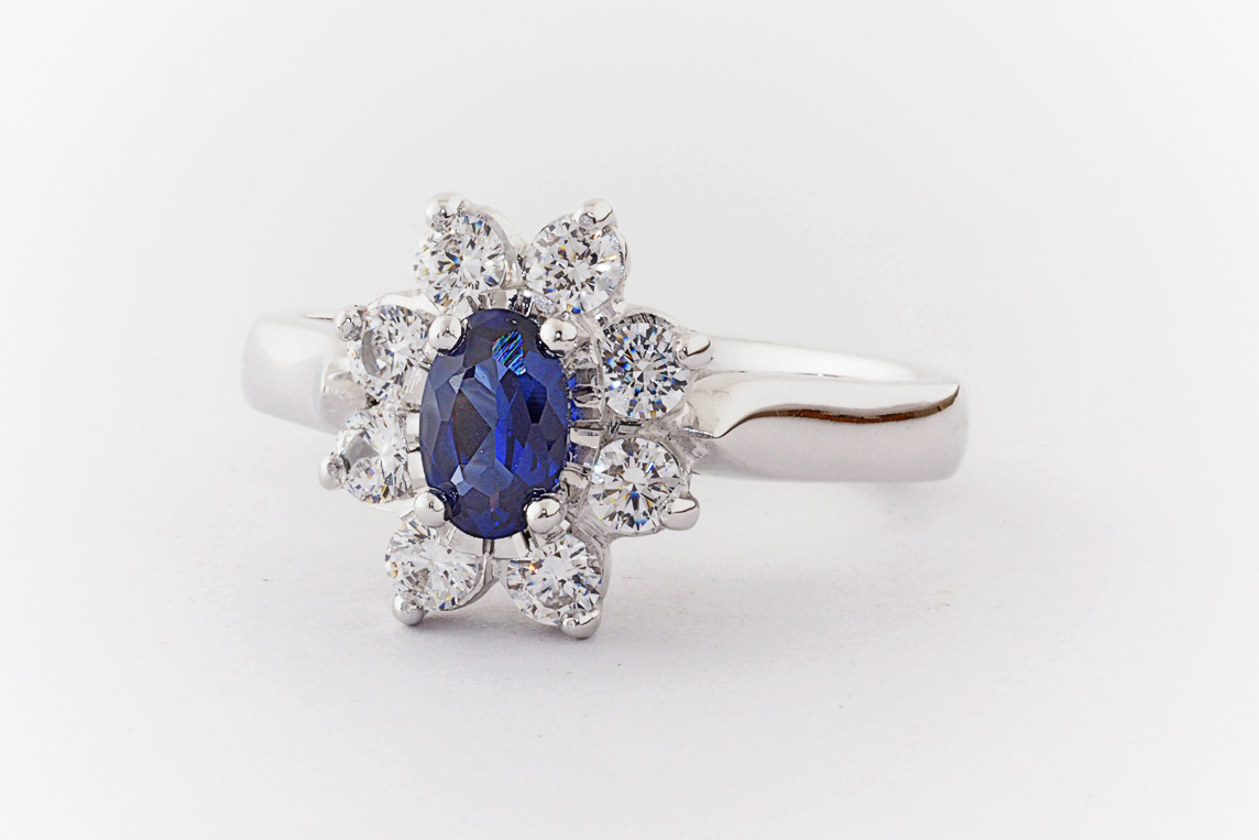 Oval sapphire and diamond halo dress ring