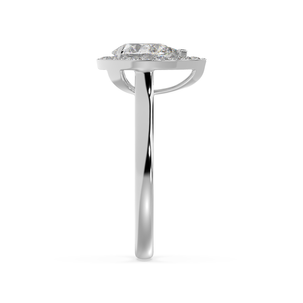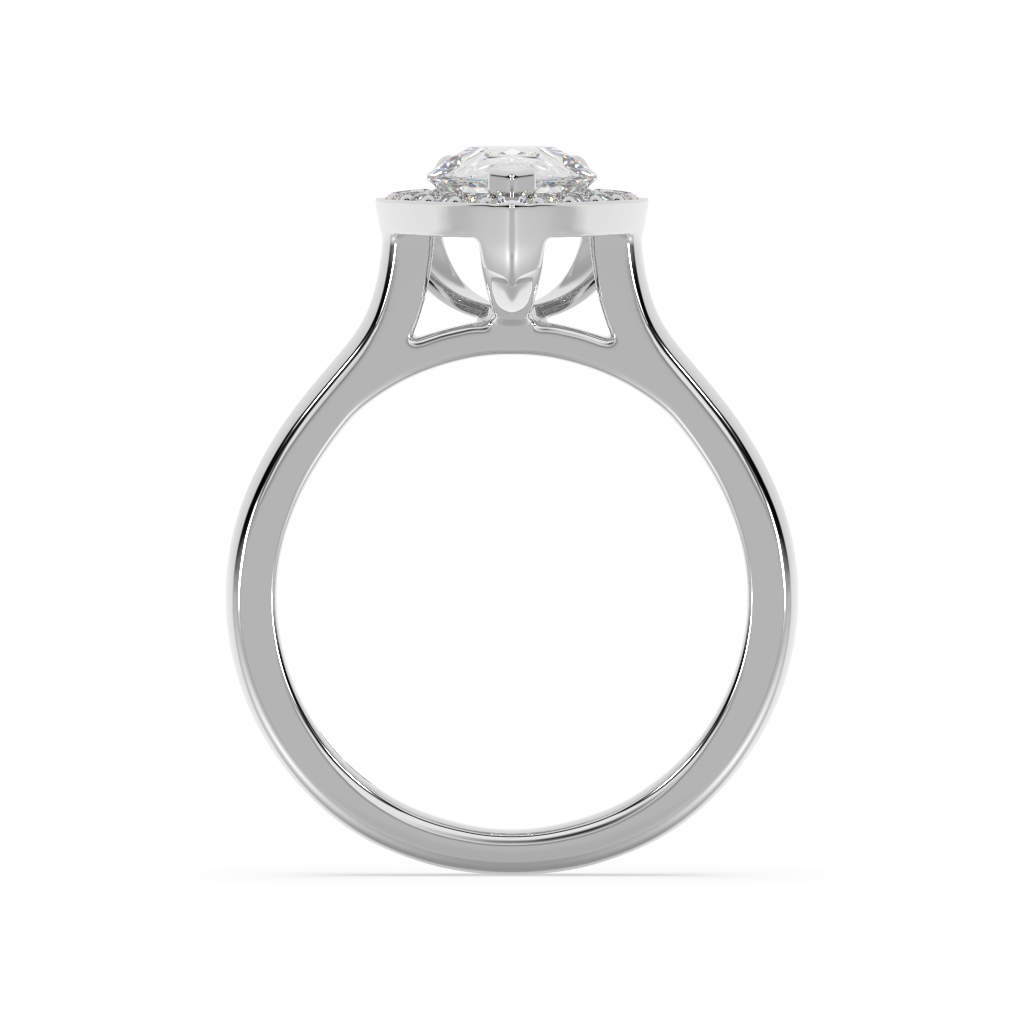 \n Pear shape diamond (1.00ct shown)\n 17 x 0.015ct round brilliant cut diamonds bead set into halo\n Total diamond weight = 0.25ct\n (based on 1.0ct centre diamond as shown, not including centre diamond)\n Basket style halo supports\n Half round band profile\n 2.20mm wide band\n