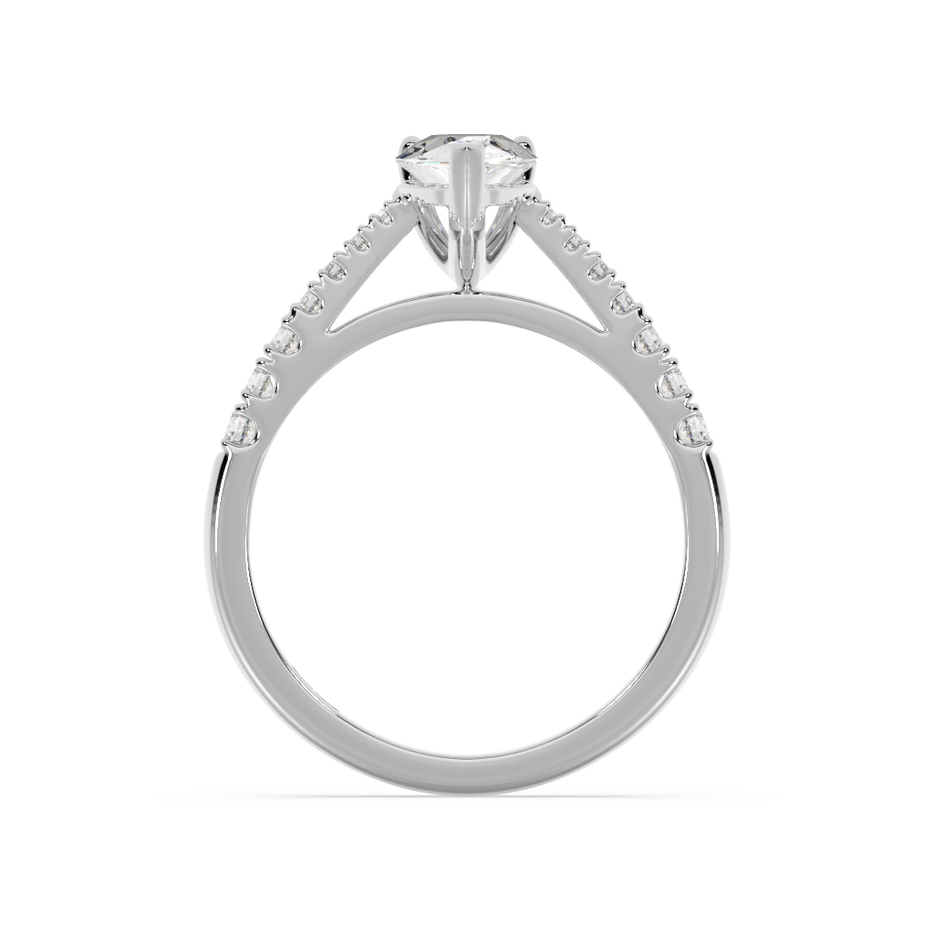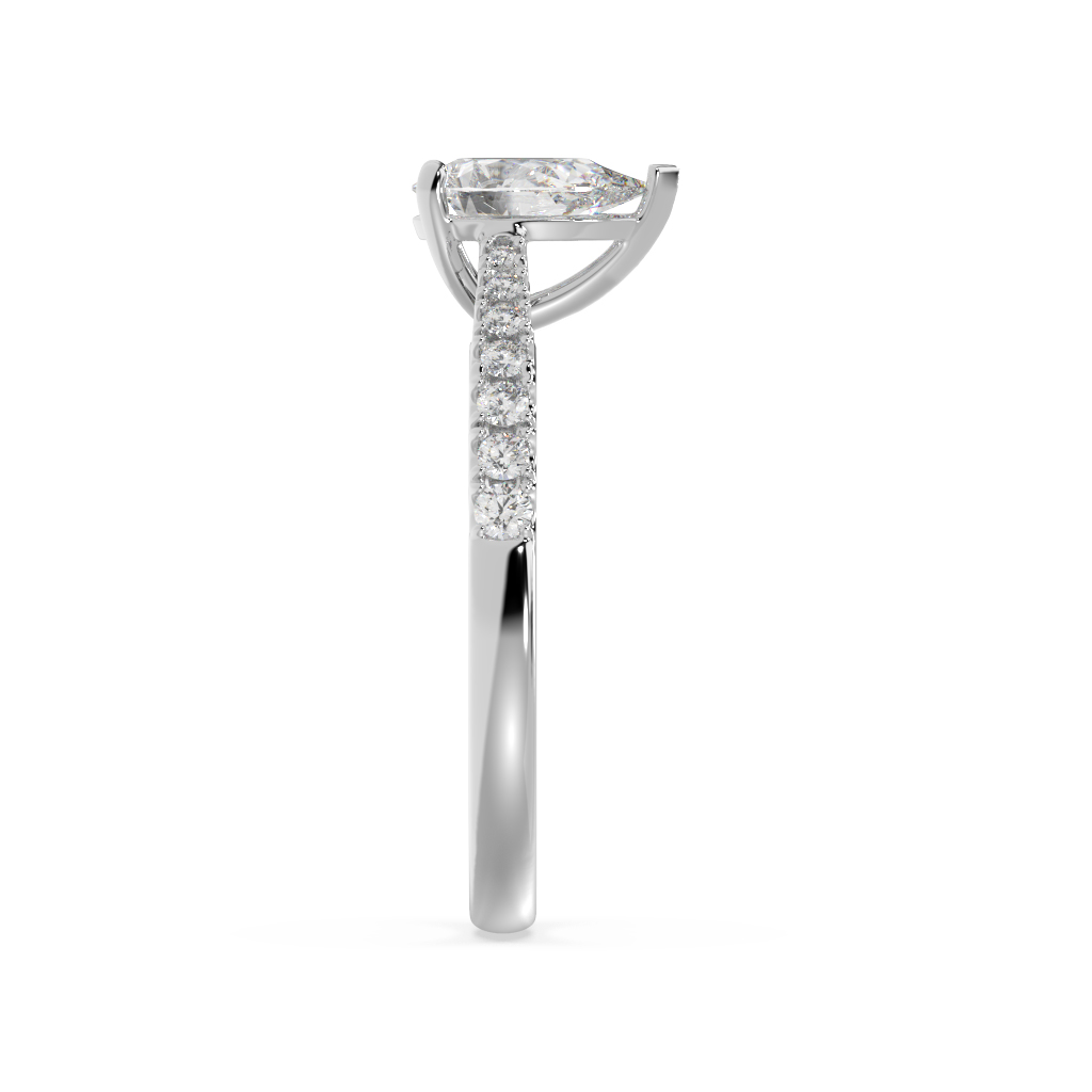 \n Pear shape centre diamond (1.00ct shown)\n Cap and claw setting\n 14 x 0.015ct round brilliant cut diamonds\n Split shared claw set into shoulders\n Total diamond weight = 0.21ct\n Under rail style band\n High dome band profile\n 2.20mm wide band\n