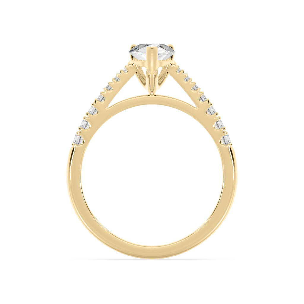 \n Pear shape centre diamond (1.00ct shown)\n Cap and claw setting\n 14 round brilliant cut diamonds (6x0.21ct, 4x0.015ct, 2x0.01ct, 2x0.008ct)\n Split shared claw set into shoulders\n Total diamond weight = 0.21ct\n Under rail style band\n High dome band profile\n 2.20mm wide band\n