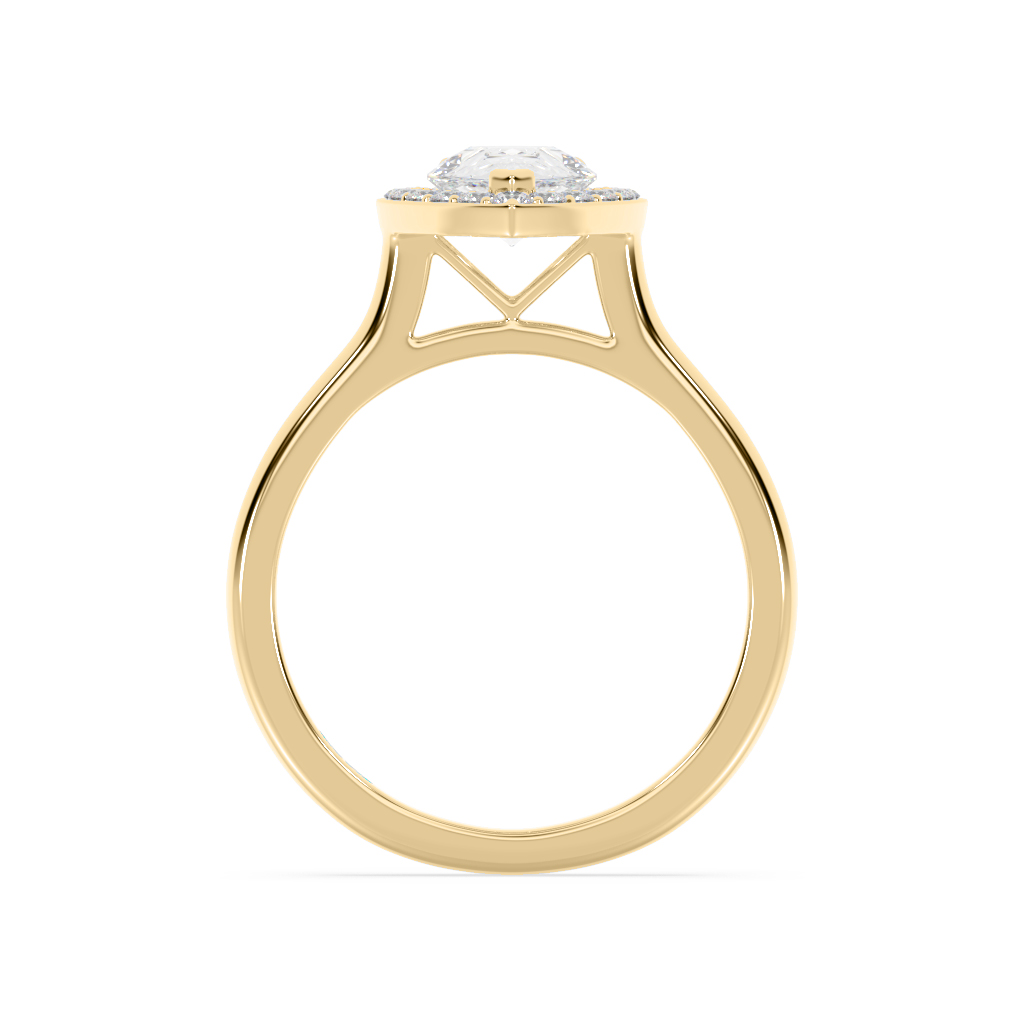 Pear shape diamond vee style halo engagement ring