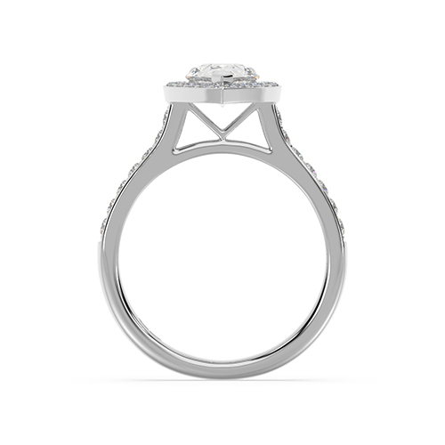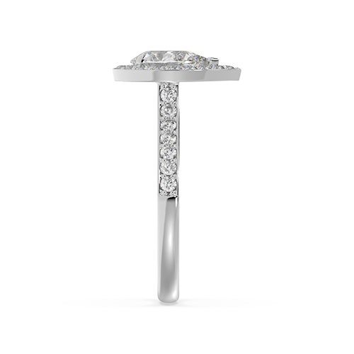 \n Pear shape diamond (1.00ct shown)\n 17 x 0.015ct round brilliant cut diamonds bead set into halo\nTotal diamond weight = 0.25ct\n(based on 1.0ct centre diamond as shown, not including centre diamond)\n 14 x 0.015ct round brilliant cut diamonds bead set into shoulders\nTotal diamond weight = 0.21ct\n Vee style halo supports\n Half round band profile\n 2.20mm wide band\n