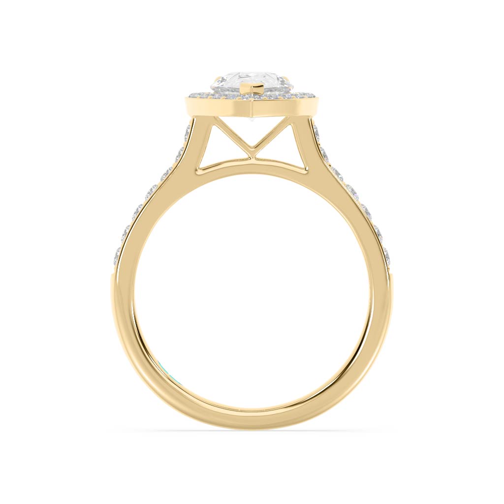 \n Pear shape diamond (1.00ct shown)\n 17 x 0.015ct round brilliant cut diamonds bead set into halo\nTotal diamond weight = 0.25ct\n(based on 1.0ct centre diamond as shown, not including centre diamond)\n 14 x 0.015ct round brilliant cut diamonds bead set into shoulders\nTotal diamond weight = 0.21ct\n Vee style halo supports\n Half round band profile\n 2.20mm wide band\n