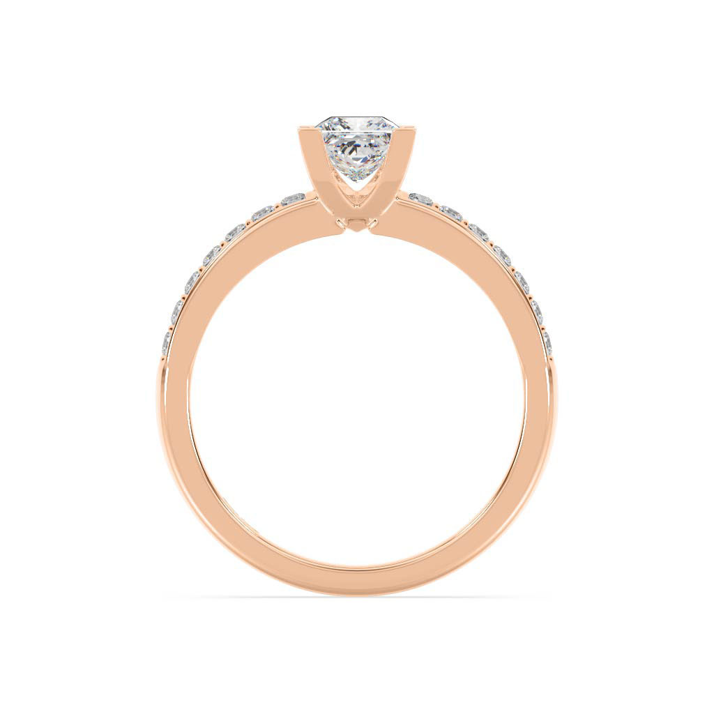 \n Princess cut centre diamond (1.00ct shown)\n 4 claw setting\n 14 x 0.015ct round brilliant cut diamonds, bead set into shoulders\n Total diamond weight = 0.21ct\n High dome band profile\n 2.20mm wide band\n