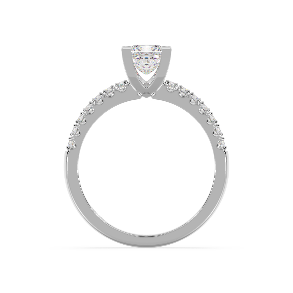 \n Princess cut centre diamond (1.00ct shown)\n 4 claw setting\n 14 x 0.015ct round brilliant cut diamonds\n Split shared claw set into shoulders\n Total diamond weight = 0.21ct\n High dome band profile\n 2.20mm wide band\n