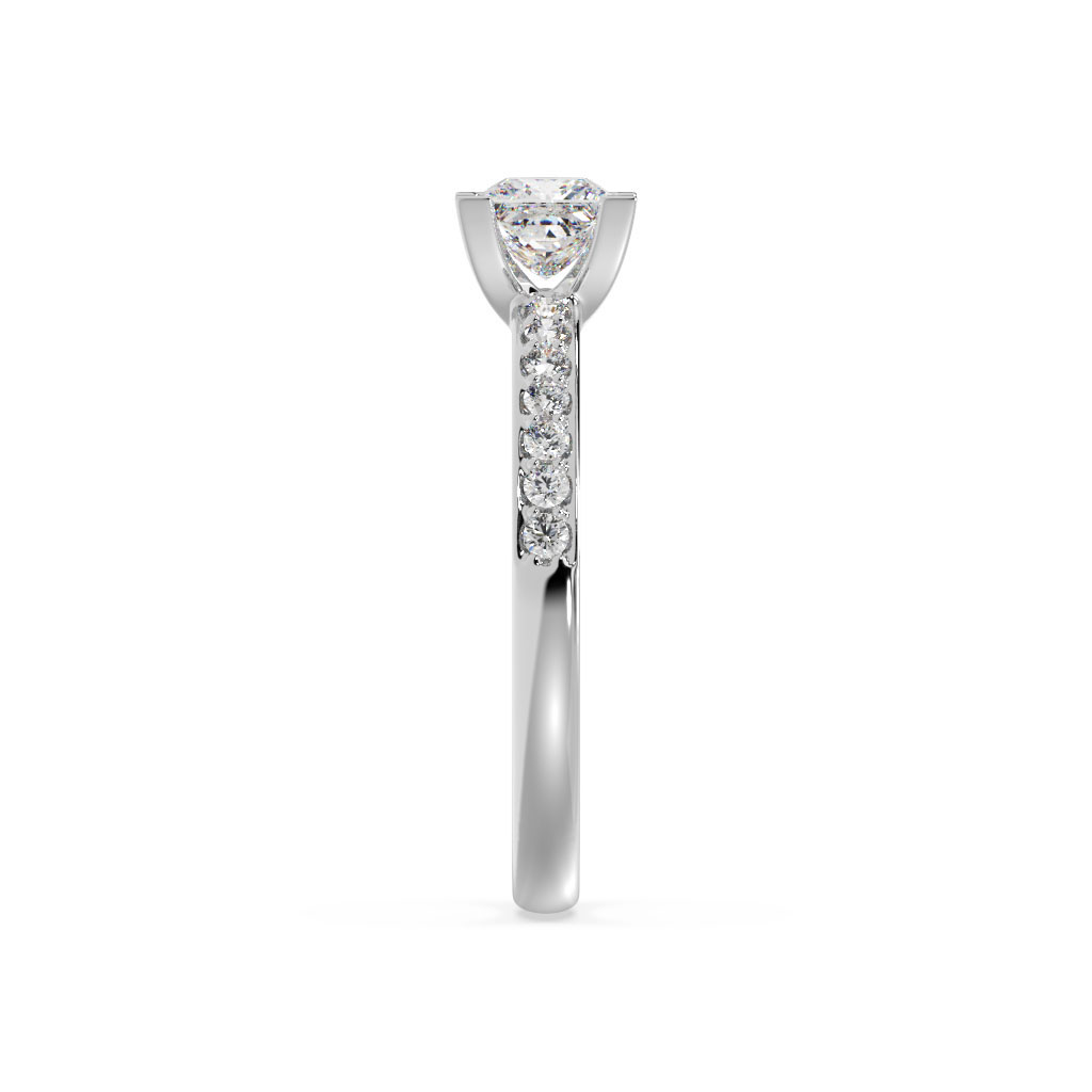 \n Princess cut centre diamond (1.00ct shown)\n 4 claw setting\n 14 x 0.015ct round brilliant cut diamonds\n Bead set into shoulders\n Total diamond weight = 0.21ct\n High dome band profile\n 2.20mm wide band\n