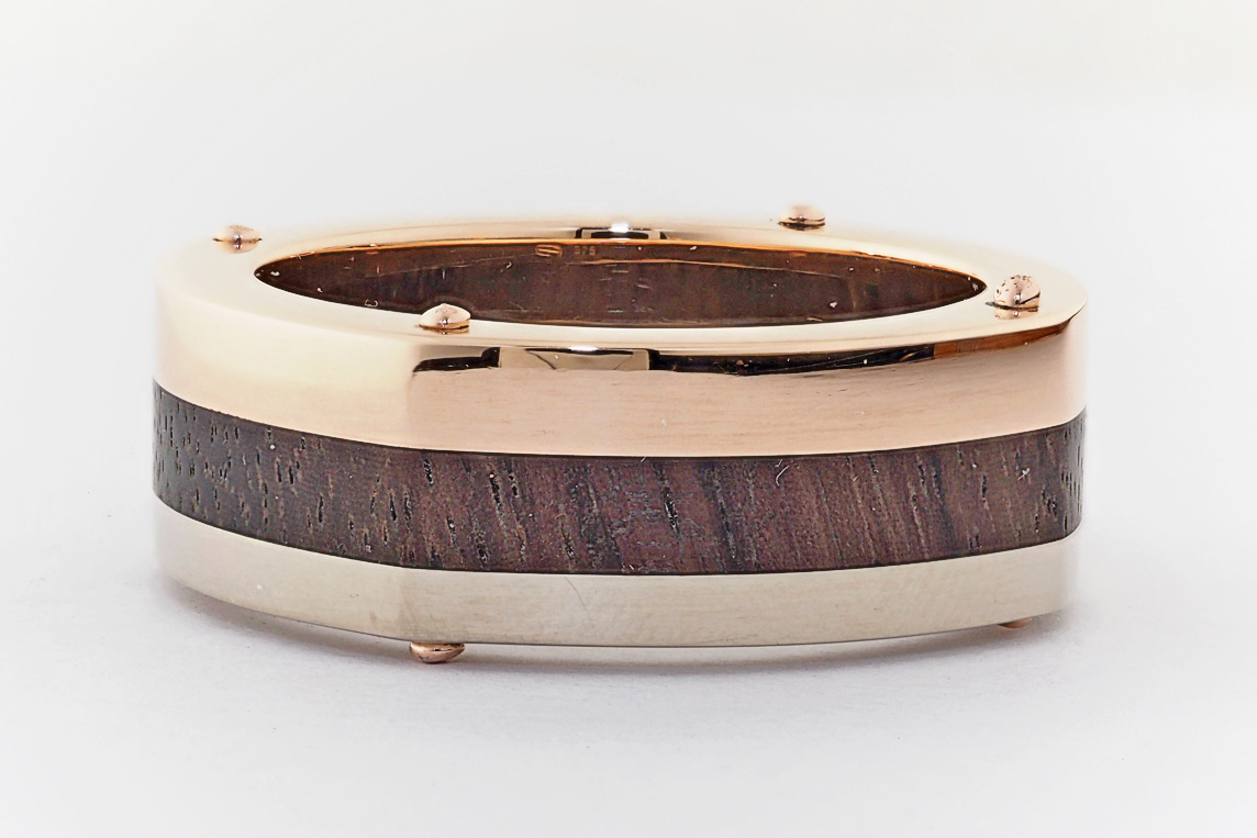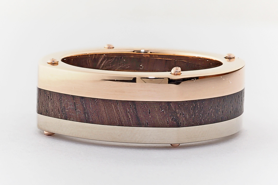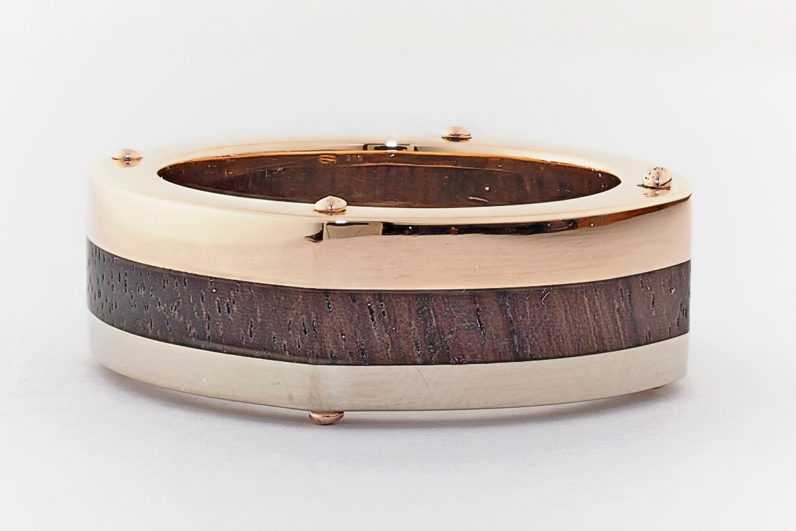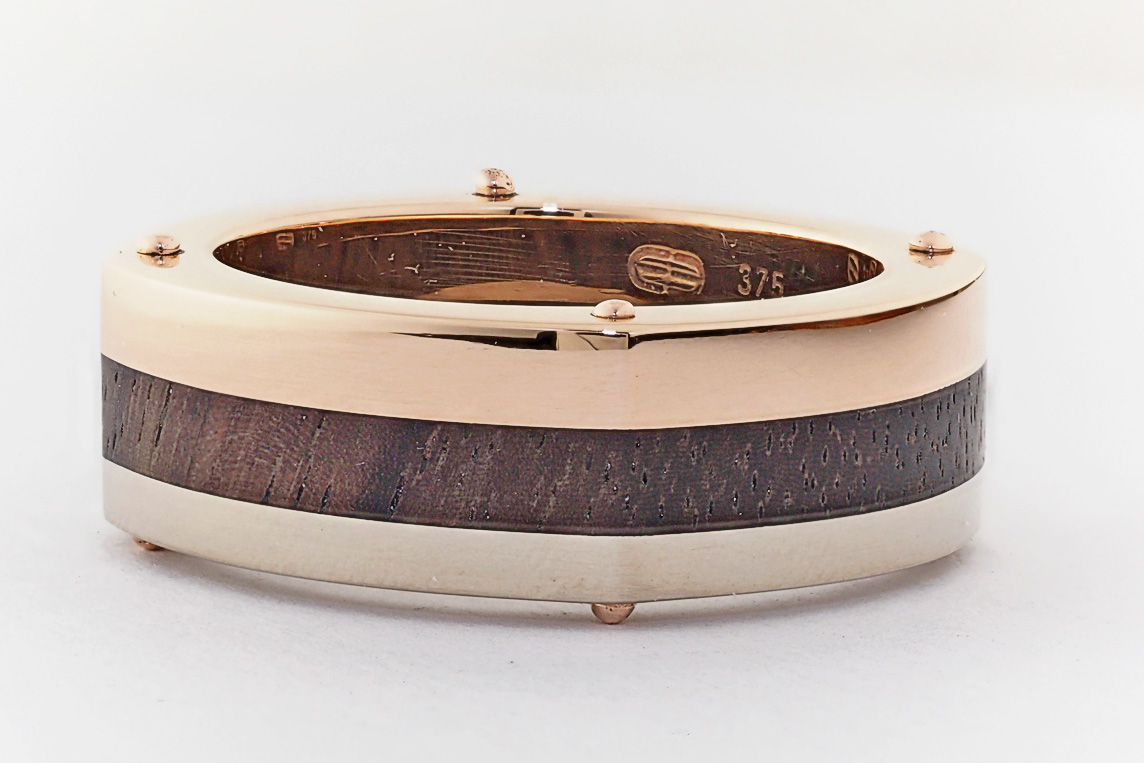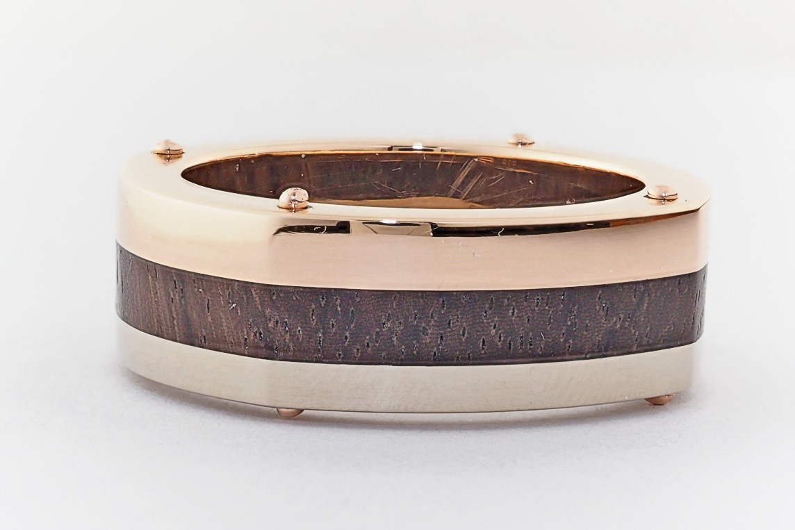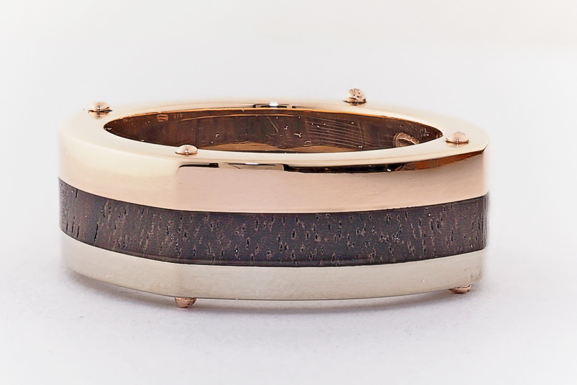 - 9ct rose gold, white gold and rosewood handmade gents wedding ring