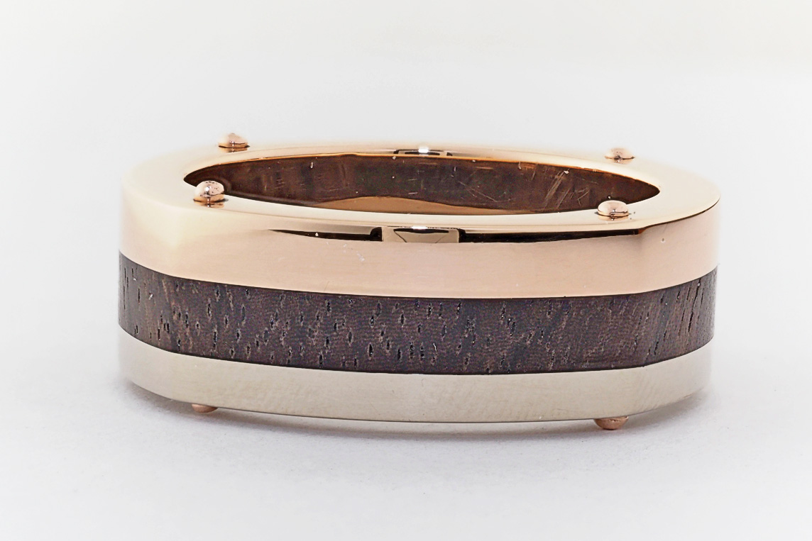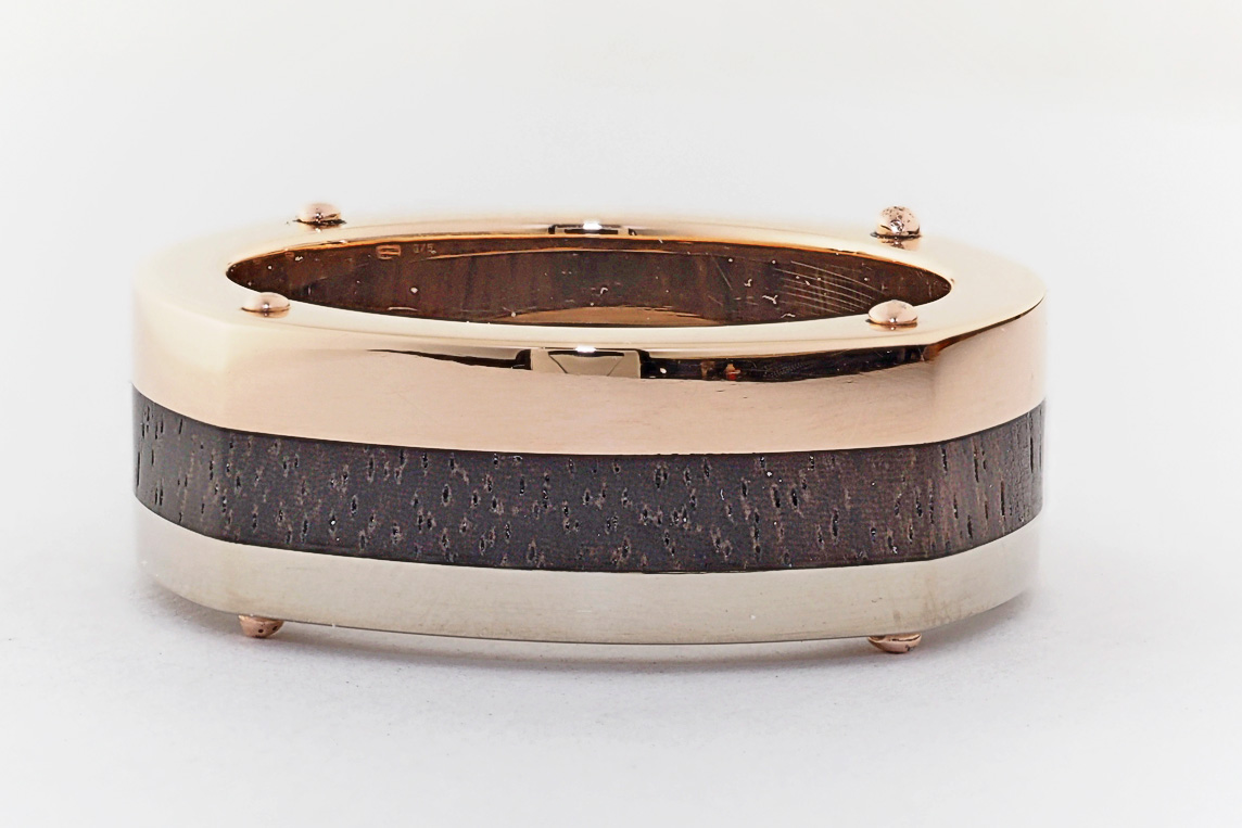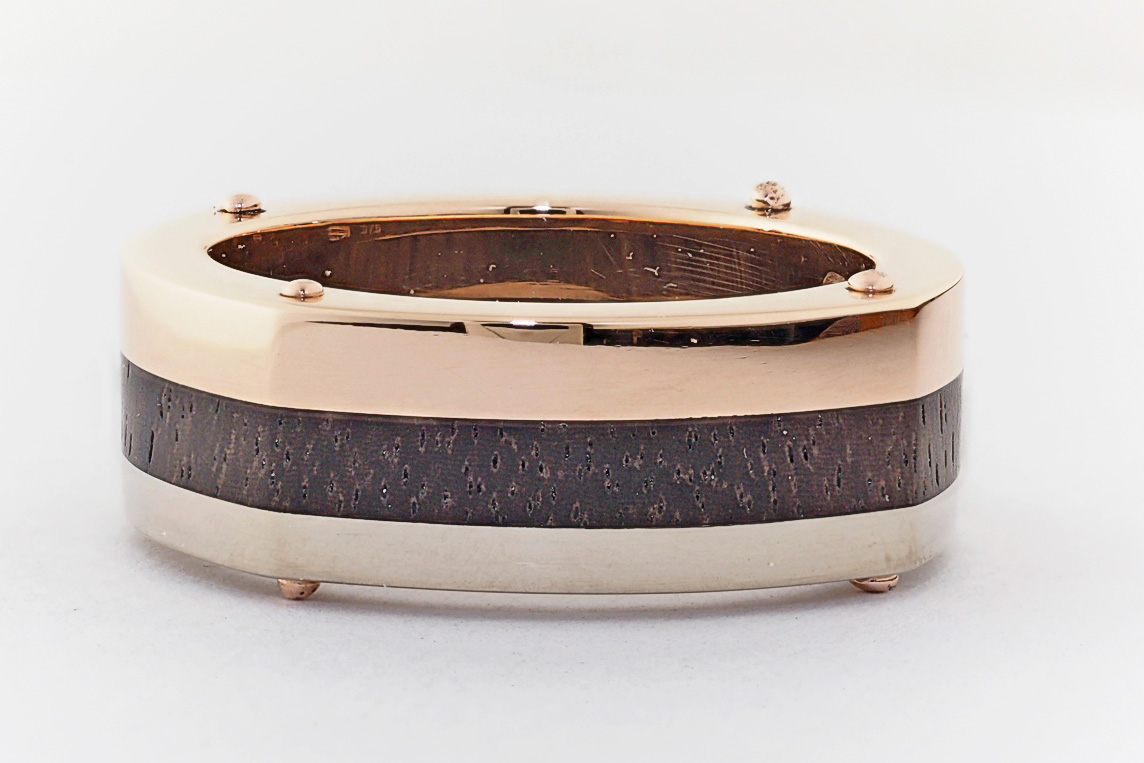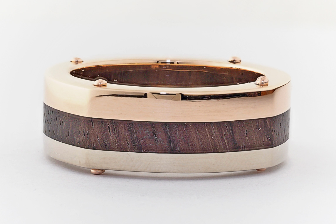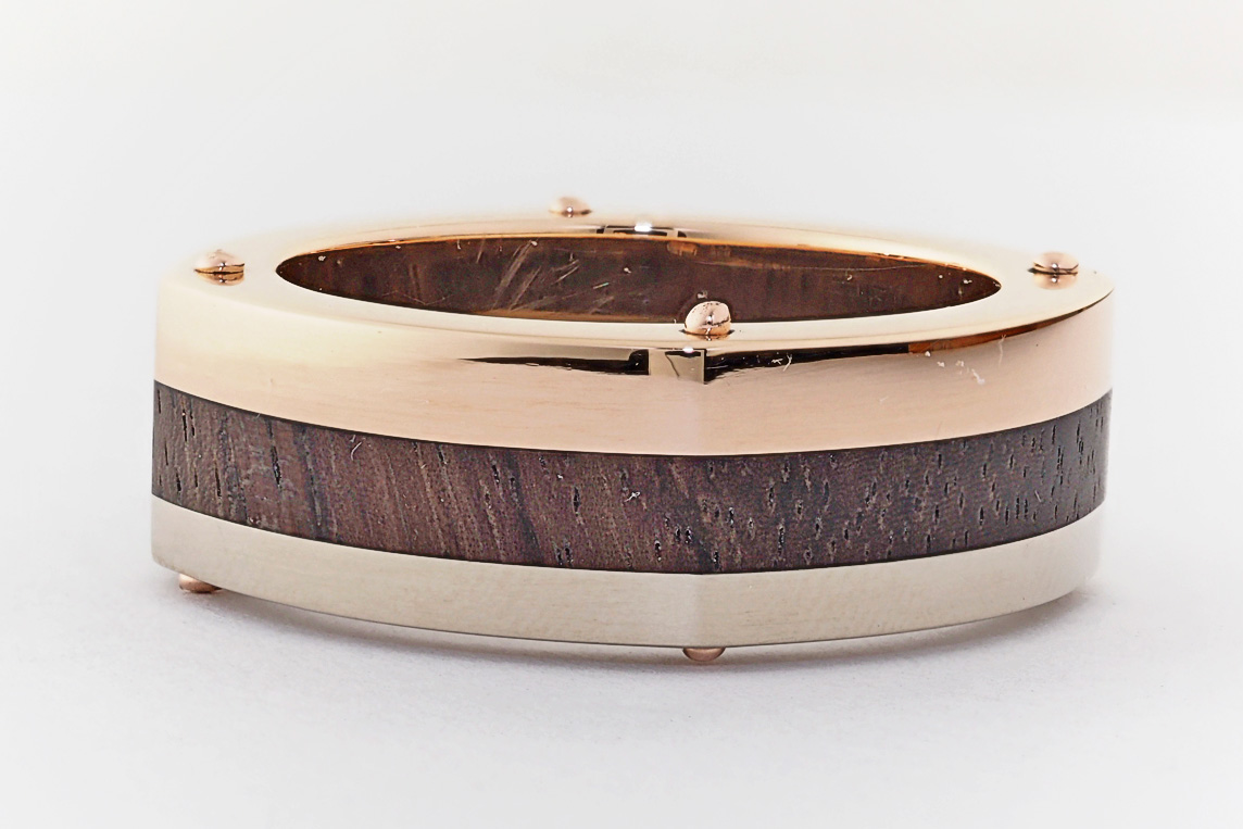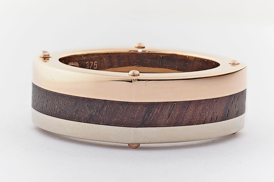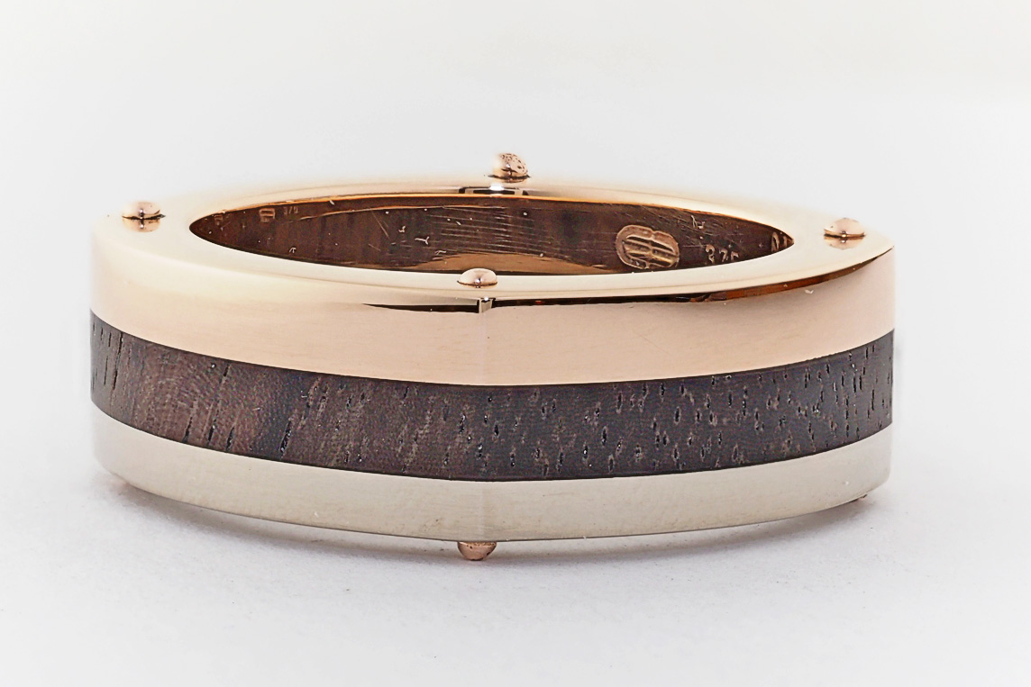 - 9ct rose gold, white gold and rosewood handmade gents wedding ring