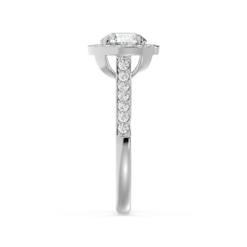 \n Round brilliant cut diamond (1.00ct shown)\n 16 x 0.015ct round brilliant cut diamonds bead set into halo\nTotal diamond weight = 0.24ct\n(based on 1.0ct centre diamond as shown, not including centre diamond)\n 14 x 0.015ct round brilliant cut diamonds bead set into shoulders\nTotal diamond weight = 0.21ct\n Basket style halo supports\n Half round band profile\n 2.20mm wide band\n