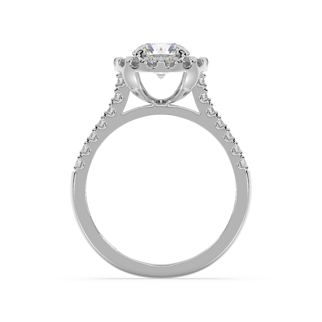 Round brilliant cut diamond shared claw halo engagement ring