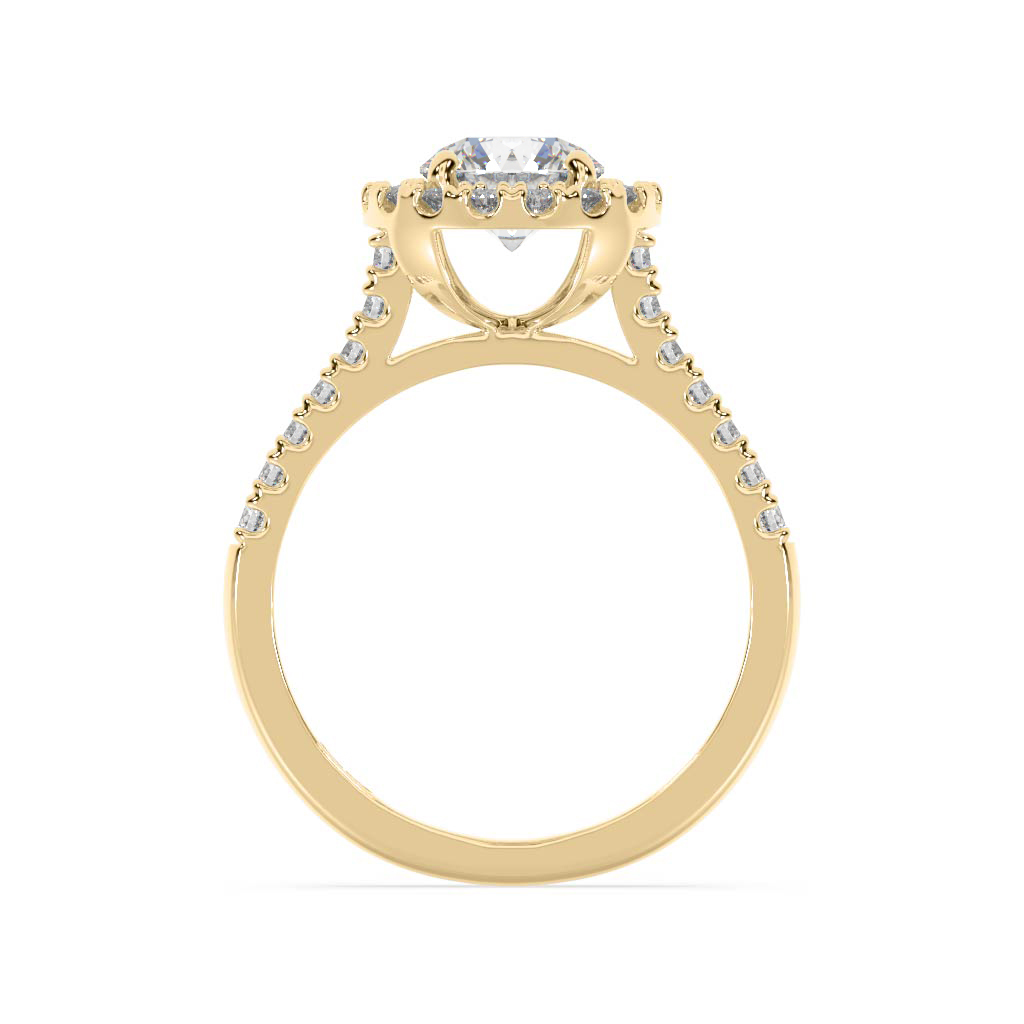 \n Round brilliant cut shape diamond (1.00ct shown)\n 16 x 0.015ct round brilliant cut diamonds shared claw set into halo\n Total halo diamond weight = 0.24ct\n (based on 1.0ct centre diamond as shown, not including centre diamond)\n 14 x 0.015ct round brilliant cut diamonds, shared claw set into shoulders\n Total shoulders diamond weight = 0.21ct\n Basket style halo supports\n Half round band profile\n 2.20mm wide band\n